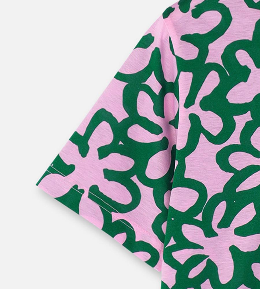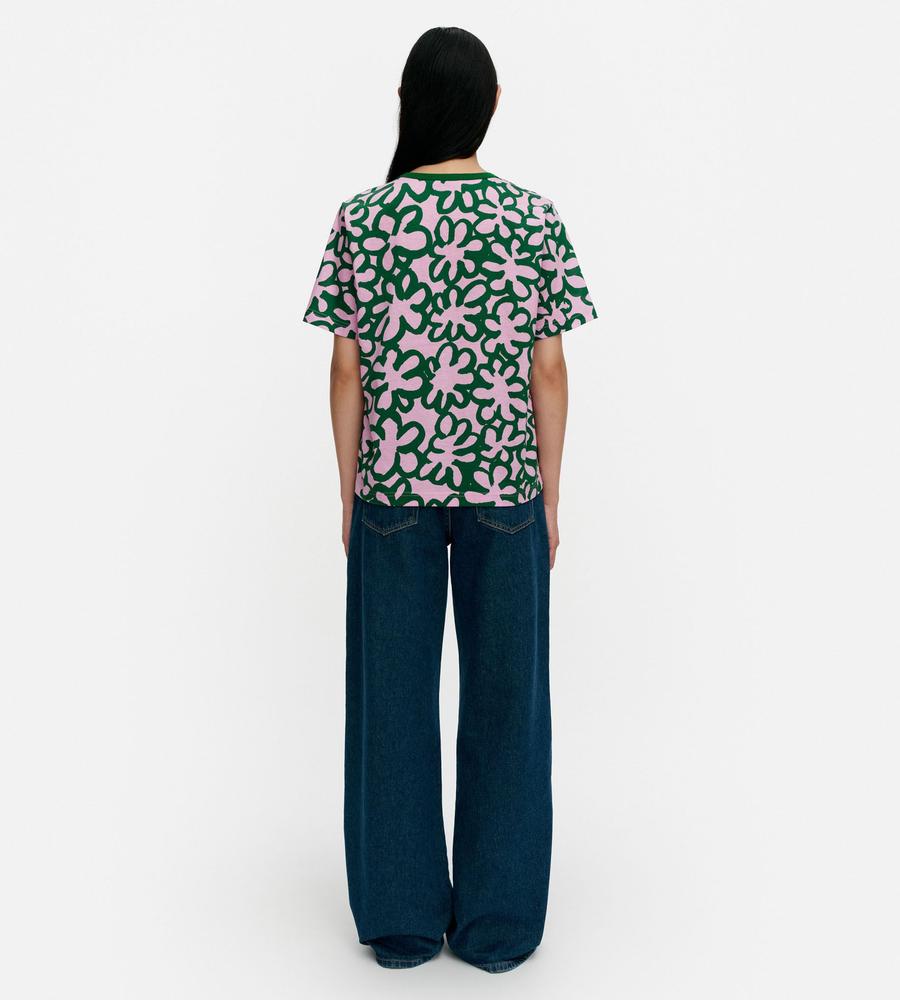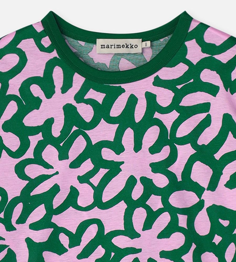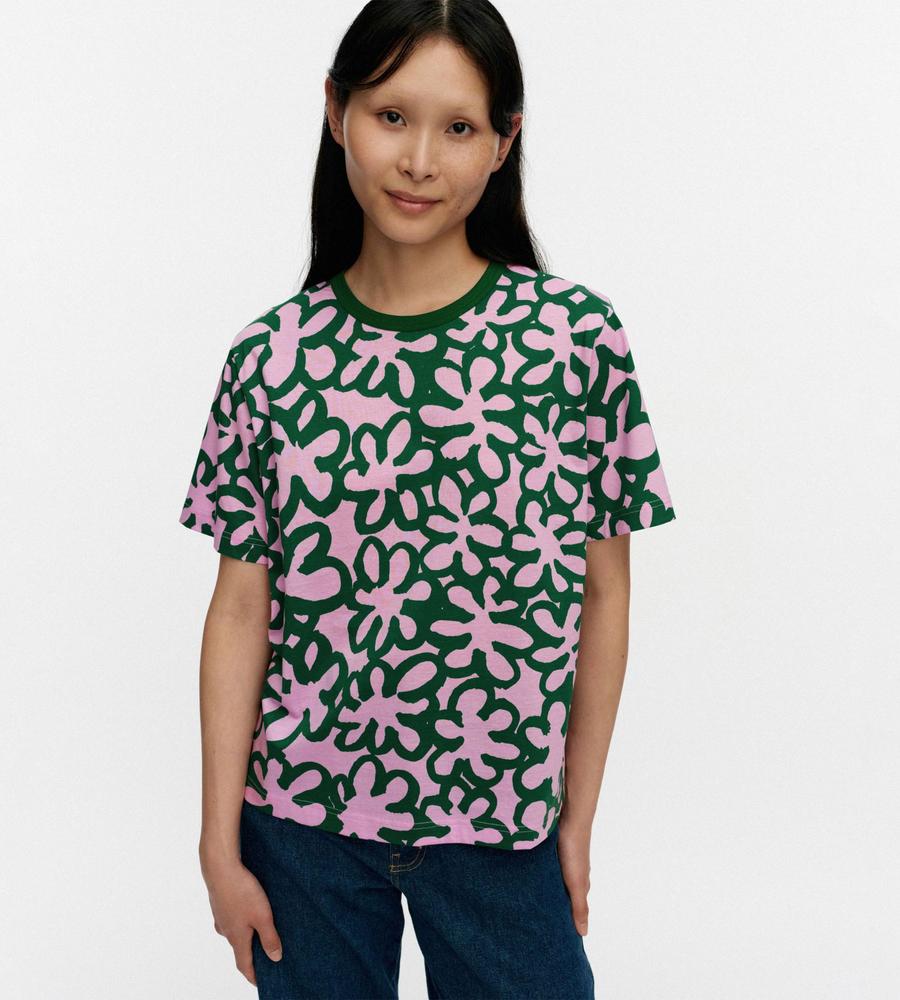 Annika Rimalaがデザインを担当した、「花」を意味するKukka(クッカ)柄のTシャツ。総柄プリントが絶大なインパクトを発揮します。襟元のトリミングが、全体の印象を引き締めているのが特徴的。単品ではもちろん、ジャケットやパーカなどを上に羽織っても十分存在感を主張してくれます。