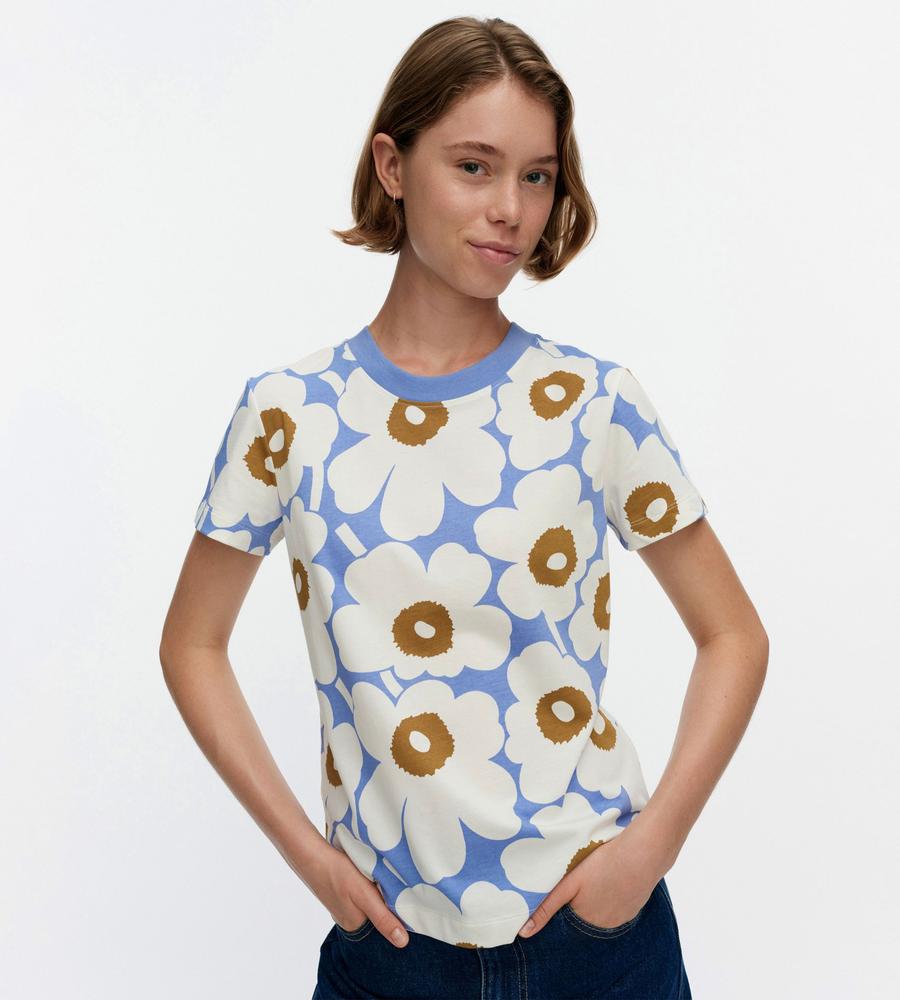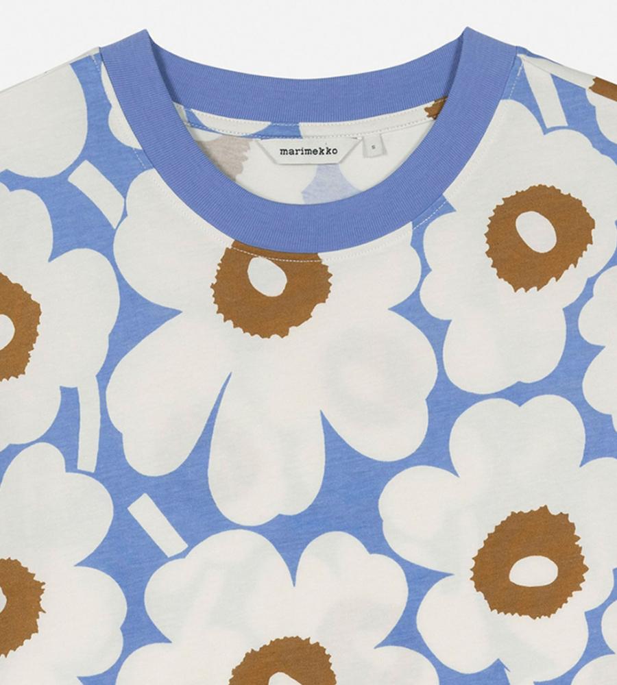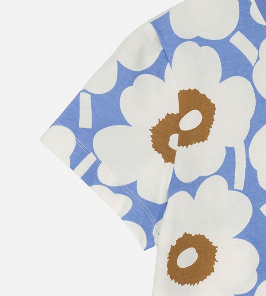 Marimekkoを代表するUnikko柄が華やかなデザインの半袖Tシャツ。スリムフィットなシルエットですっきりとした印象で着こなせます。リブ編みのクルーネックもアクセント。肌触りの良いコットン素材で仕立てた一枚。お手持ちのボトムに合わせて、春夏らしい明るいムードの着こなしが実現するアイテムです。
