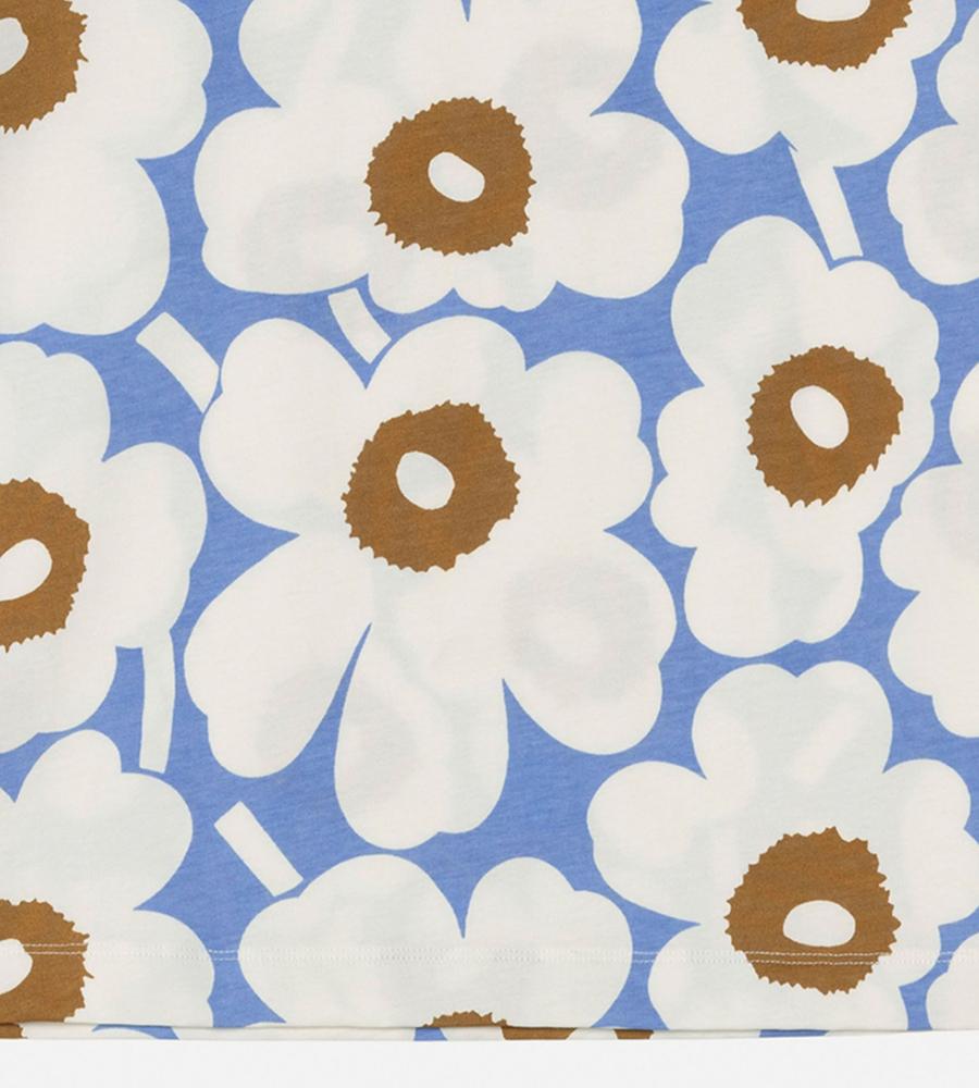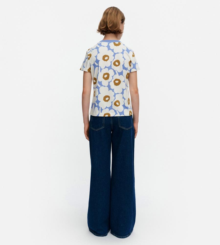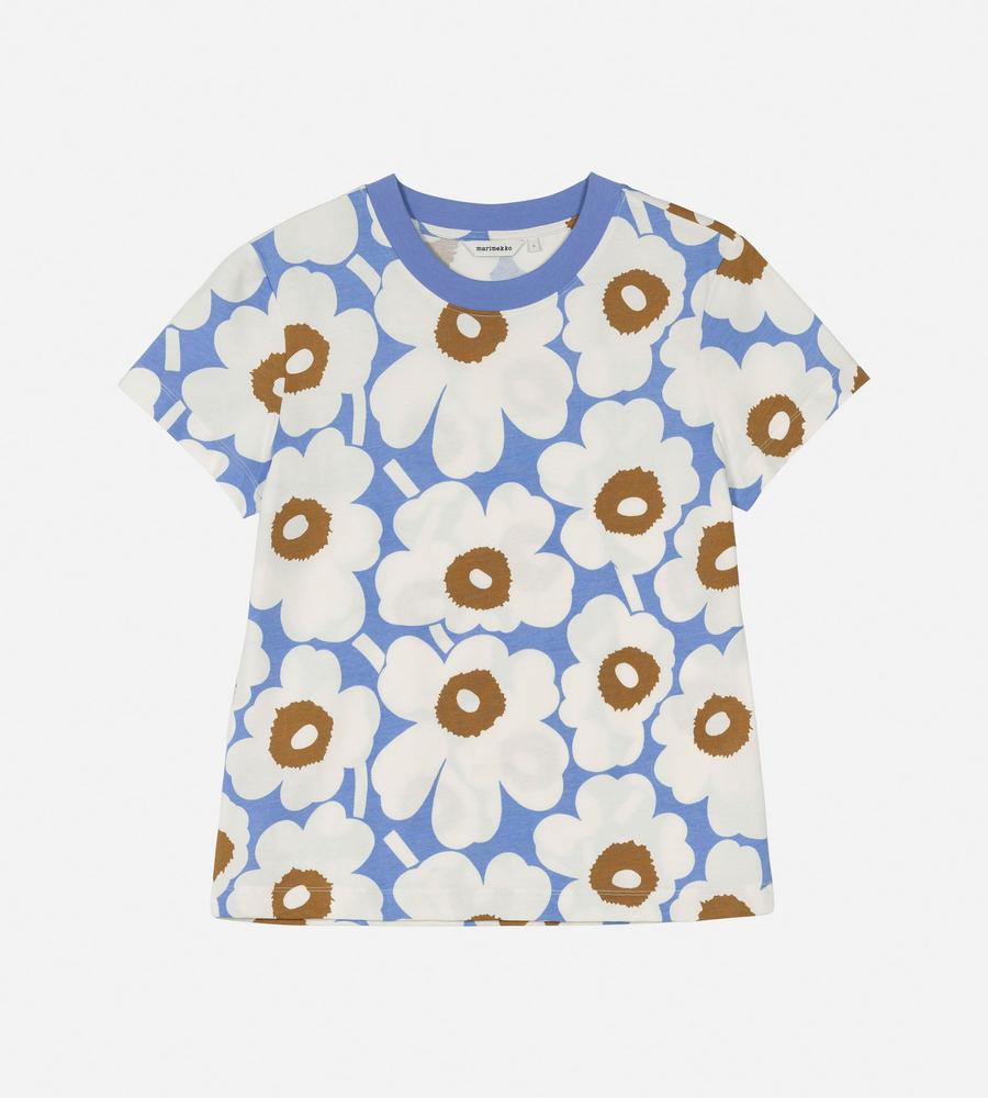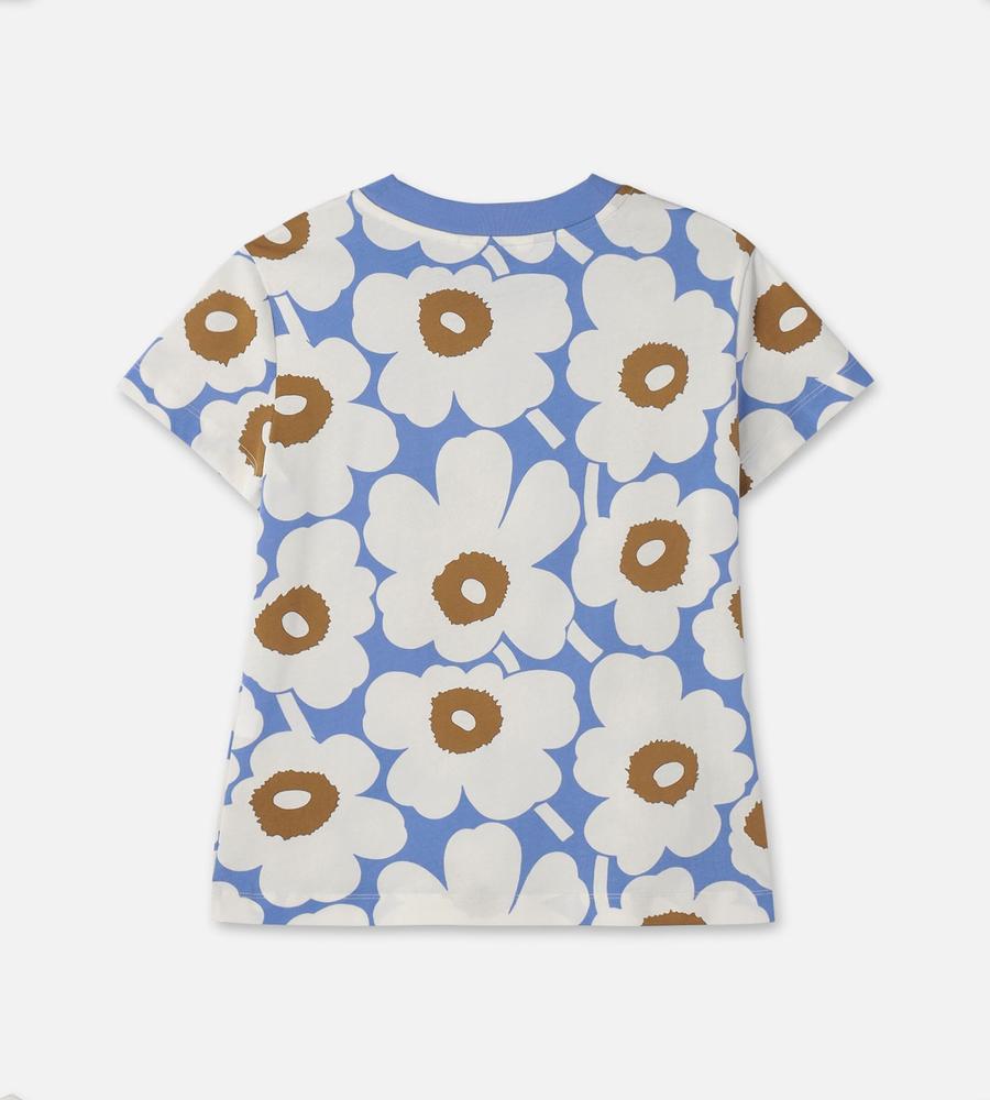 Marimekkoを代表するUnikko柄が華やかなデザインの半袖Tシャツ。スリムフィットなシルエットですっきりとした印象で着こなせます。リブ編みのクルーネックもアクセント。肌触りの良いコットン素材で仕立てた一枚。お手持ちのボトムに合わせて、春夏らしい明るいムードの着こなしが実現するアイテムです。