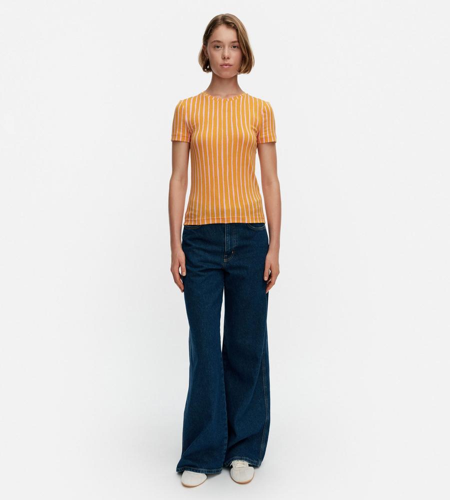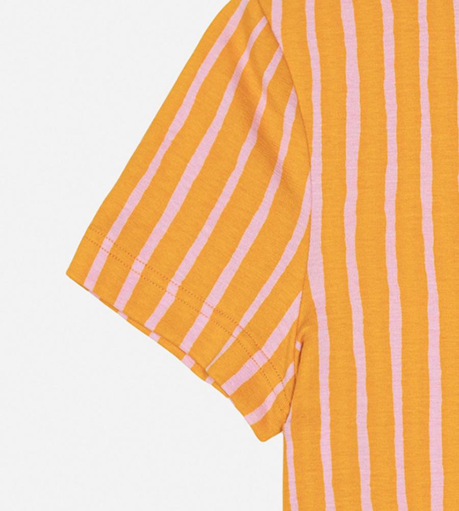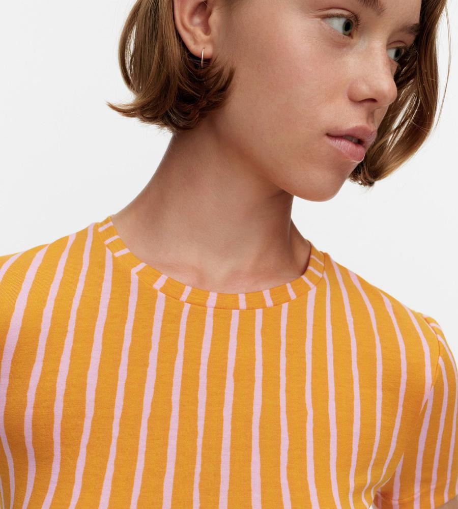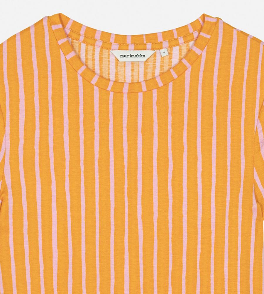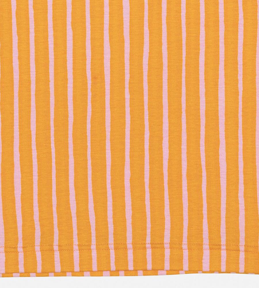 目が覚めるような鮮やかなストライプ柄が魅力、Kaunes Piccolo半袖カットソーです。遠目にもアイキャッチな配色コンビがポイント、コーデを明るく華やかに盛り上げてくれます。体のラインにフィットするボディコンシャスなシルエットで、1枚ではもちろんインナーとしても着まわししやすいアイテムです。