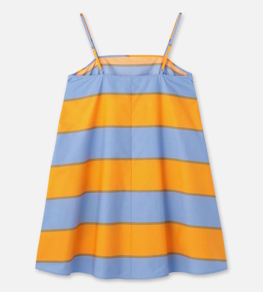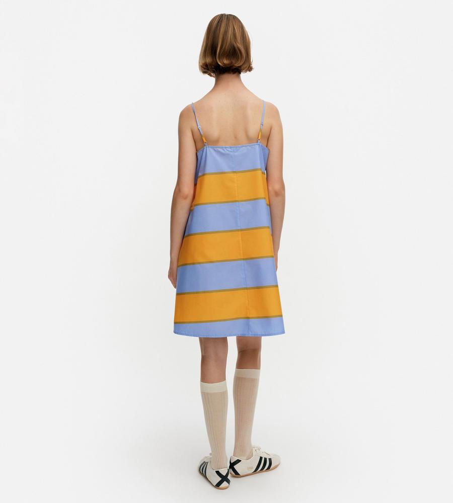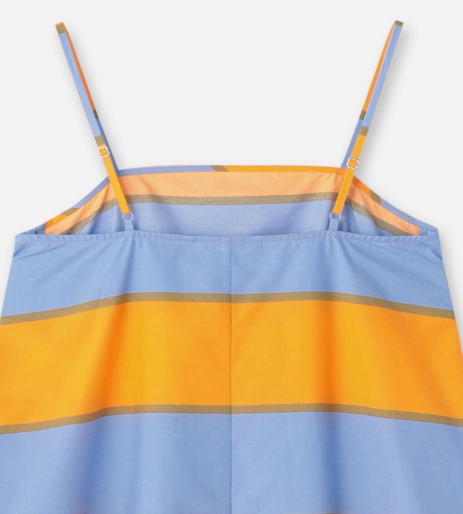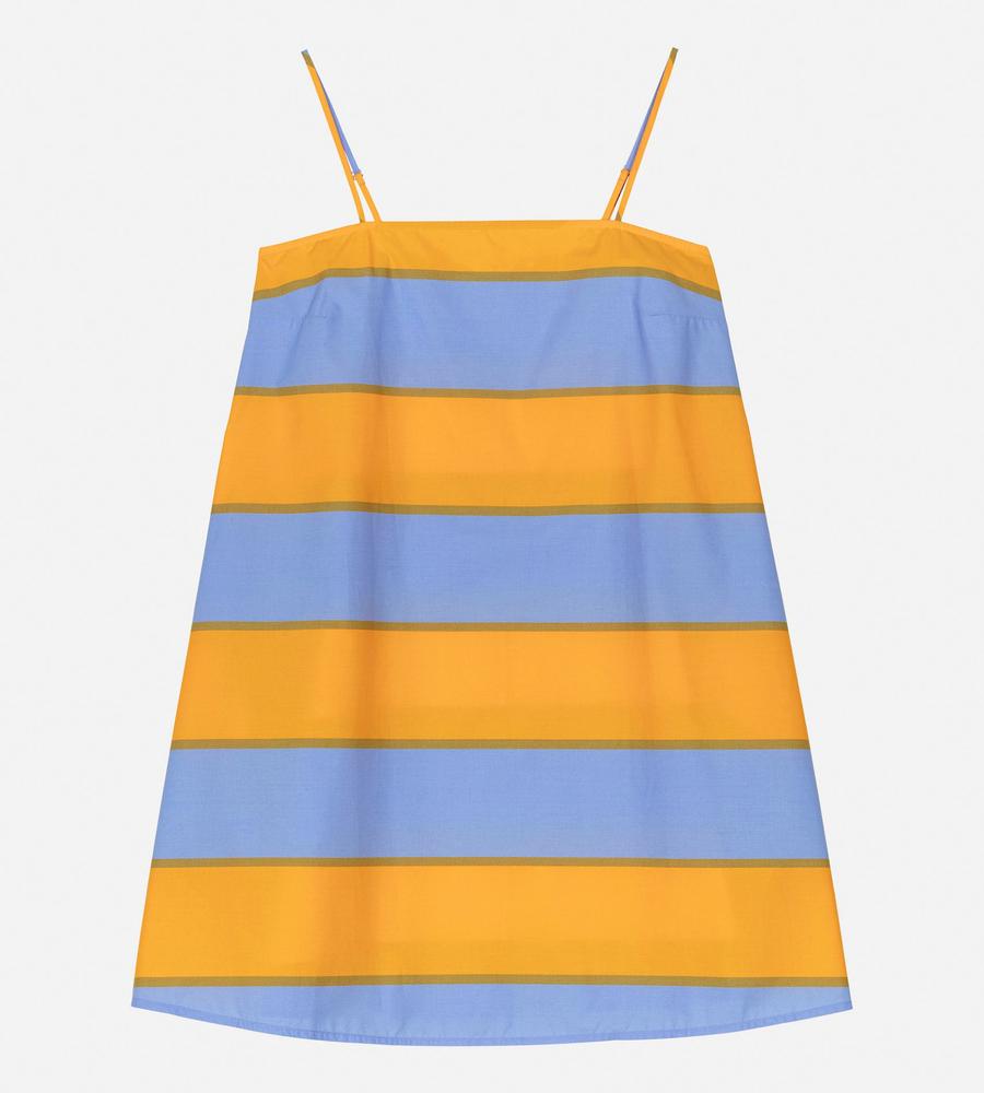 ストライプのGalleria柄が華やかなデザインのドレス。裾に向かって広がるAラインシルエット。細めの肩ストラップがフェミニンなムード。胸元に入ったダーツが立体的で美しいシルエットを演出します。春夏シーズンにぴったりなひざ上のミニ丈。一枚でお出かけコーディネートが完成するアイテムです。