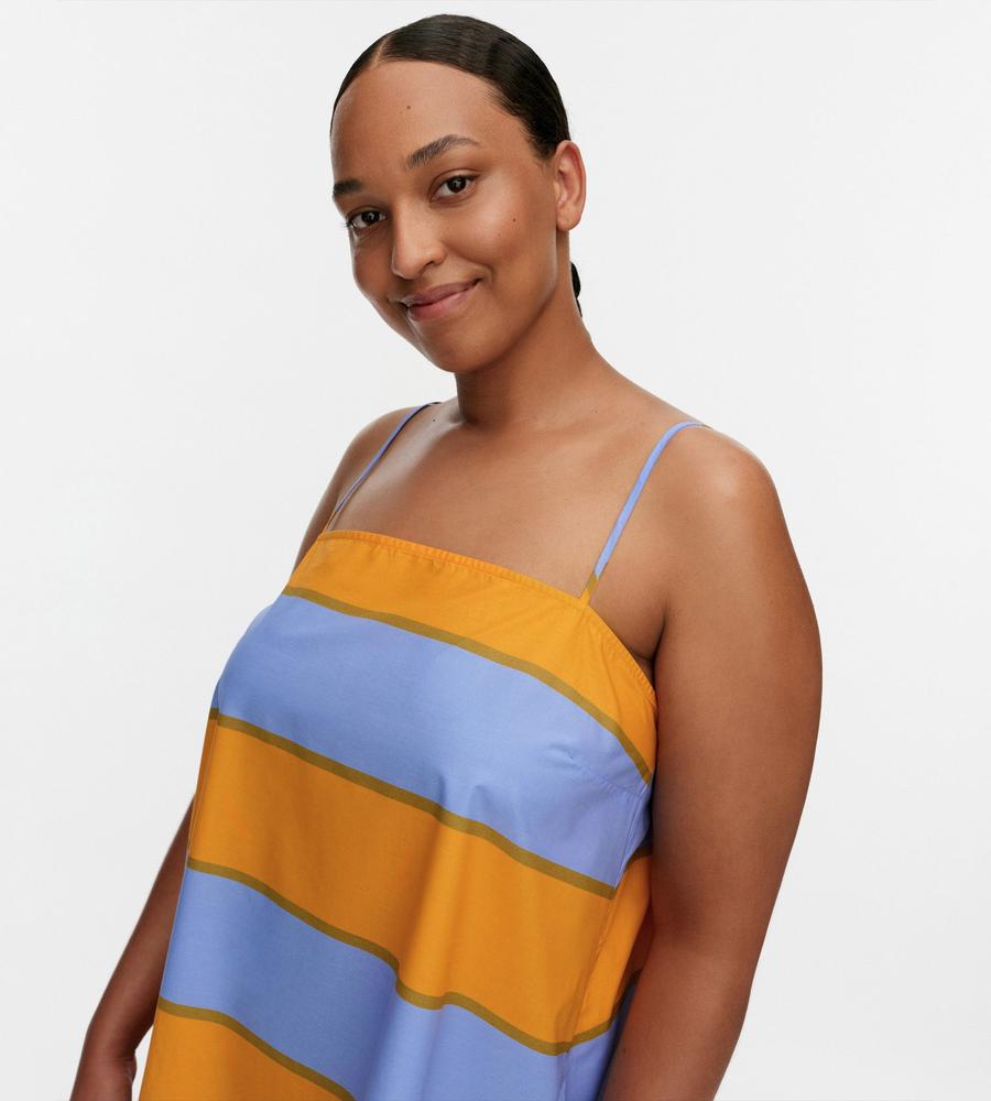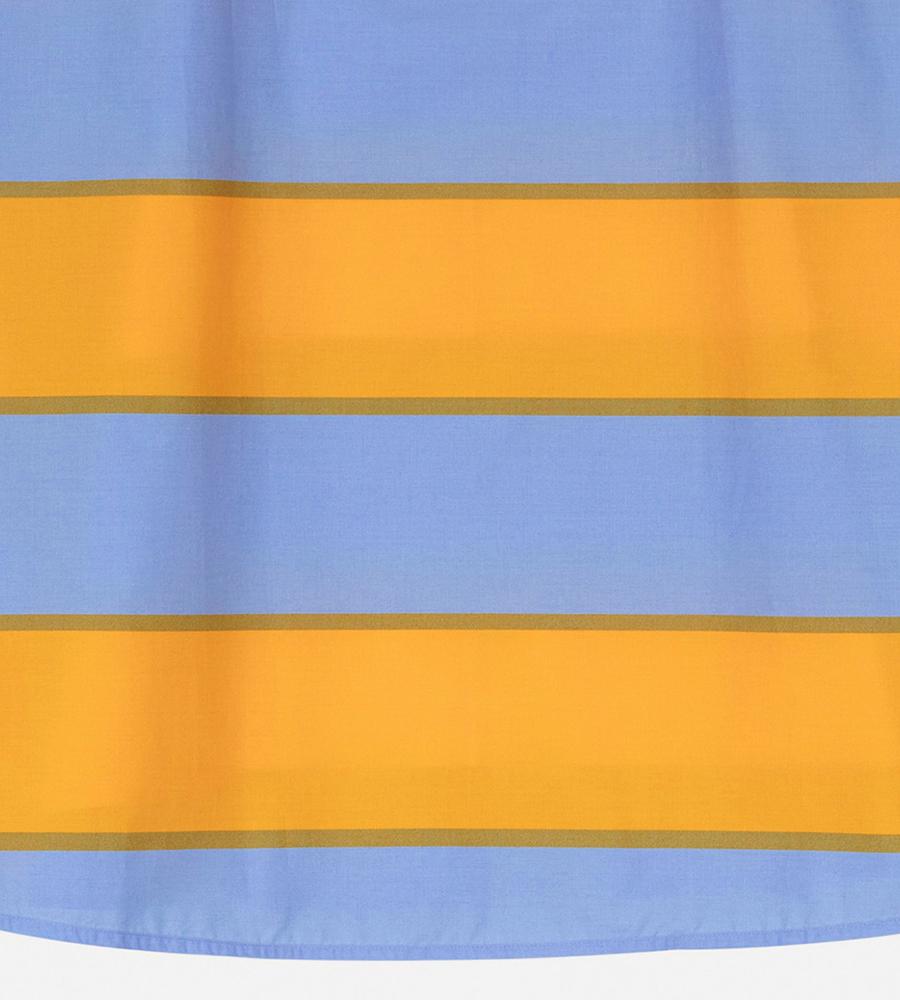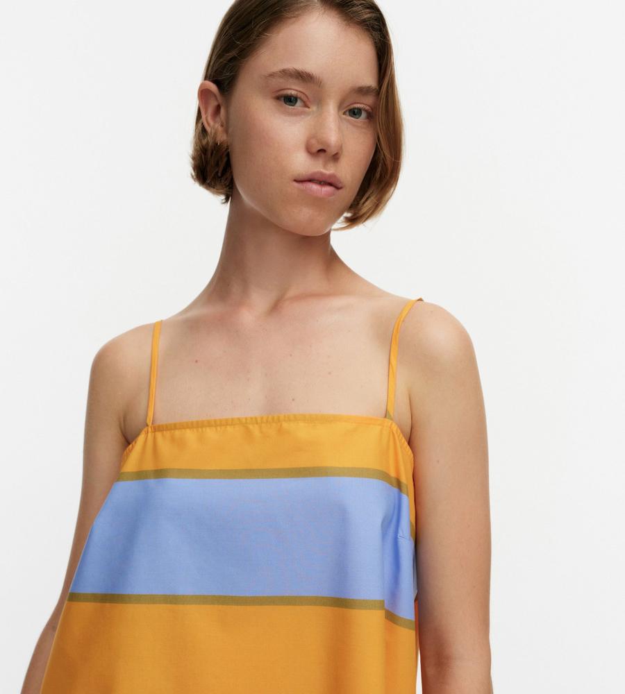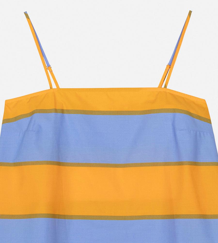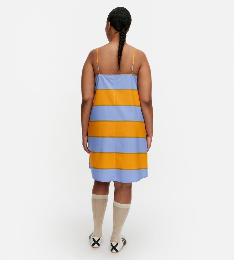 ストライプのGalleria柄が華やかなデザインのドレス。裾に向かって広がるAラインシルエット。細めの肩ストラップがフェミニンなムード。胸元に入ったダーツが立体的で美しいシルエットを演出します。春夏シーズンにぴったりなひざ上のミニ丈。一枚でお出かけコーディネートが完成するアイテムです。