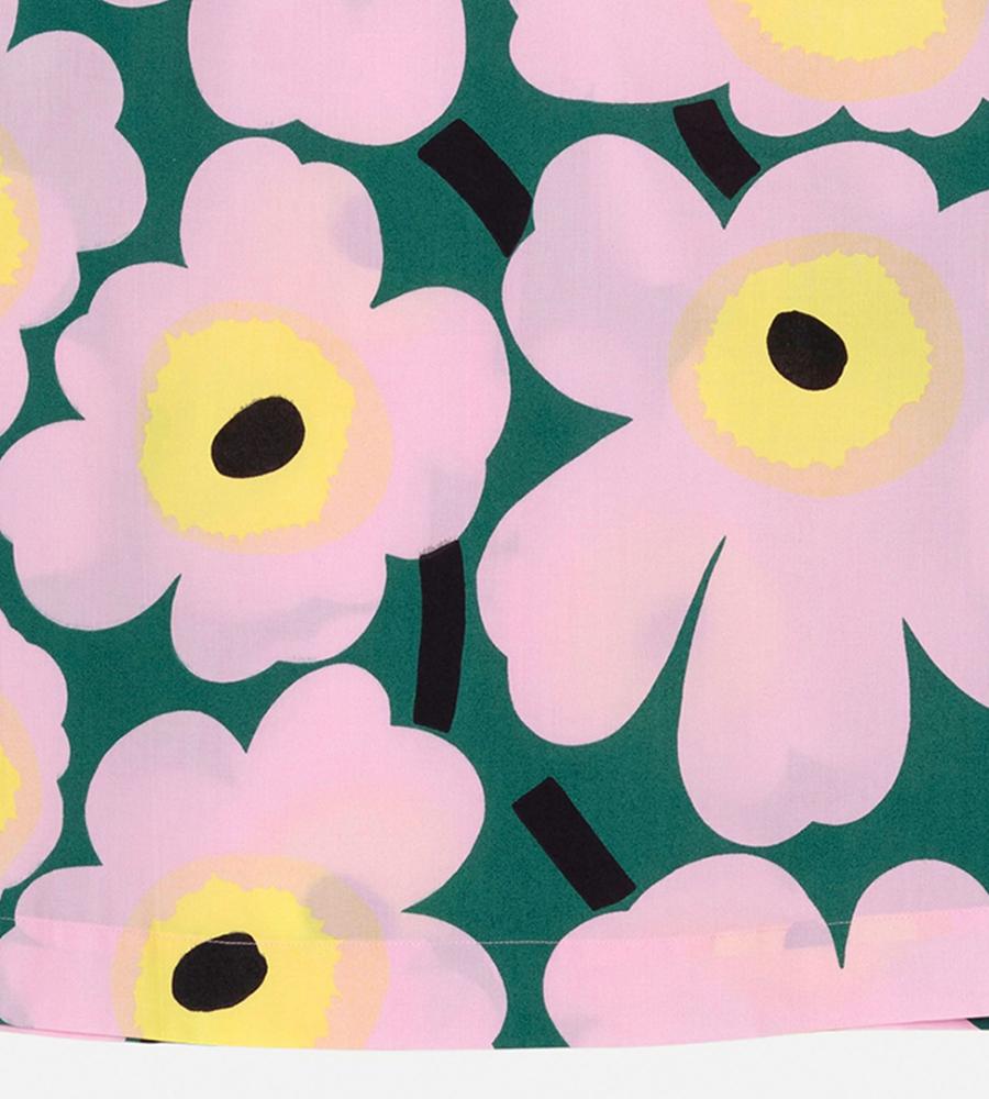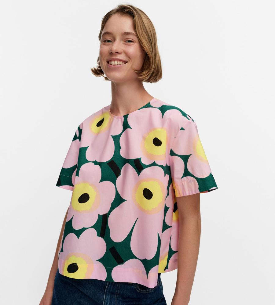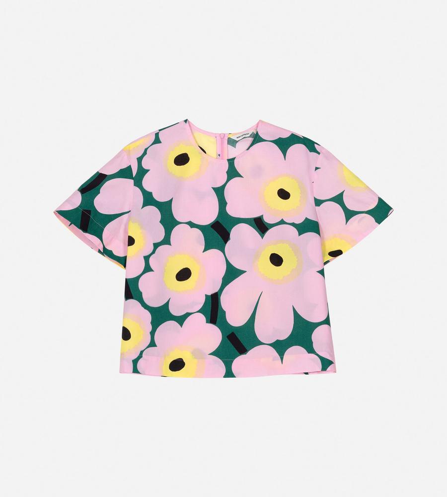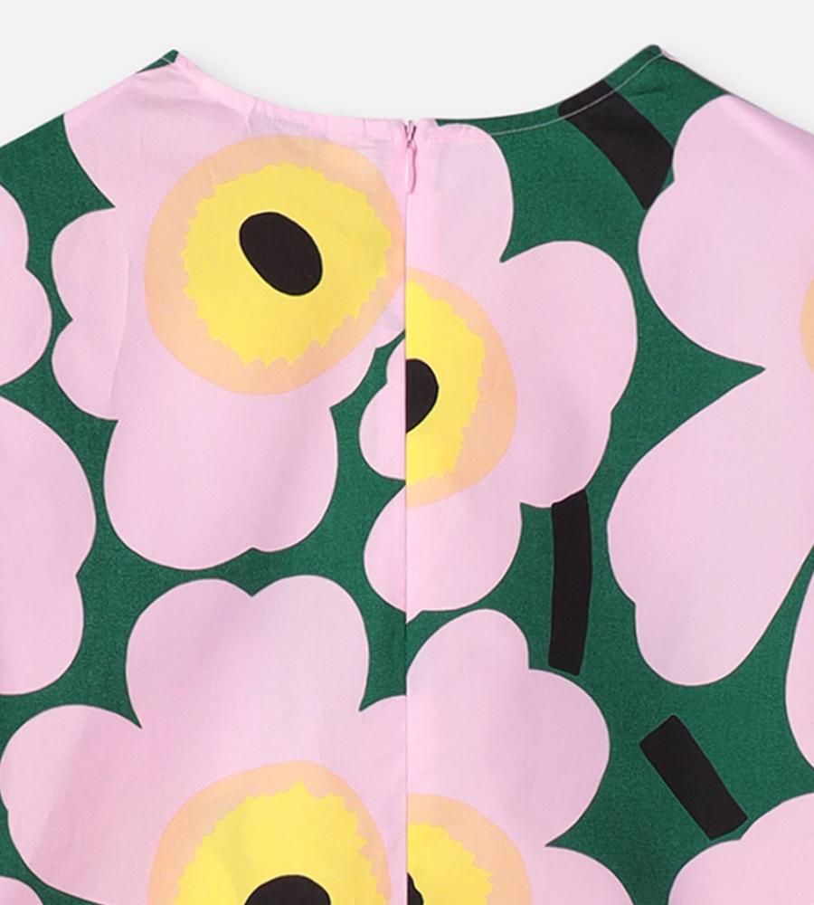 Marimekkoを代表するUnikkoモチーフを全面にあしらったクルーネック半袖ブラウス。裾に向かって広がる、ゆったりとしたAラインシルエット。背中の縫い目に隠しファスナーを付けたすっきりとしたデザイン。お手持ちのボトムに合わせるだけで、華やかなお出かけコーディネートが完成する便利なアイテムです。