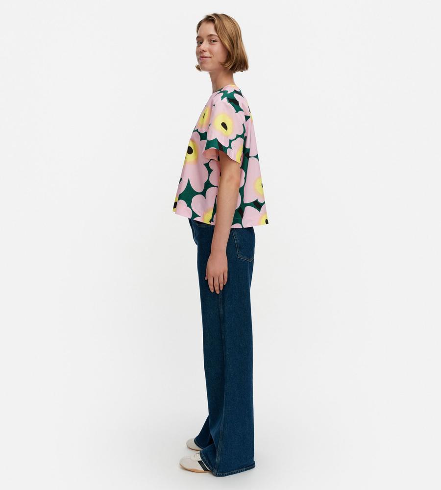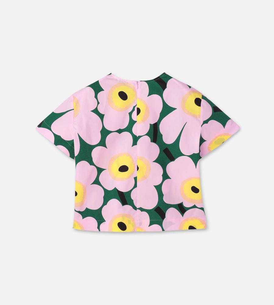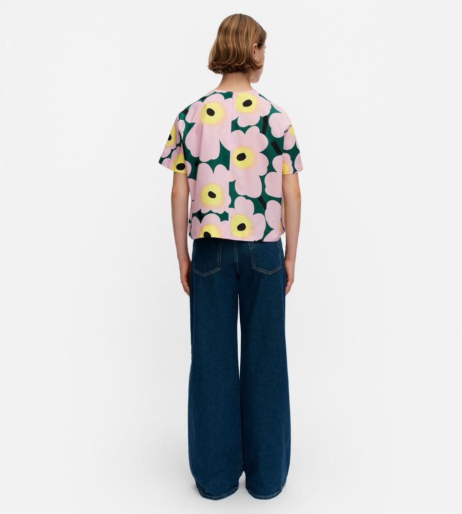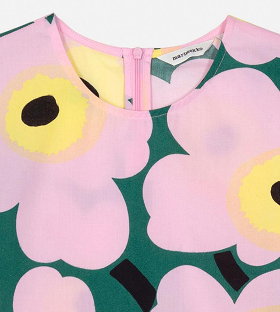 Marimekkoを代表するUnikkoモチーフを全面にあしらったクルーネック半袖ブラウス。裾に向かって広がる、ゆったりとしたAラインシルエット。背中の縫い目に隠しファスナーを付けたすっきりとしたデザイン。お手持ちのボトムに合わせるだけで、華やかなお出かけコーディネートが完成する便利なアイテムです。