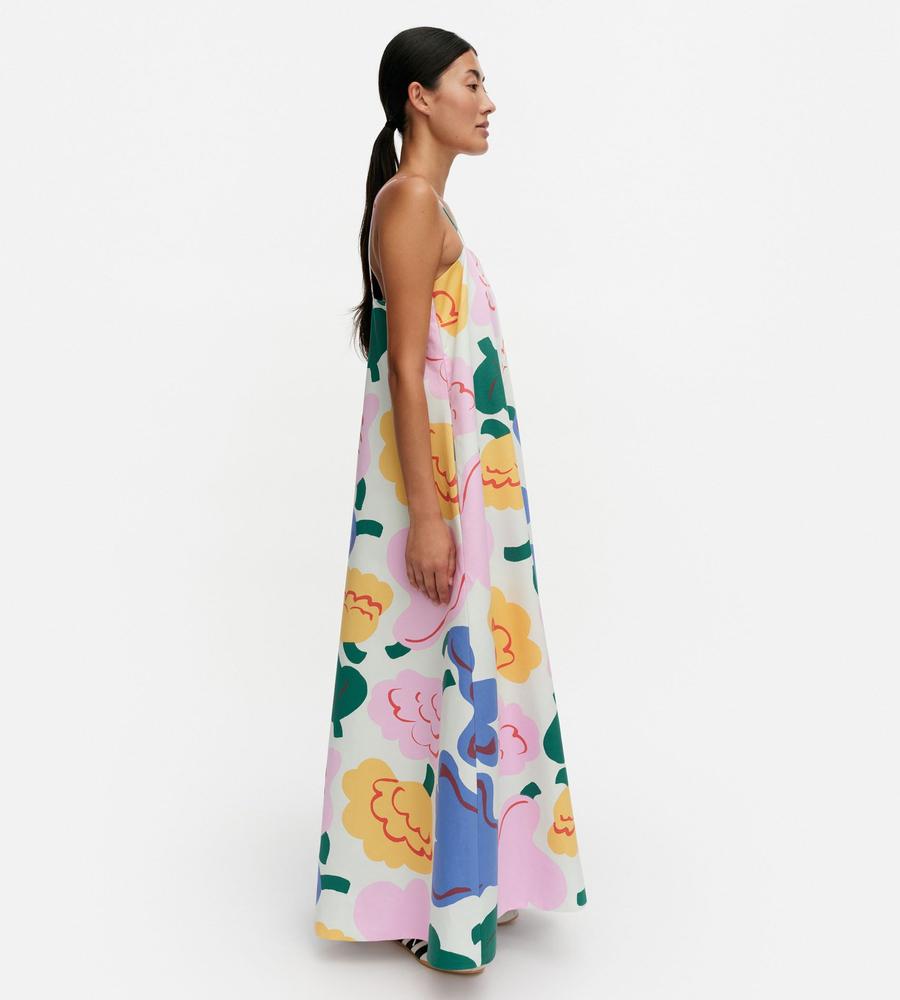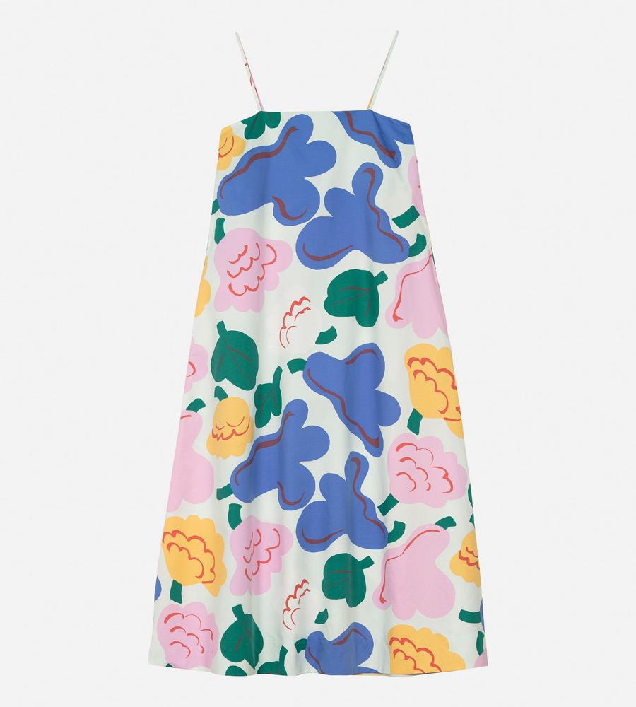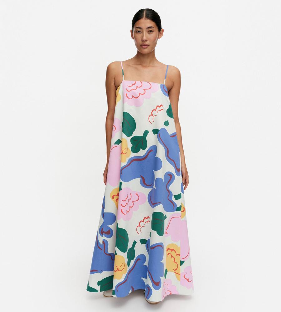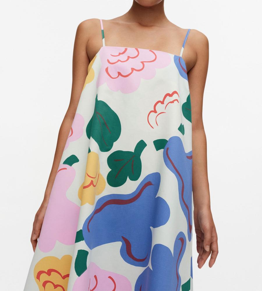 色鮮やかな柄が華やかなSh Huvittaa Kukasta Kukkaanワンピースです。キャミソールタイプの肩ストラップと裾広がりのフレアシルエットが、リゾートライクな着こなしをかなえてくれます。これ1枚で肌コンシャスに着るのはもちろん、手持ちのTシャツやカットソーとの重ね着もおすすめです。