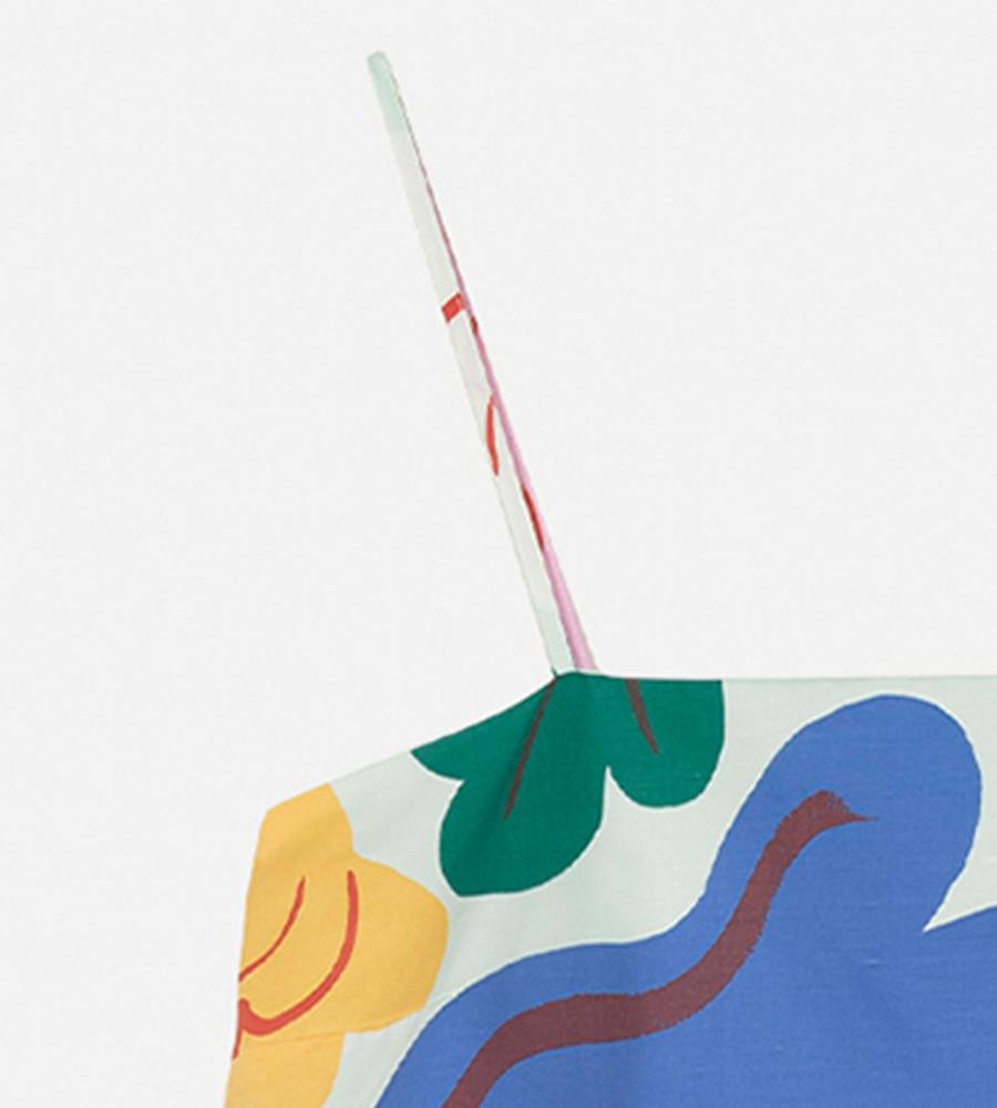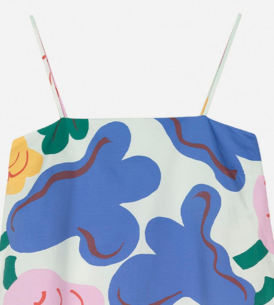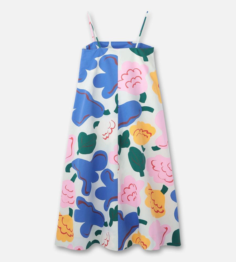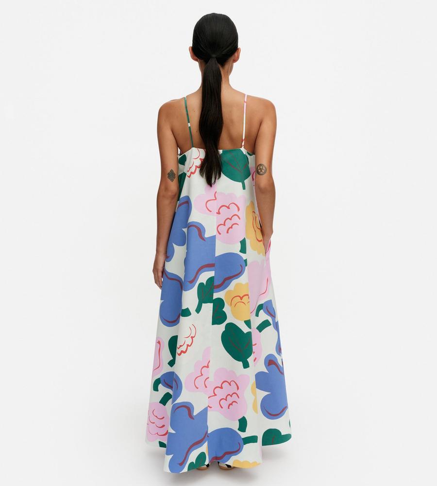 色鮮やかな柄が華やかなSh Huvittaa Kukasta Kukkaanワンピースです。キャミソールタイプの肩ストラップと裾広がりのフレアシルエットが、リゾートライクな着こなしをかなえてくれます。これ1枚で肌コンシャスに着るのはもちろん、手持ちのTシャツやカットソーとの重ね着もおすすめです。