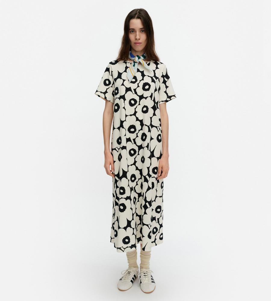 Marimekkoを代表するUnikko柄を全面にあしらったインパクトのあるデザインのロング丈Tシャツワンピース。裾に向かってAラインに広がる、ドレープ感のあるシルエットがフェミニンなムード。さっと一枚着るだけで、華やかでスタイリッシュなコーディネートが実現する便利なアイテムです。