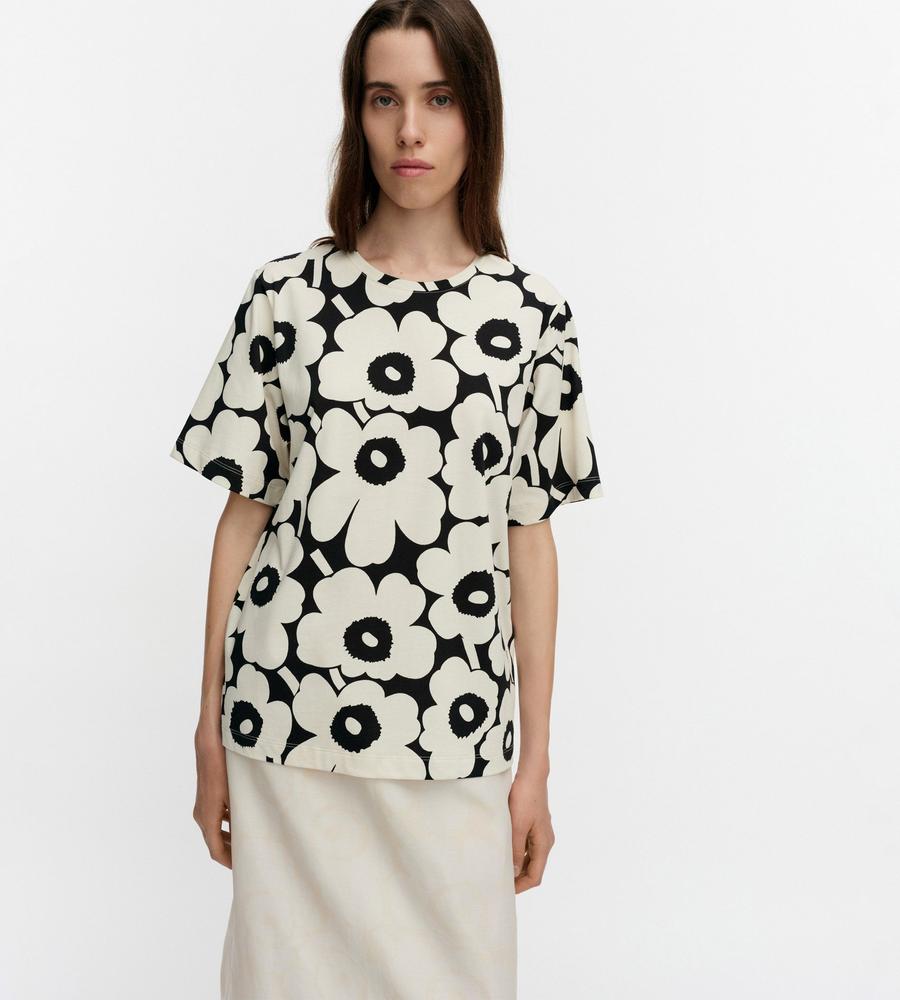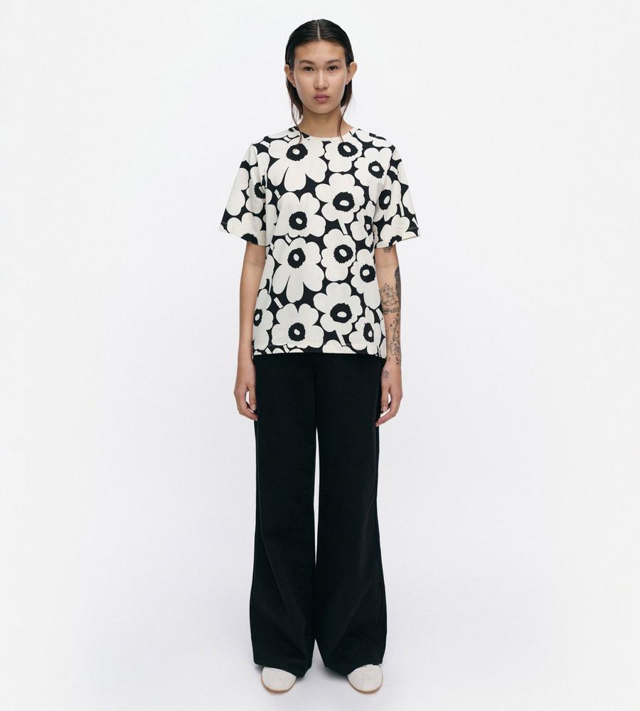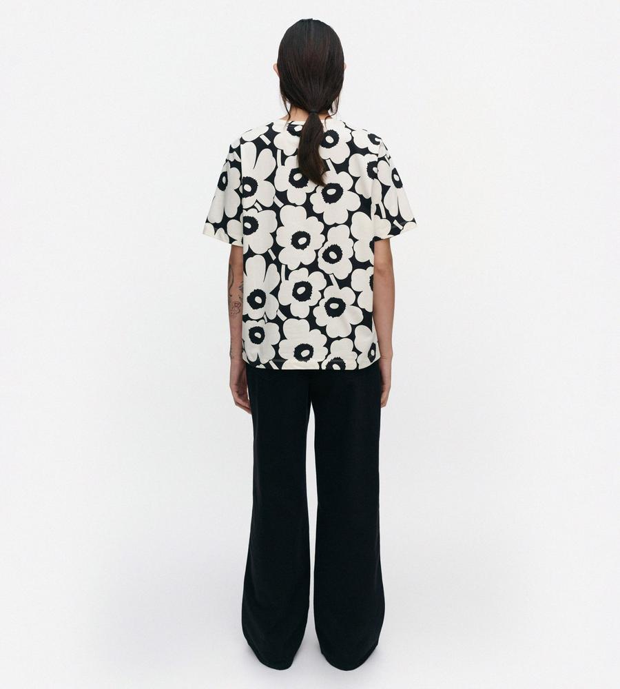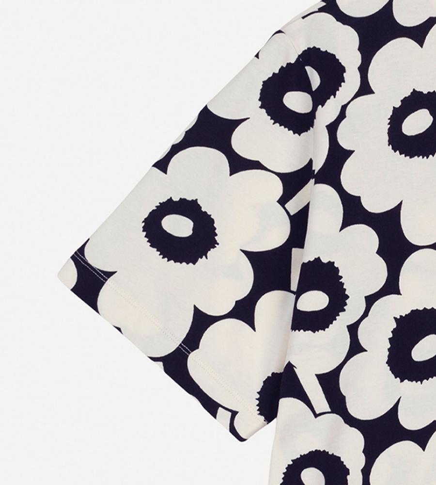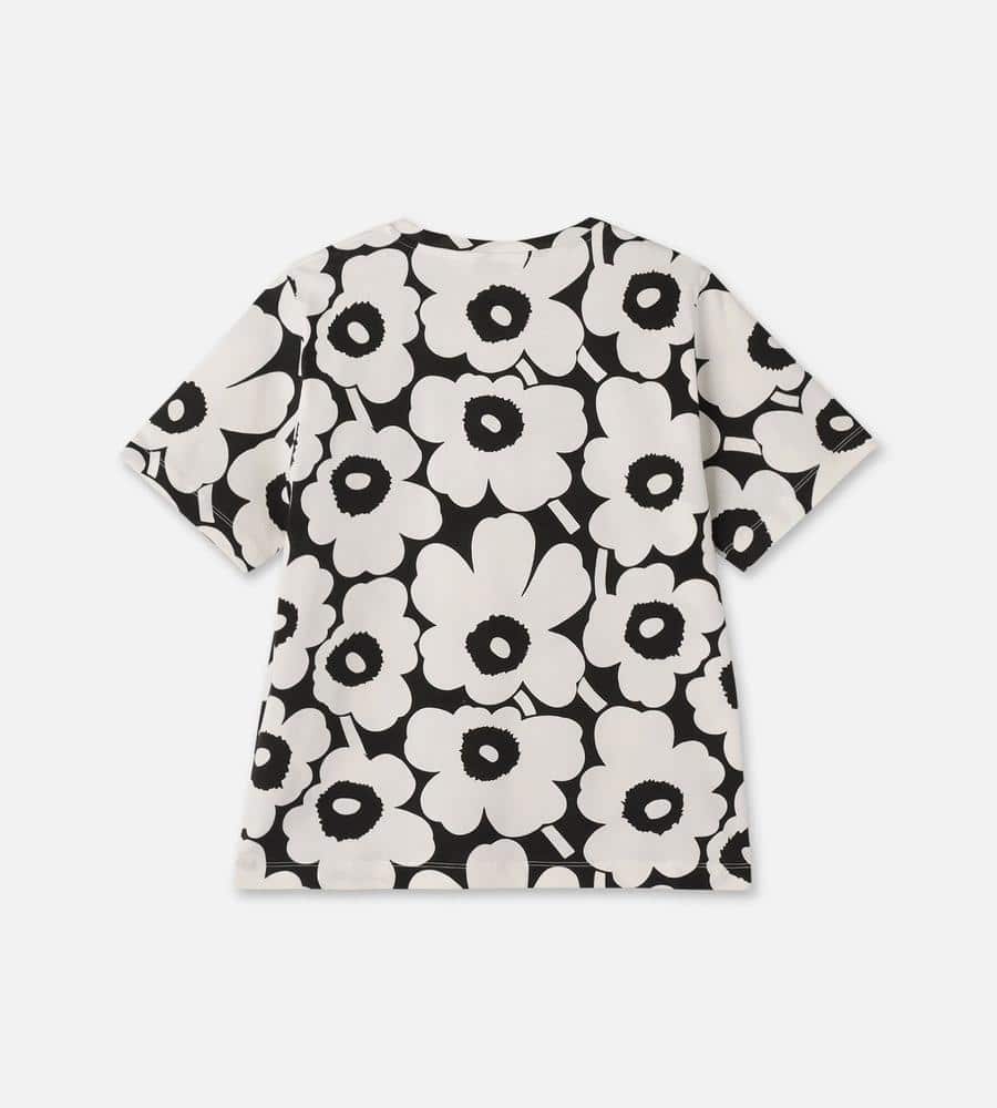 Unikko柄のクルーネック半袖Tシャツ。大きなフラワーモチーフがインパクトのあるデザイン。さまざまなボトムと好相性のゆったりとしたストレートシルエット。手触りの良いコットン生地で仕立てた着心地の良い一枚。お手持ちのボトムに合わせるだけで、華やかなスタイリングが実現するアイテムです。