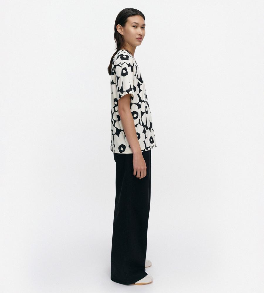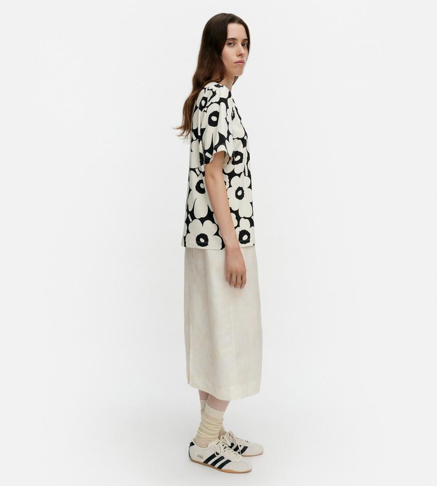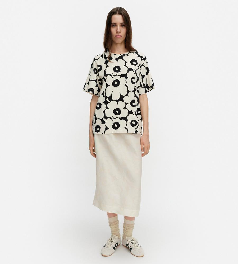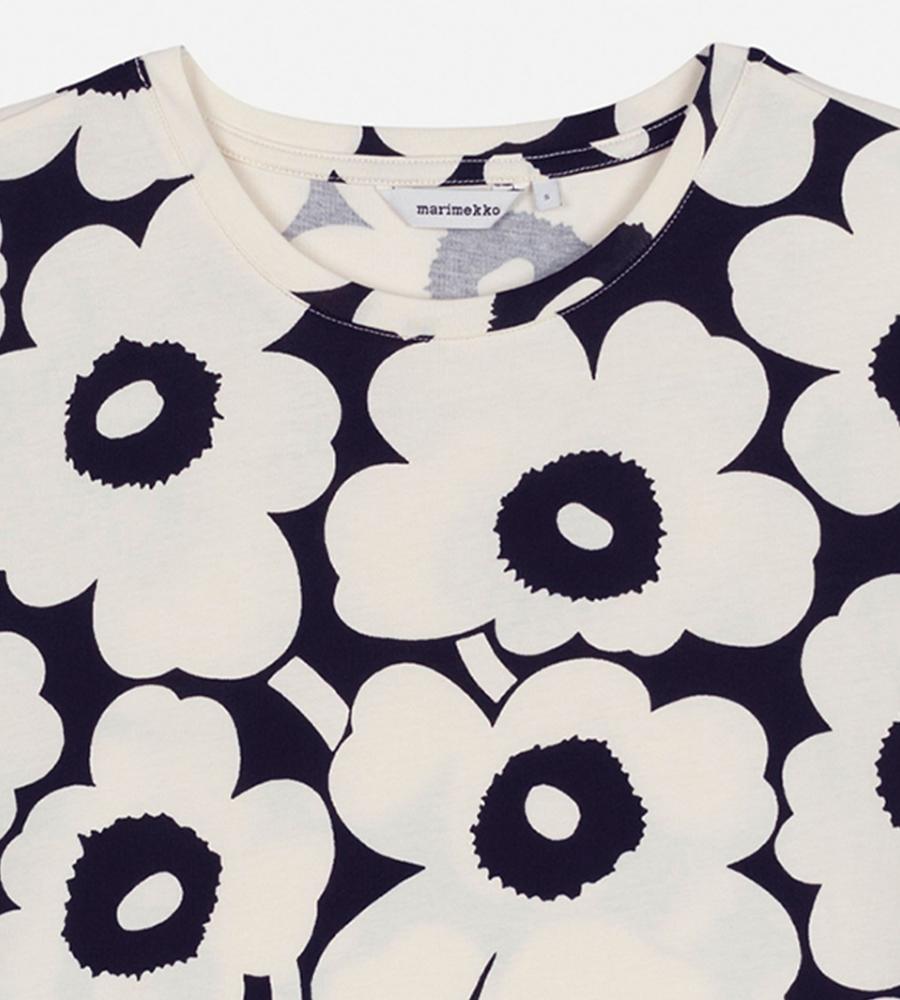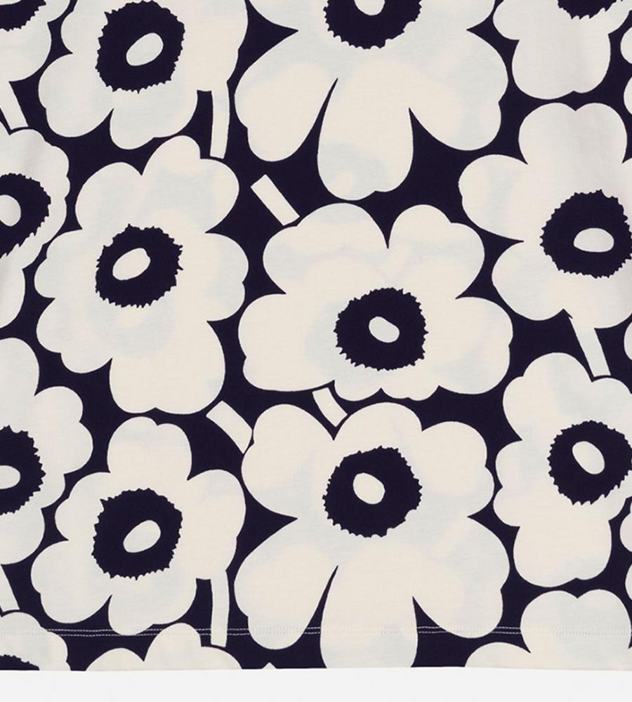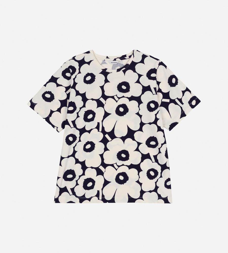 Unikko柄のクルーネック半袖Tシャツ。大きなフラワーモチーフがインパクトのあるデザイン。さまざまなボトムと好相性のゆったりとしたストレートシルエット。手触りの良いコットン生地で仕立てた着心地の良い一枚。お手持ちのボトムに合わせるだけで、華やかなスタイリングが実現するアイテムです。