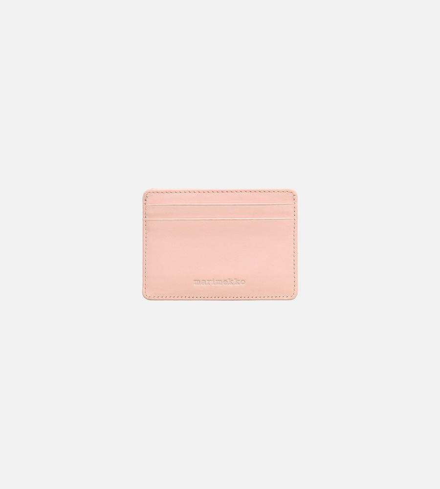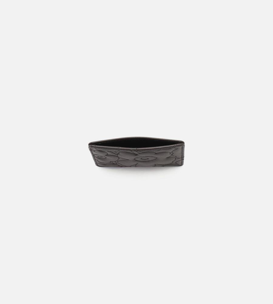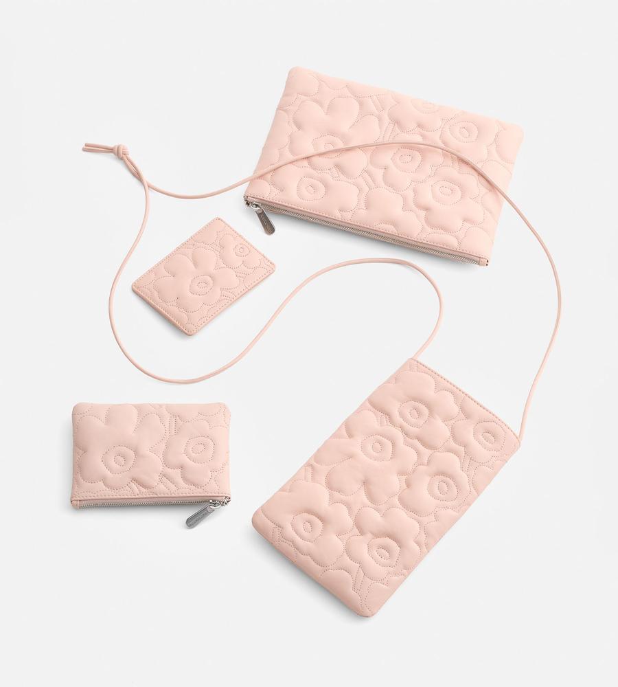キルティング加工のUnikko柄が華やかなデザインのレザーカードホルダー。パット入りの立体感ある表面がデザインポイント。背面にはブランドロゴの型押しがスタイリッシュなデザインアクセント。シンプル&コンパクトな2つのカードフォルダーで、ミニマルなスタイルのお出かけにぴったりなアイテムです。