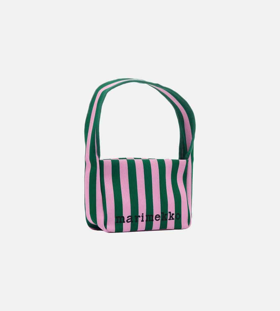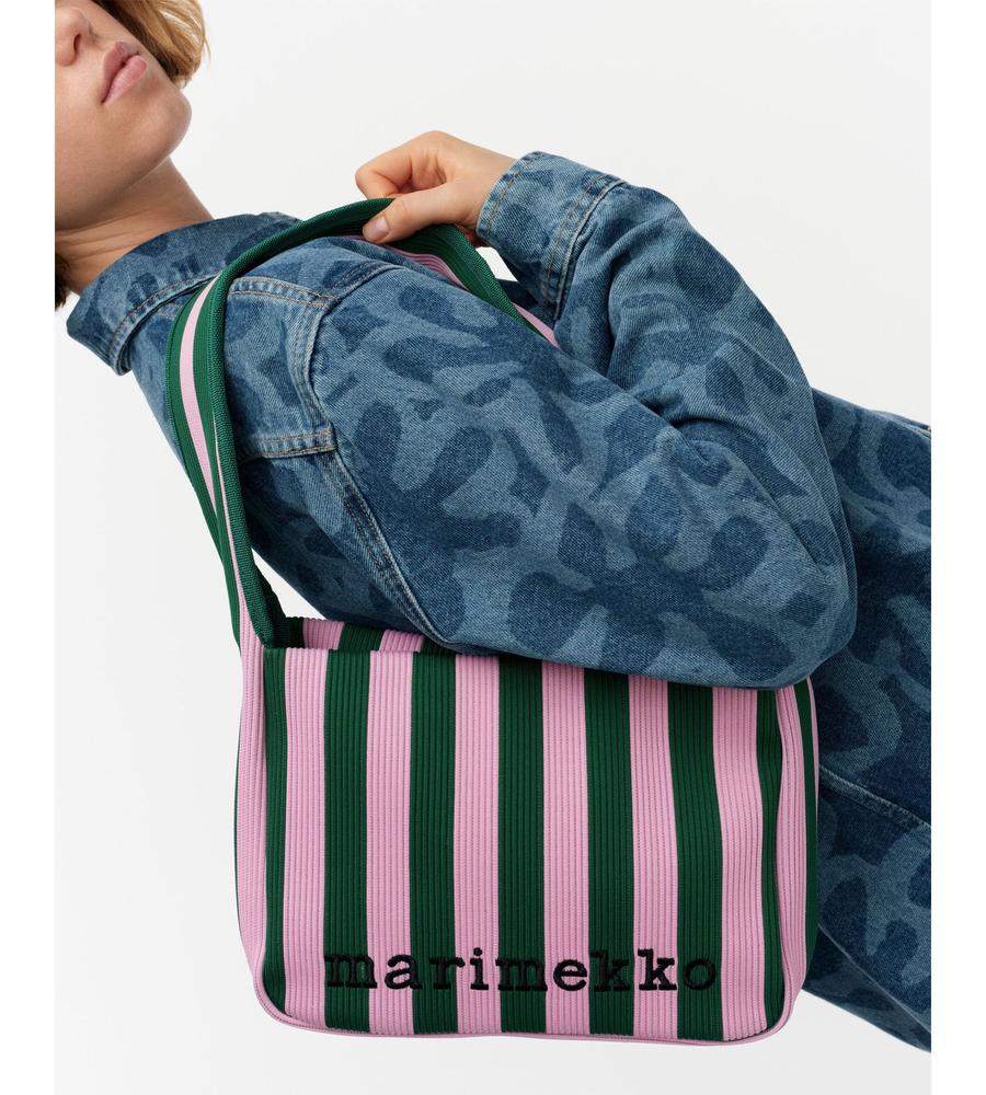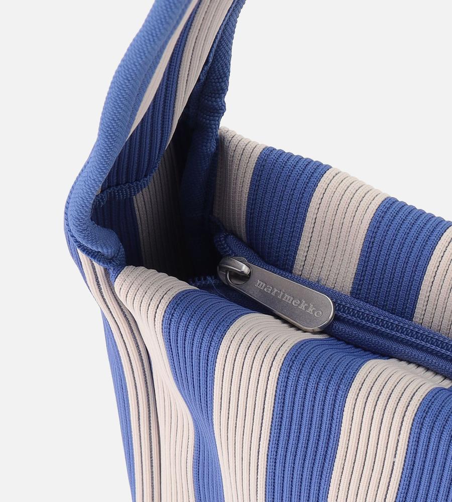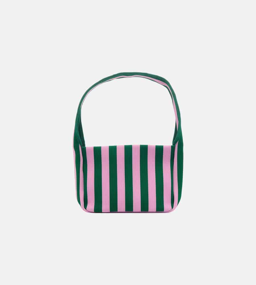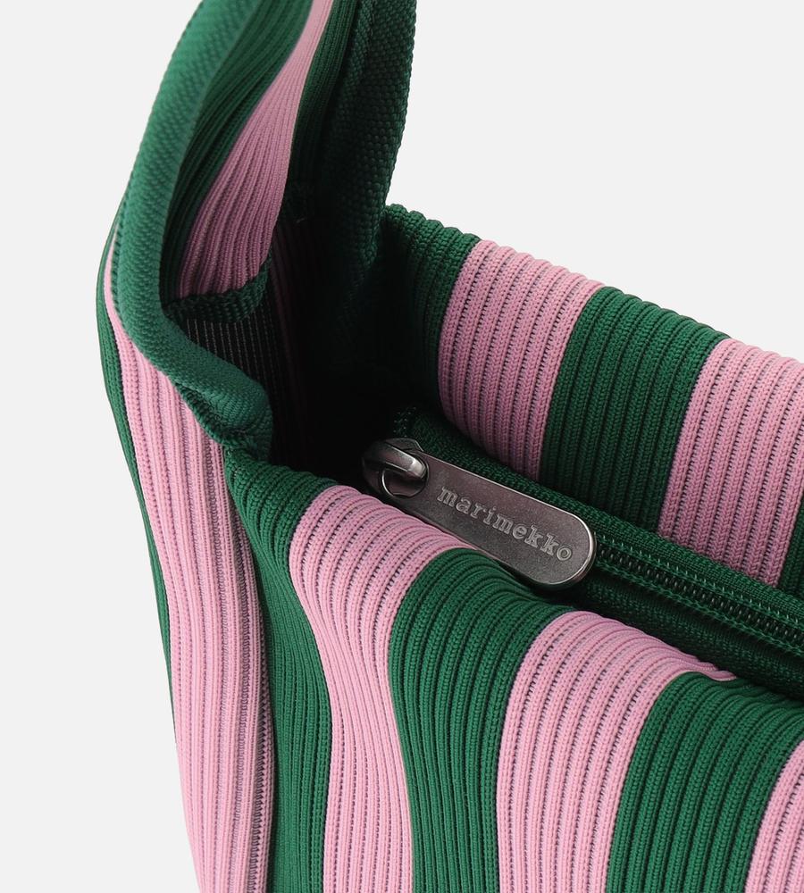 コーデの偏差値をアップする、アイキャッチなストライプ柄で仕上げたショルダーバッグです。ワンハンドルデザインで肩掛けしやすく、柔らかくて丈夫なニット素材で使い心地の良さにもこだわりました。お手頃なサイズ感で毎日のお出掛けにぴったり、他のサイズの同柄バッグとセットでそろえるのもおすすめです。