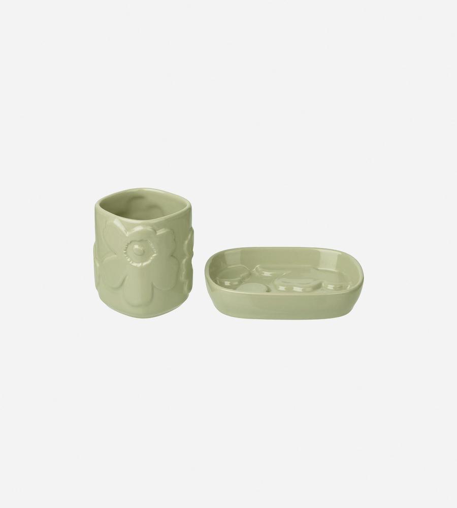 ブランドを象徴するUnikko柄を立体的な手法を用いて表現したカップ&ソープディッシュのセットアイテム。クリーンな印象に保っておきたい洗面所にしっくりとなじむ、ニュアンスカラーで表現しています。適度な重みを感じる素材は、存在感と高級感、さらに安定感も満点。ソープディッシュは凹凸があることにより水切れの良さにも期待できます。
