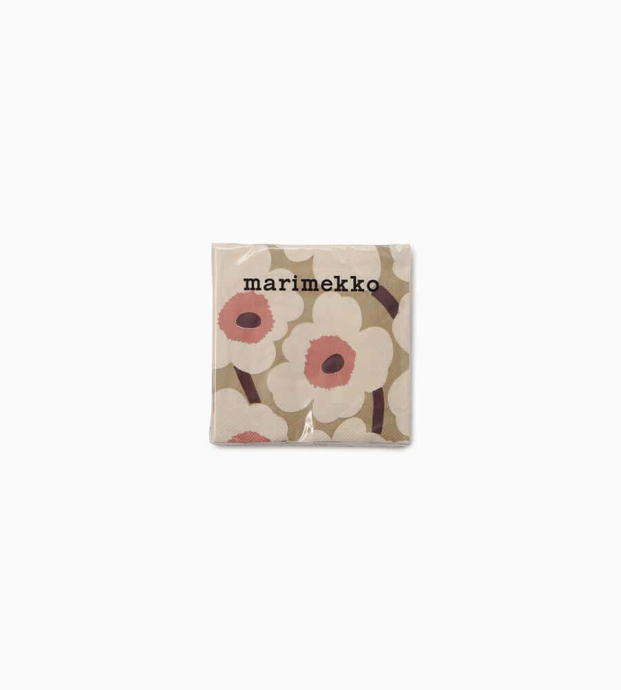 Marimekkoを代表するUnikko(ウニッコ)のケシの花のモチーフのカクテルペーパーナプキン。ベージュをベースにピンクの差し色が華やかなカラーリング。明るい雰囲気のテーブルコーディネートが完成します。ホームパーティーなどのパーティーシーンにぴったりなアイテムです。