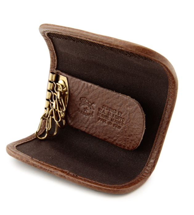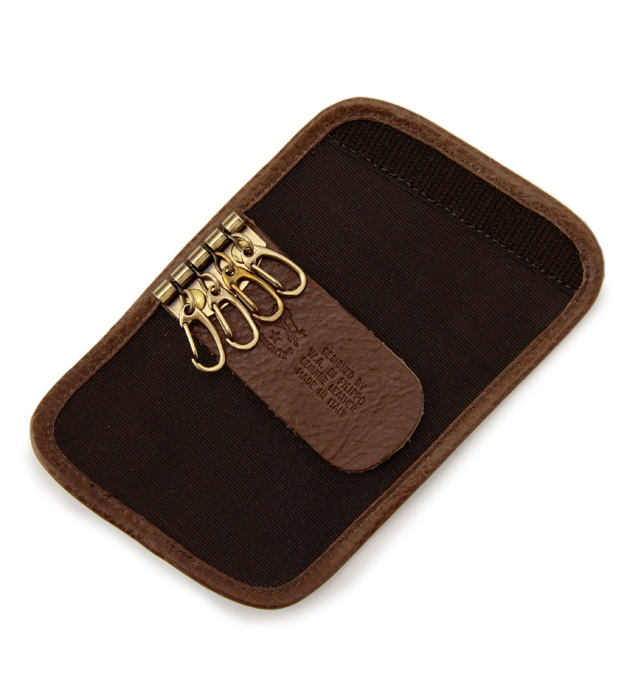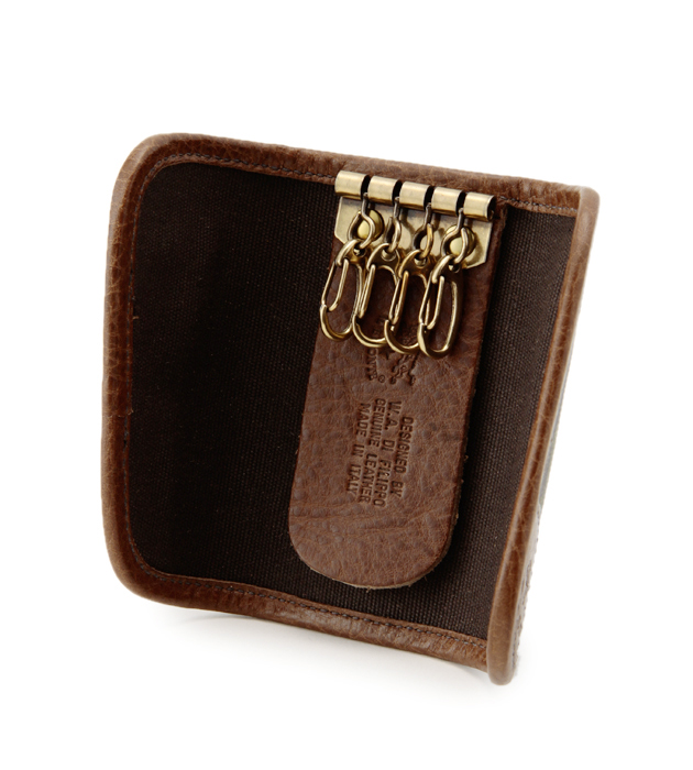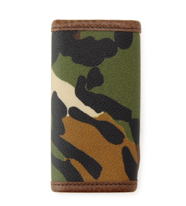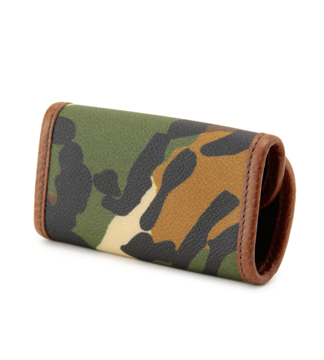 カモフラージュ柄のキャンバス地をPVCコーティングした表地と牛革のコンビネーションがオリジナリティ溢れるキーホルダーケースが登場。他にはないデザインプリントが大人のおしゃれ心を刺激します。内側には4つのキーホルダーつき、イルビゾンテのロゴも施されたこだわりのディテール。ギフトとしても喜ばれるアイテムです。