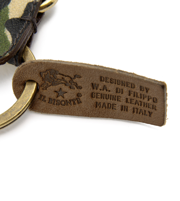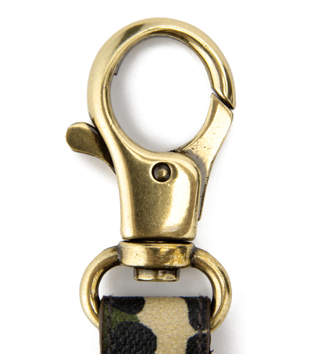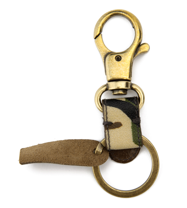 アンティークゴールドとカモフラージュ柄がコラボした、新鮮ディテールのキーリング。カモフラージュ柄のキャンバス地をPVCコーティングした表地と牛革のコンビネーションは重厚感があり、持っているだけで自慢したくなる逸品です。バッグに取り付ければ、大事な鍵を無くすこともありません。刻印付きのタグも、アイテムの魅力を増すキーポイント。