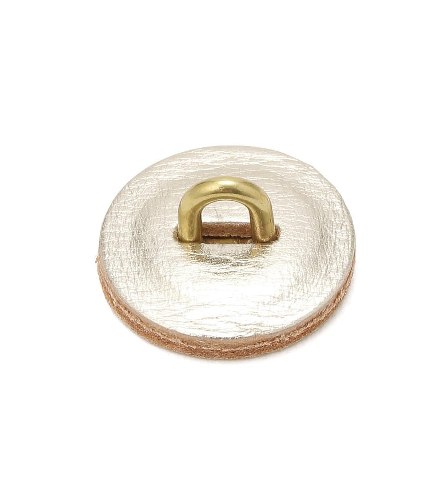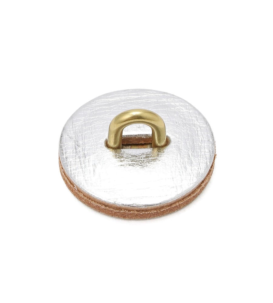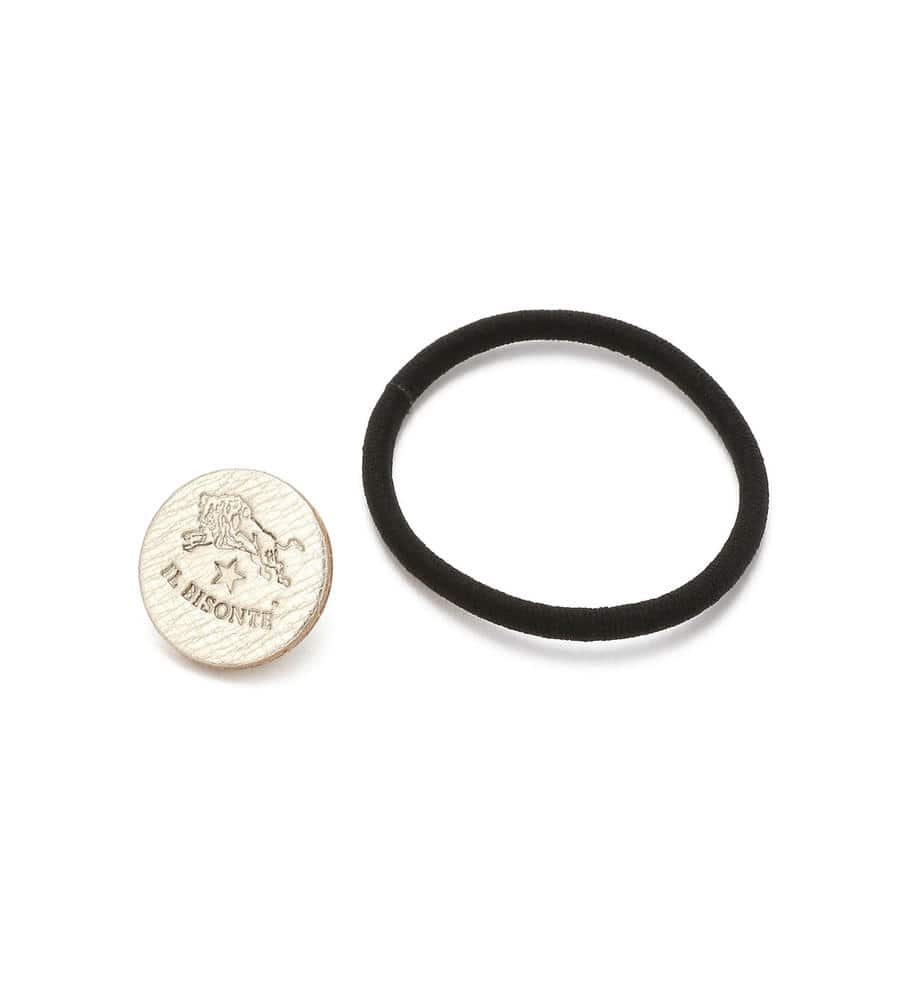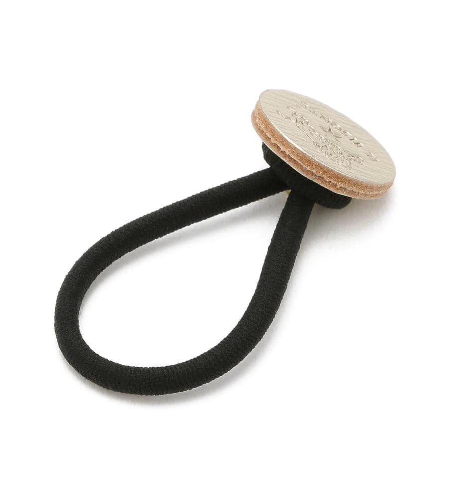 ラウンドにカットしたレザーパーツが目を引くヘアゴム。メタリックカラーにすることでエッジを効かせました。ゴムは取り外しができるようにデザインされています。ヘアスタイルのちょっとしたアクセントとなってくれるアイテムです。