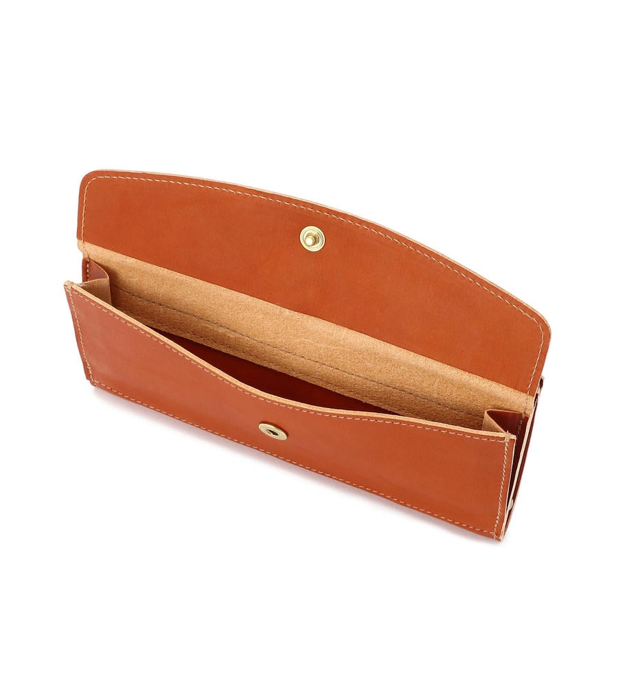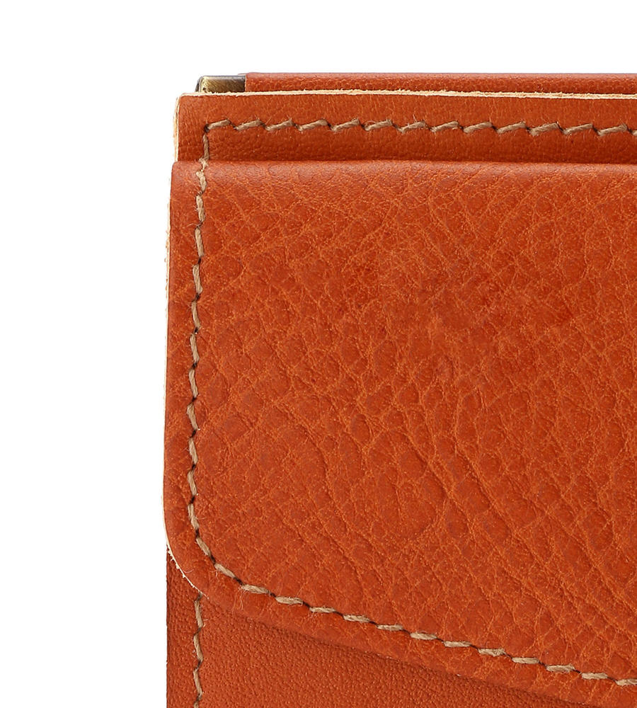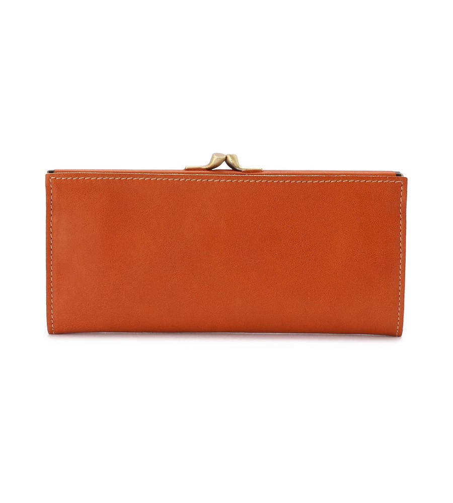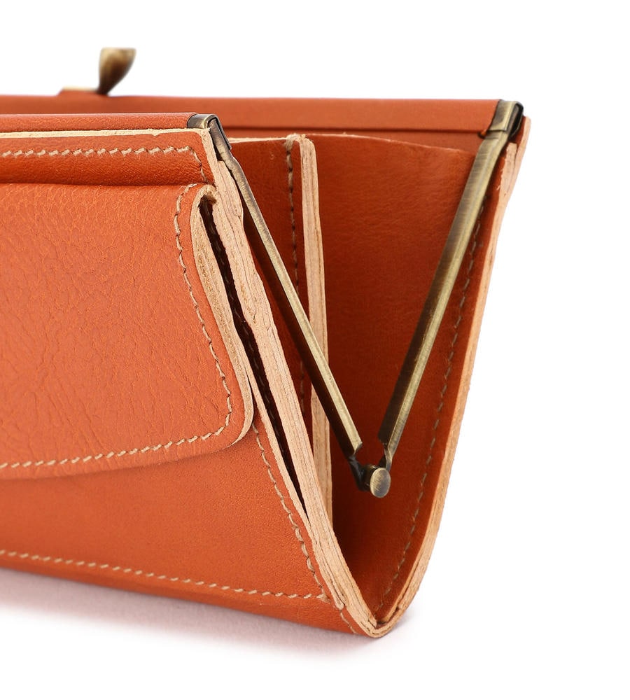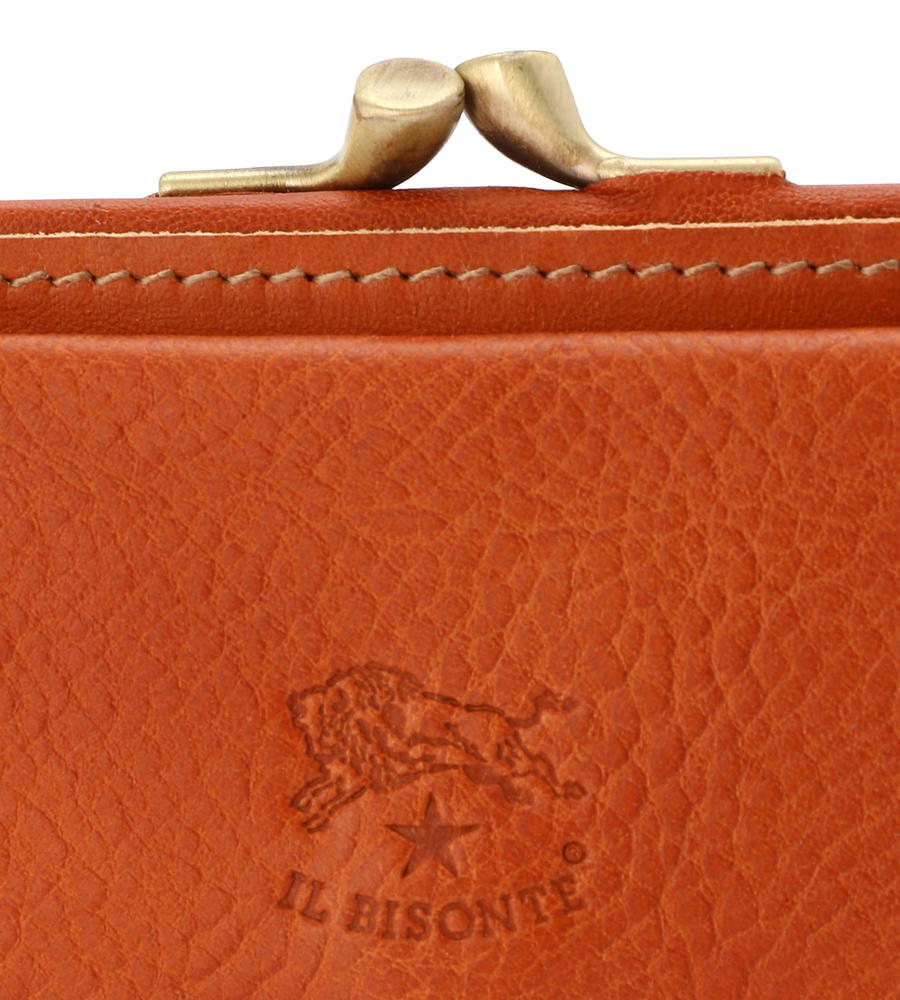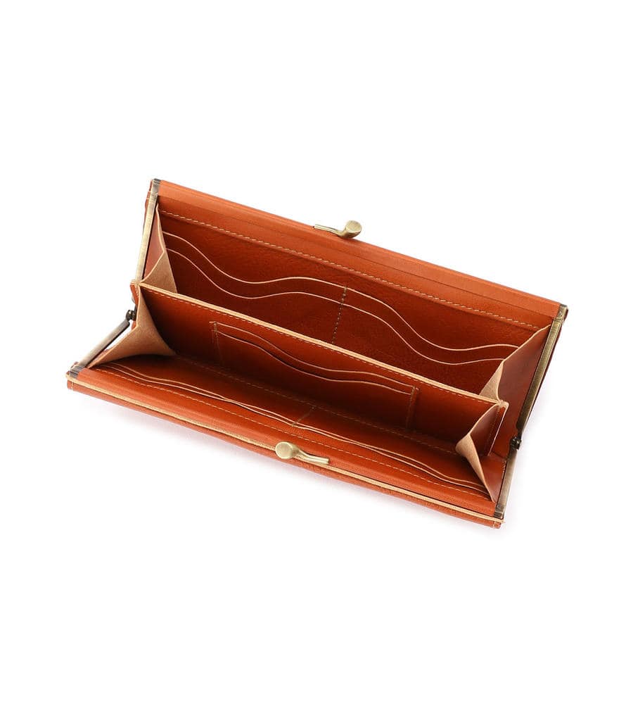 収納力抜群のロングウォレットです。フラップポケットにはコインを、がま口部分にはカードスリットと紙幣を収納できるスペースを設けています。フロントにバイソンロゴの刻印を施しています。