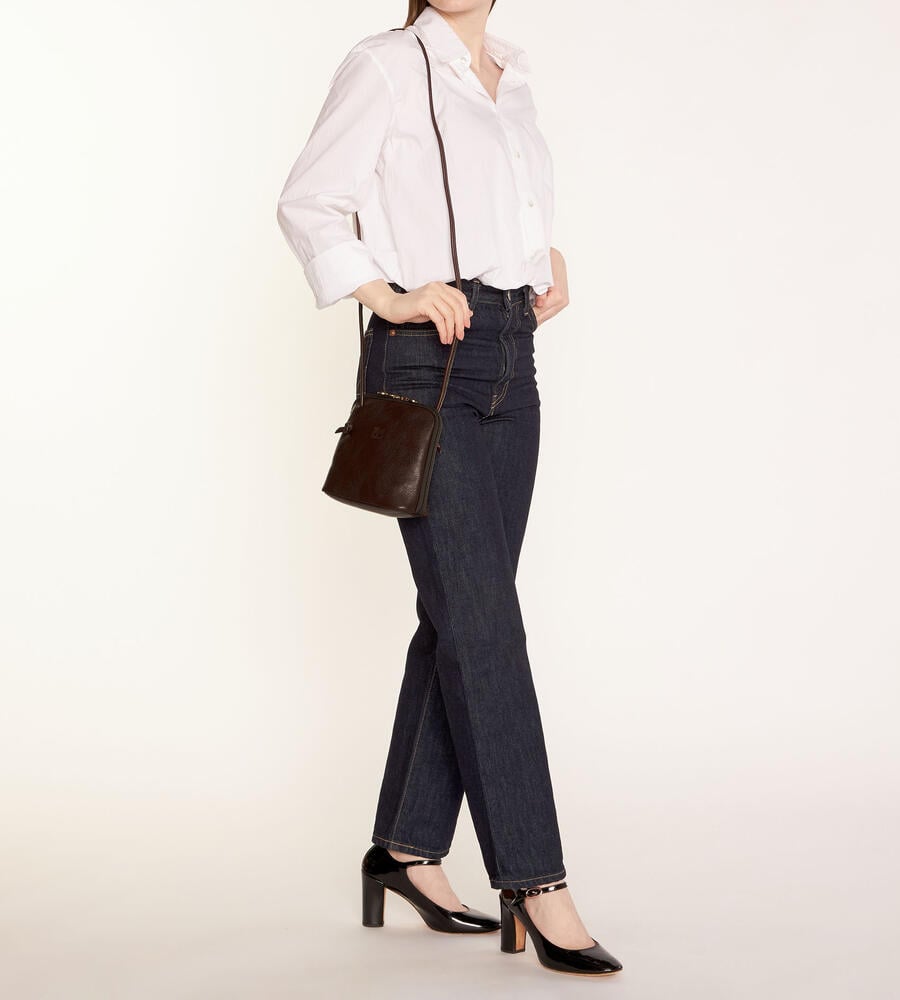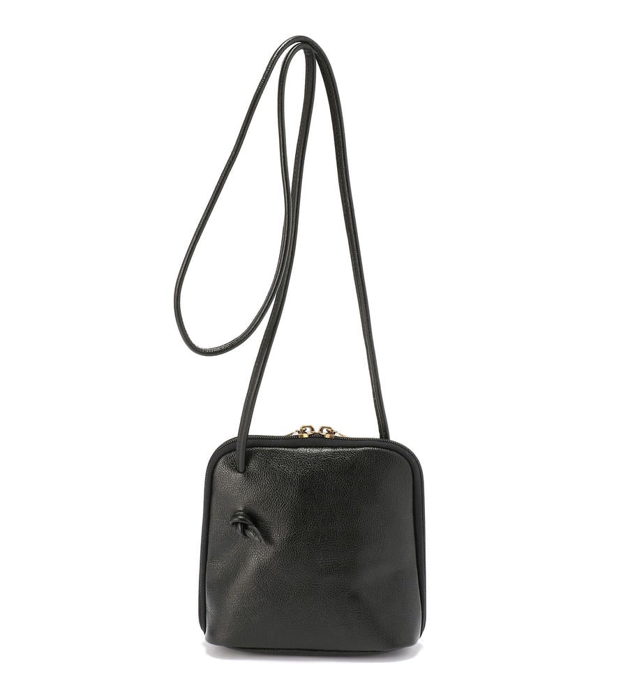 本体に直接ベルトを通し、きゅっと結んで留めつけたバッグです。両側に大きく開くジップ仕様、マチつきフォルムでは中身が見渡しやすいのも特徴です。フロントにはバイソンロゴの型押しがほどこされています。
