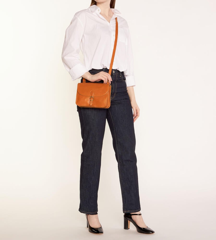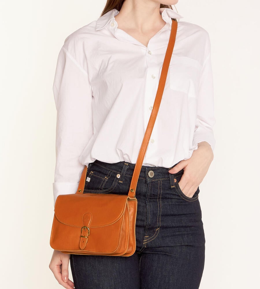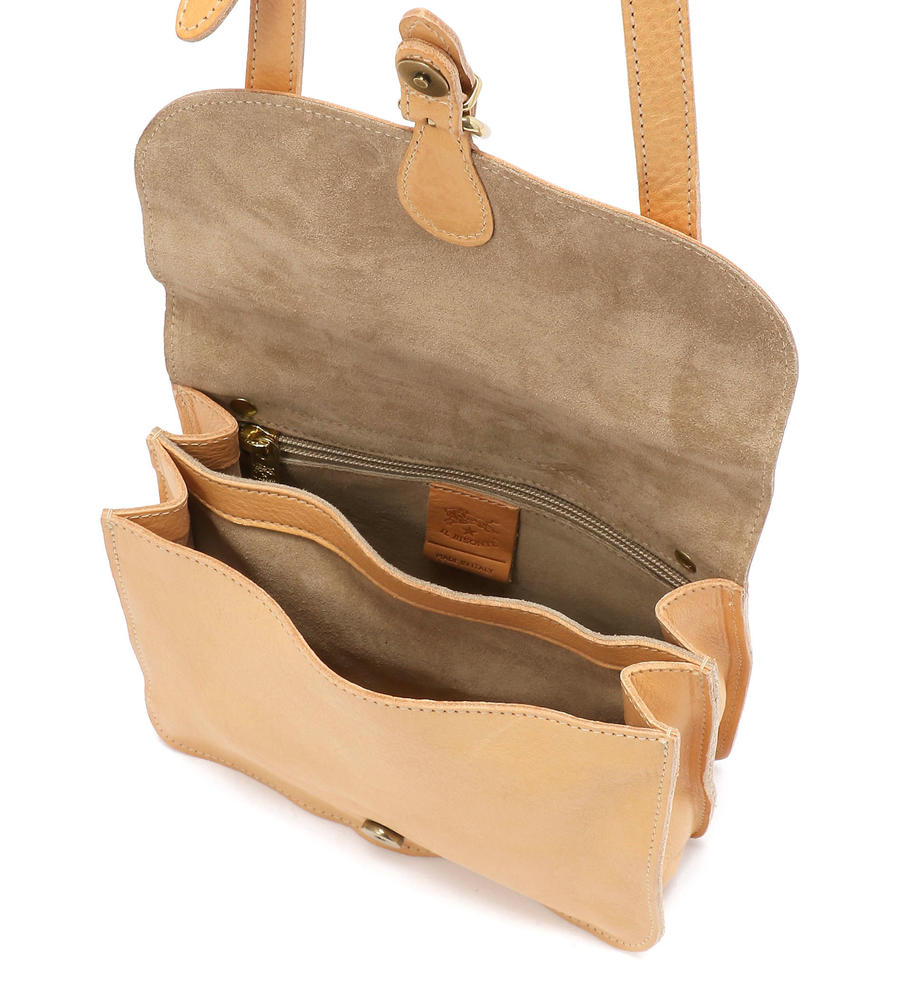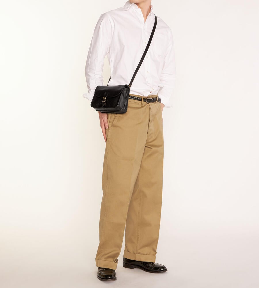 バイソンロゴの型押しとベルテッドデザインがアクセントになったバッグです。開閉はマグネット仕様で中身の出し入れもスムーズ。内側中央に仕切りを設けた二層構造、小物収納に便利なファスナーポケットを備えています。ショルダーベルトは長さの調整が可能です。