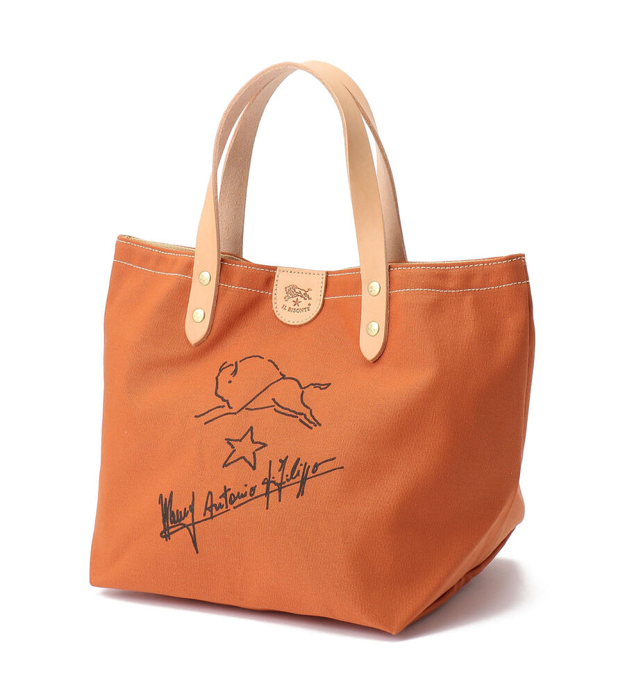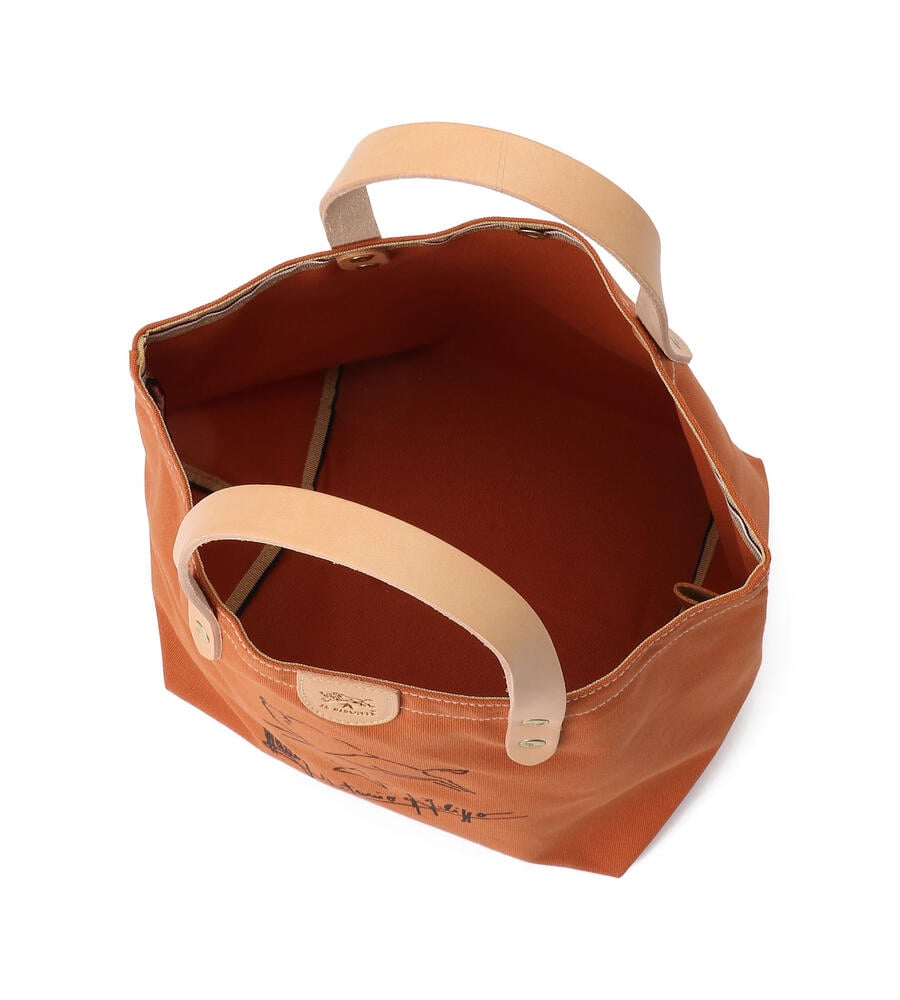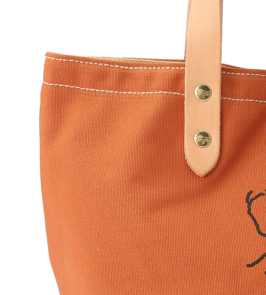 手描きのイラストがプリントされたコットン地のトートバッグ。ハンドルとブランドロゴ入りのタグはレザーを使用し、異素材のコンビで新鮮な表情に仕上げています。間口はスナップボタン仕様。マチつきフォルムで収納力も満足度大。