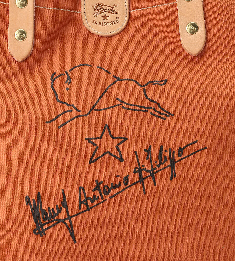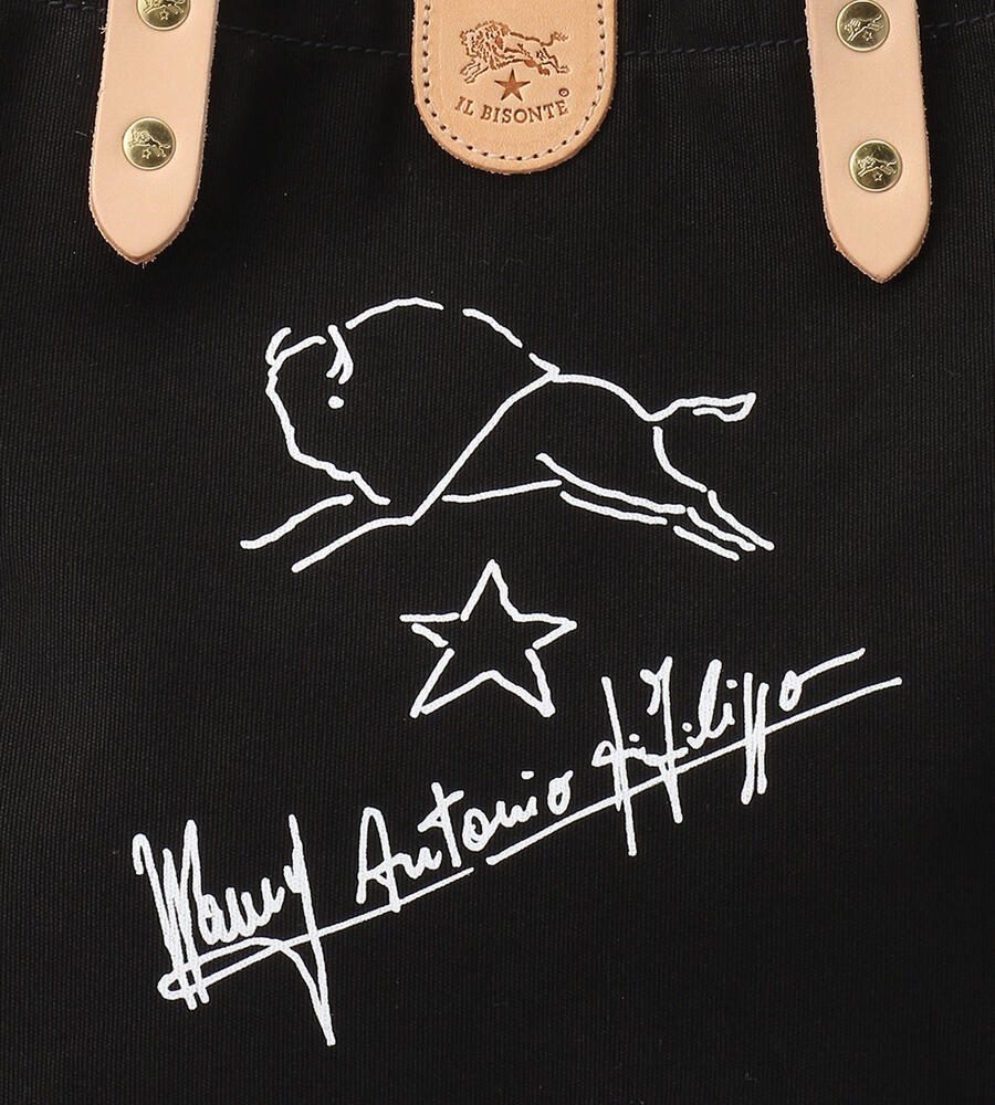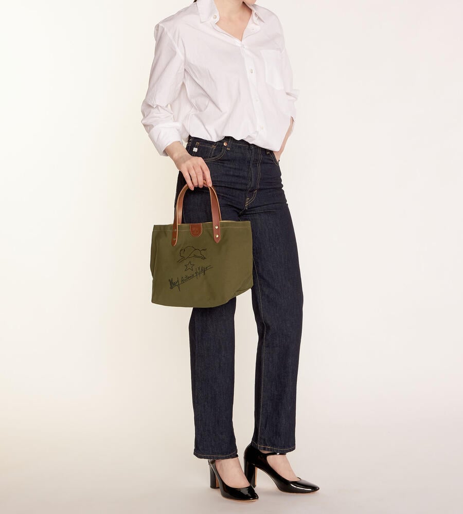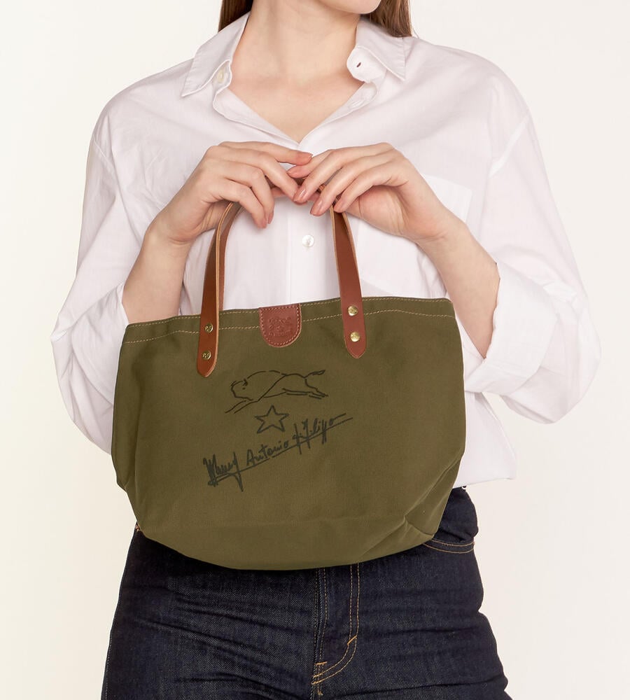 手描きのイラストがプリントされたコットン地のトートバッグ。ハンドルとブランドロゴ入りのタグはレザーを使用し、異素材のコンビで新鮮な表情に仕上げています。間口はスナップボタン仕様。マチつきフォルムで収納力も満足度大。