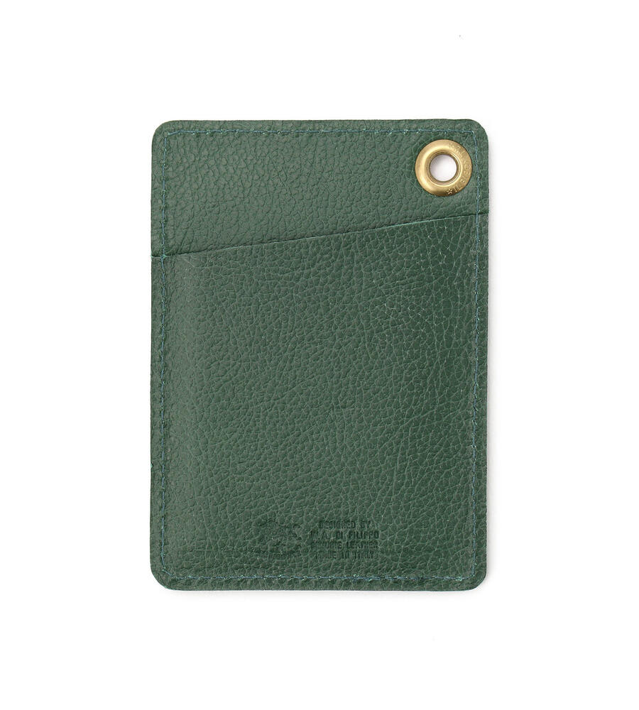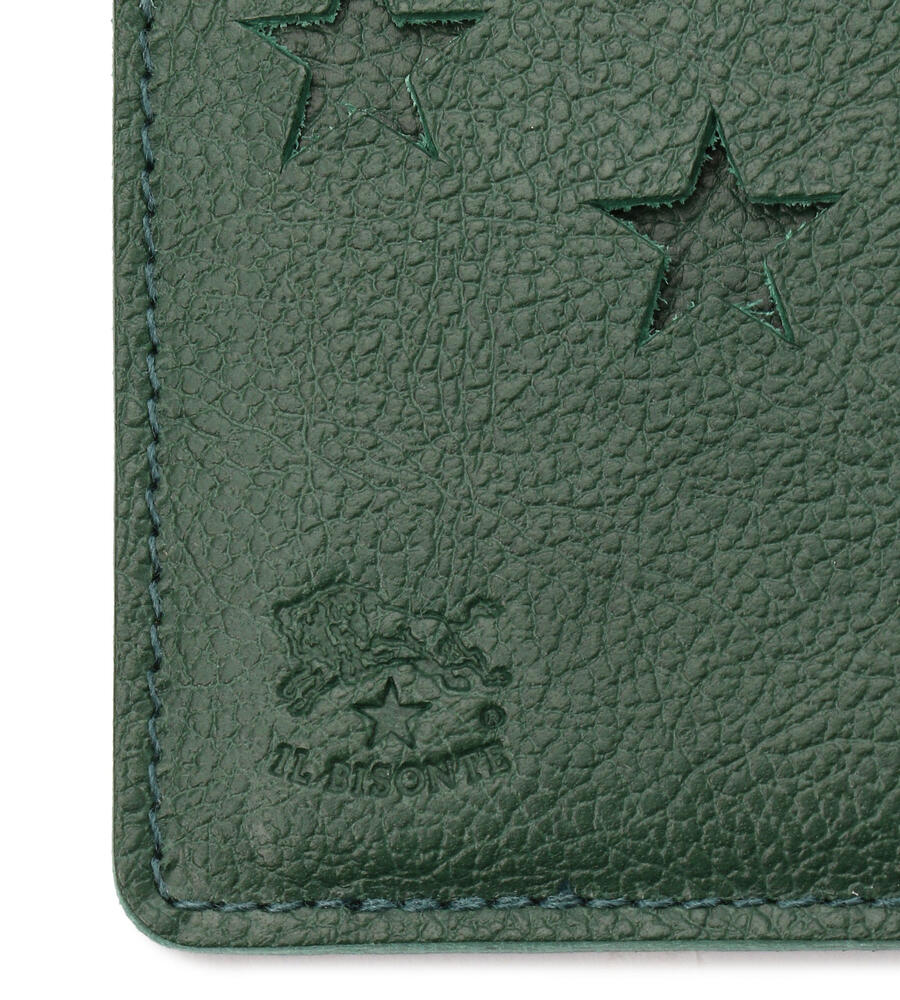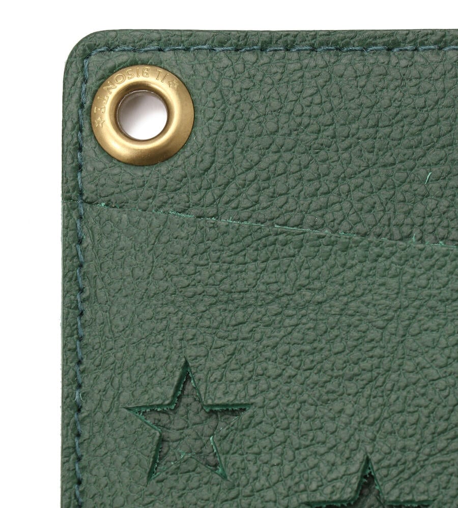 マチを省いた薄型カードケース。両面に収納部を設け、中身を取り出しやすいようポケット口を斜めにカットしています。星型のパンチングとバイソンロゴがアクセント。ハトメにはストラップやキーホルダーの装着も可能です。