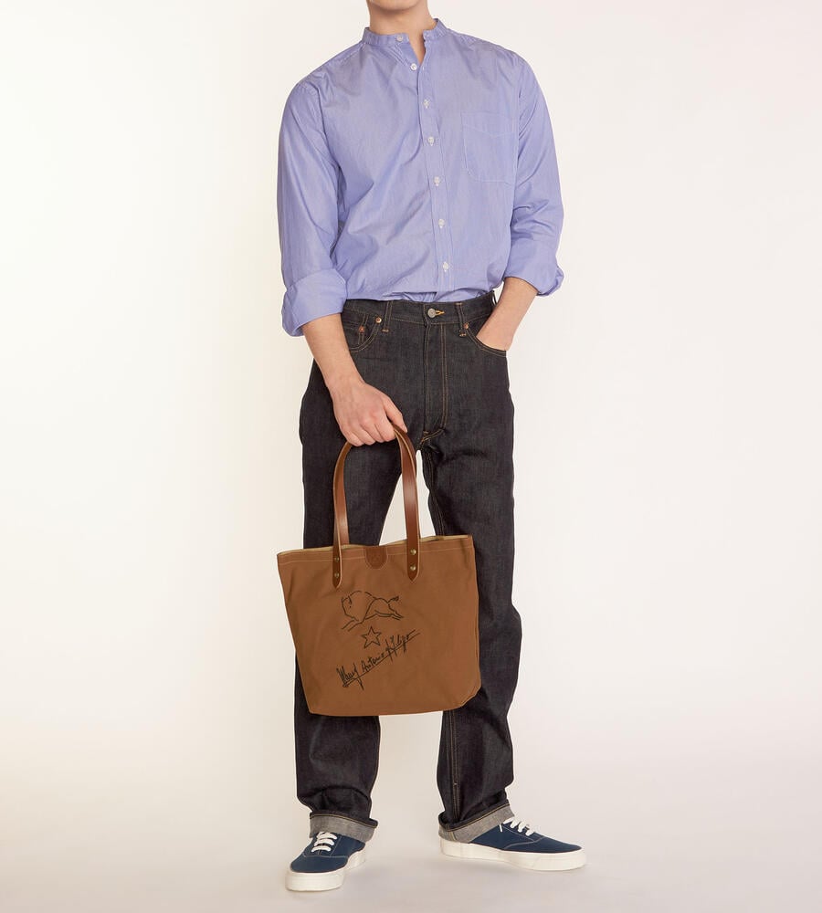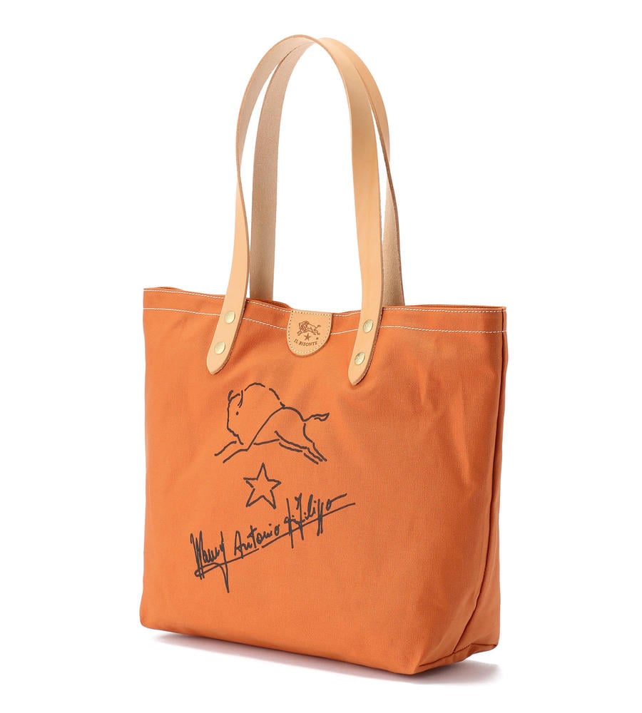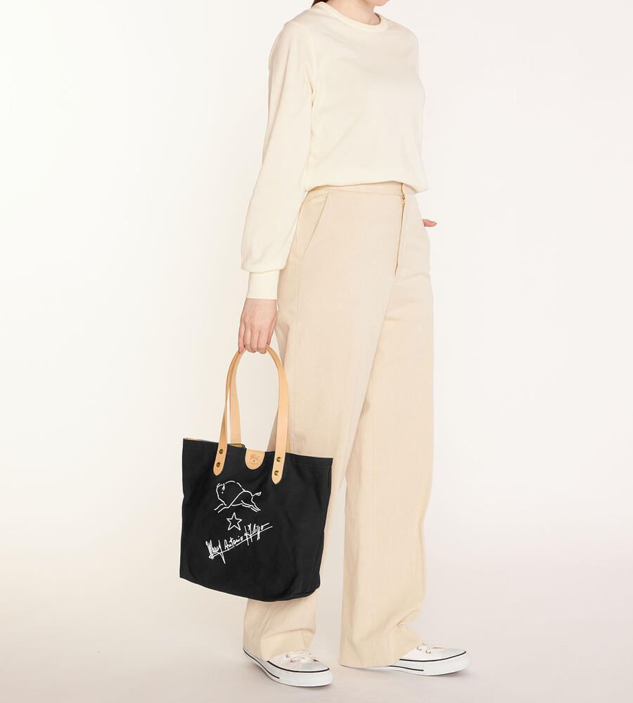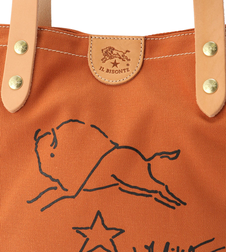 シンプルなキャンパストートバッグに、バイソンの手書き風イラストとサインをあしらった魅力ある一品。開口部のタグや鋲までも刻印をのせ、持ち手はレザーで高級感をプラス。男女問わず持てる大容量トートバッグです。