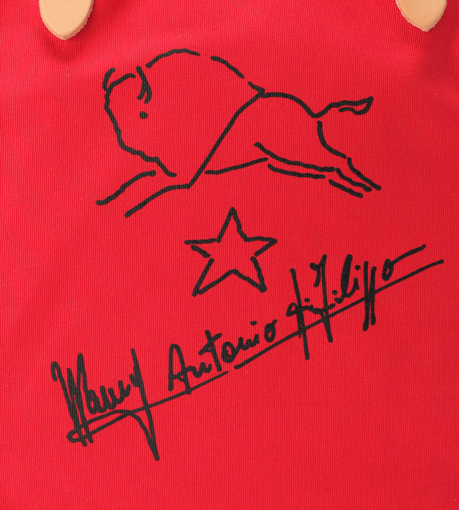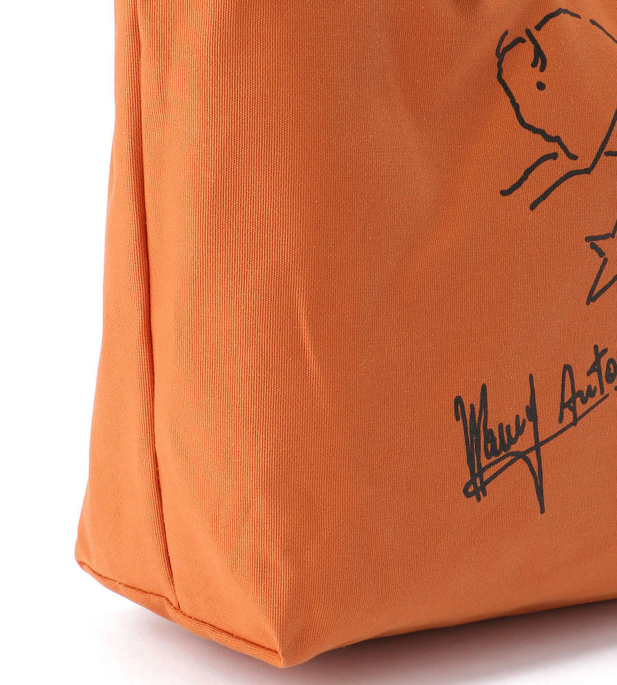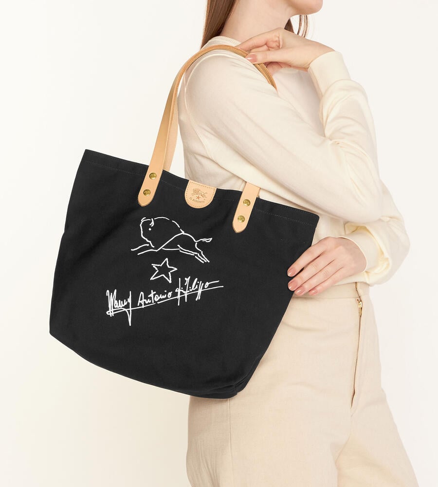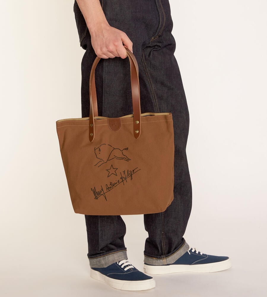 シンプルなキャンパストートバッグに、バイソンの手書き風イラストとサインをあしらった魅力ある一品。開口部のタグや鋲までも刻印をのせ、持ち手はレザーで高級感をプラス。男女問わず持てる大容量トートバッグです。