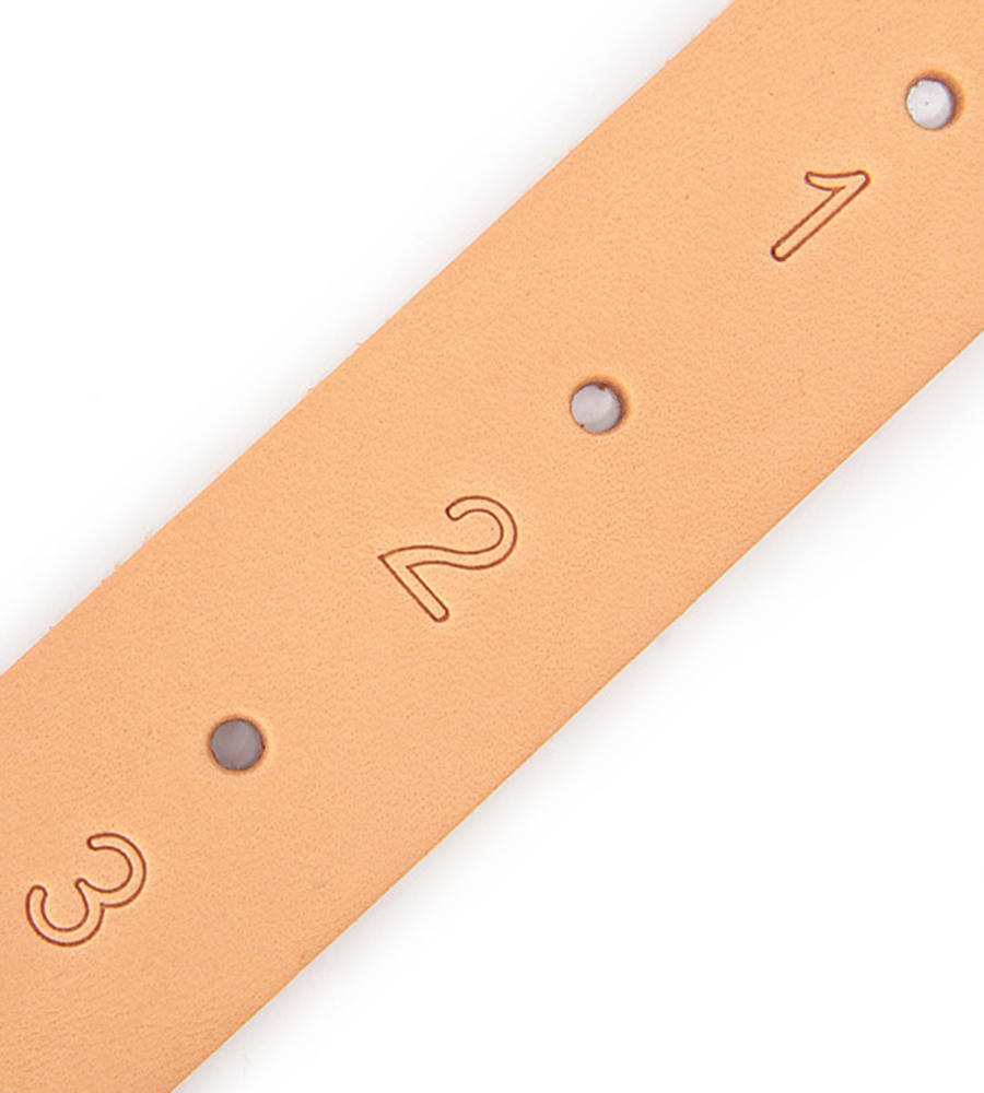 オリジナルレザーのシンプルなベルトは、使い込むほどに愛着がわくアイテム。ベルトの穴と穴の間にナンバーを刻印しており、シンプルながらも遊び心を利かせたアイテムとなっています。