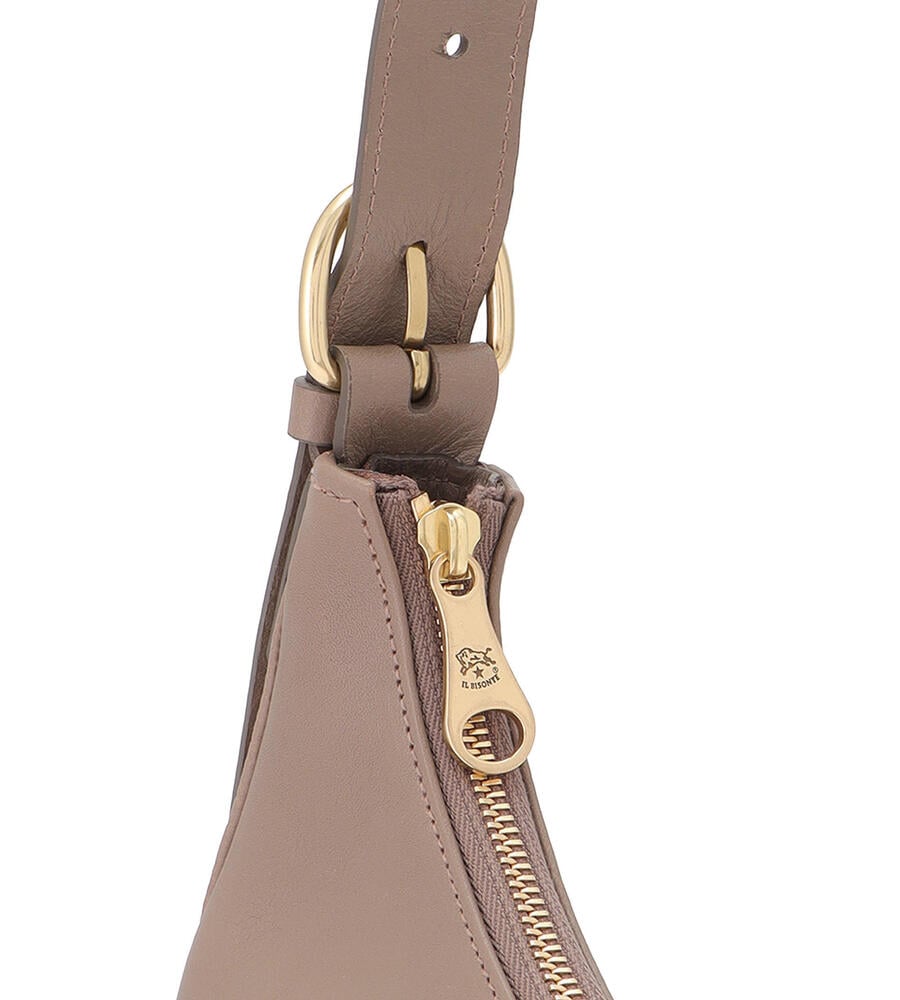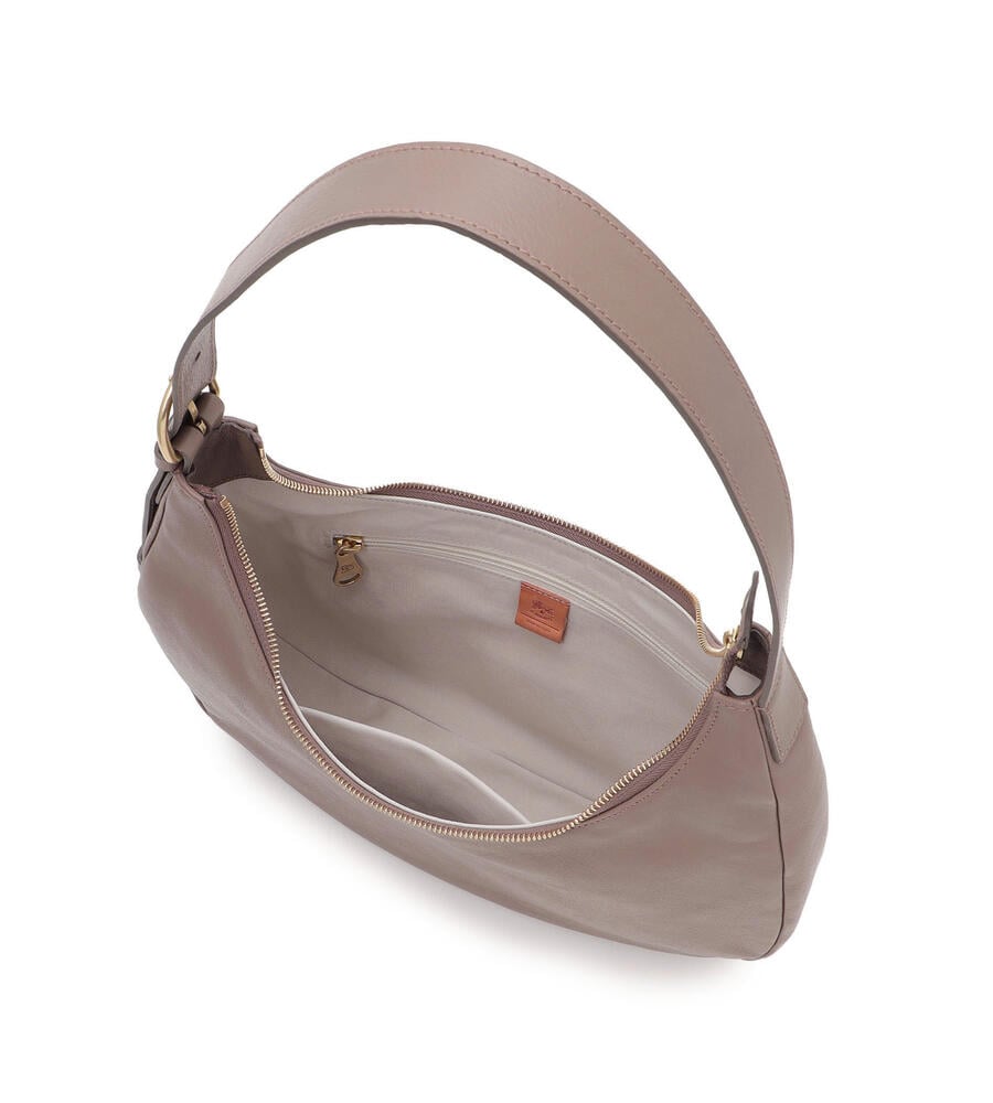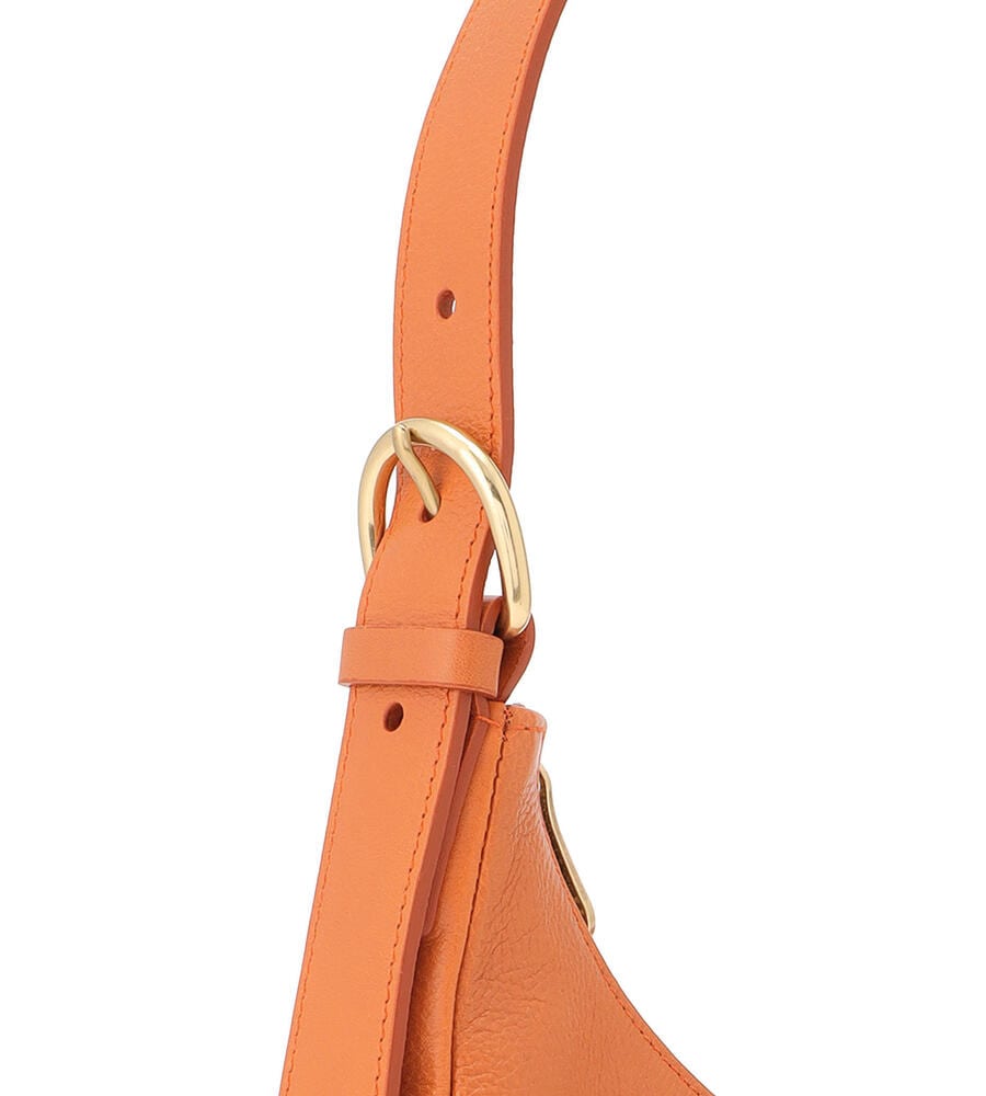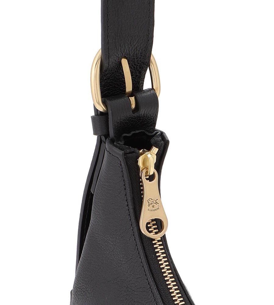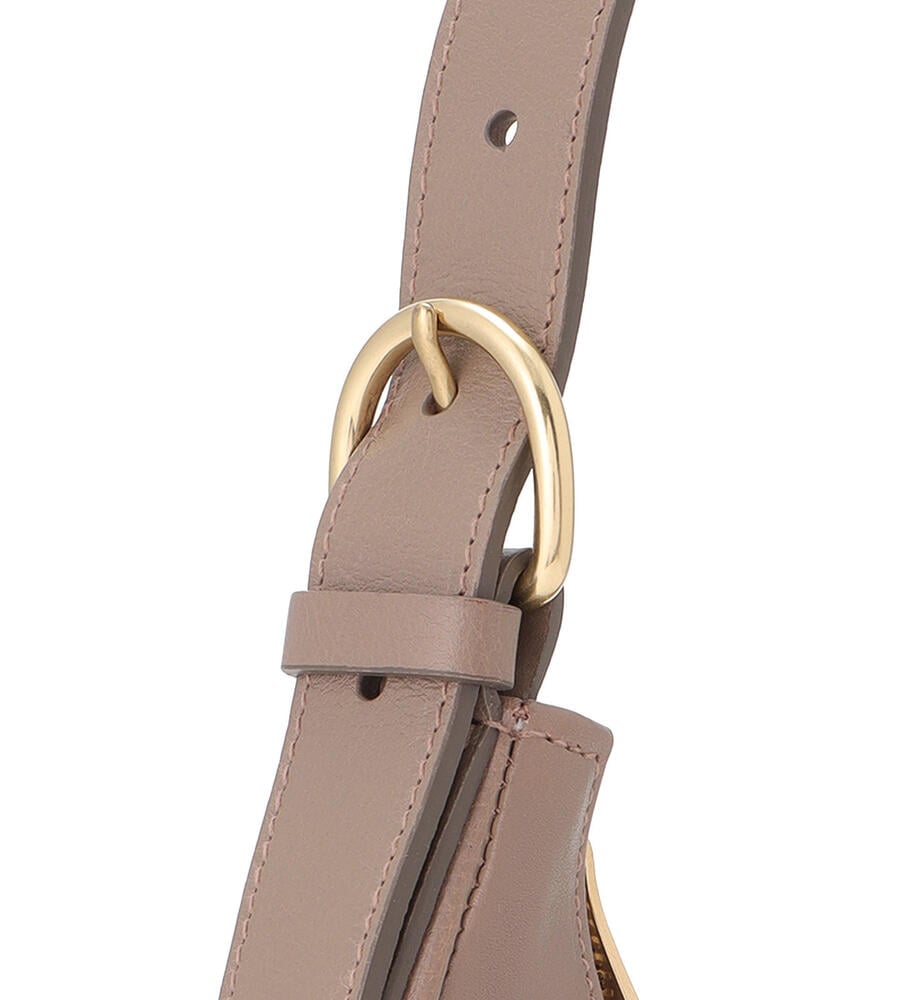 品があり肌触りの良いカーフスキンで仕立てられたショルダーバッグ。ブランドロゴの型押しがワンポイントのスタイリッシュなデザイン。ショルダーとアームにぴったりと沿うカーブライン、小ぶりなシルエットが魅力。中面はファスナー付きのポケットで小物の整理がしやすく機能面も優秀。お出かけに便利なアイテムです。