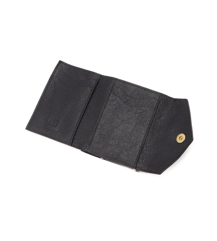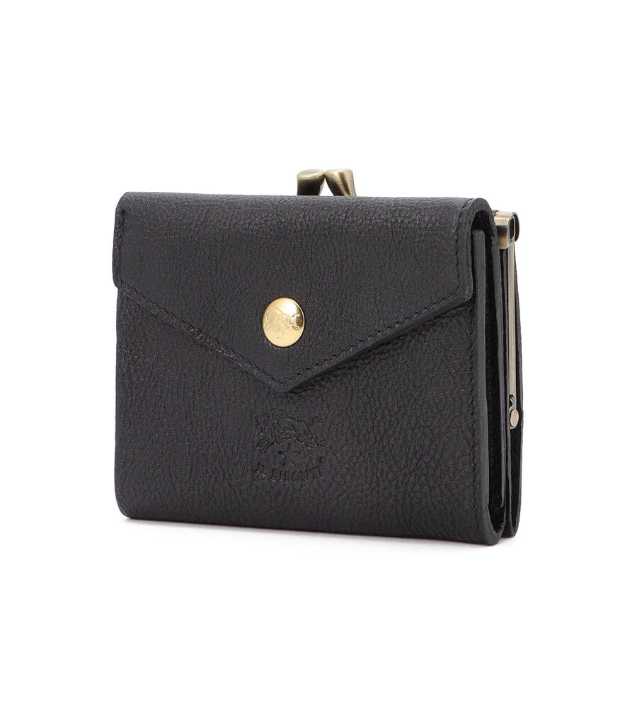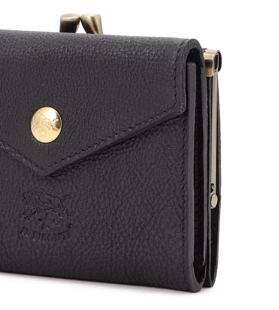 イルビゾンテのロゴをフロントとスナップボタン部分に型押しした、スタイリッシュなデザインの2つ折り財布。イルビンゾンテらしい、上質でマットな革素材が魅力。小銭入れ部分は立体的ながま口仕様で中が見やすく出し入れしやすいのもポイント。トレンドレスなデザインで長く愛用できるアイテムです。
