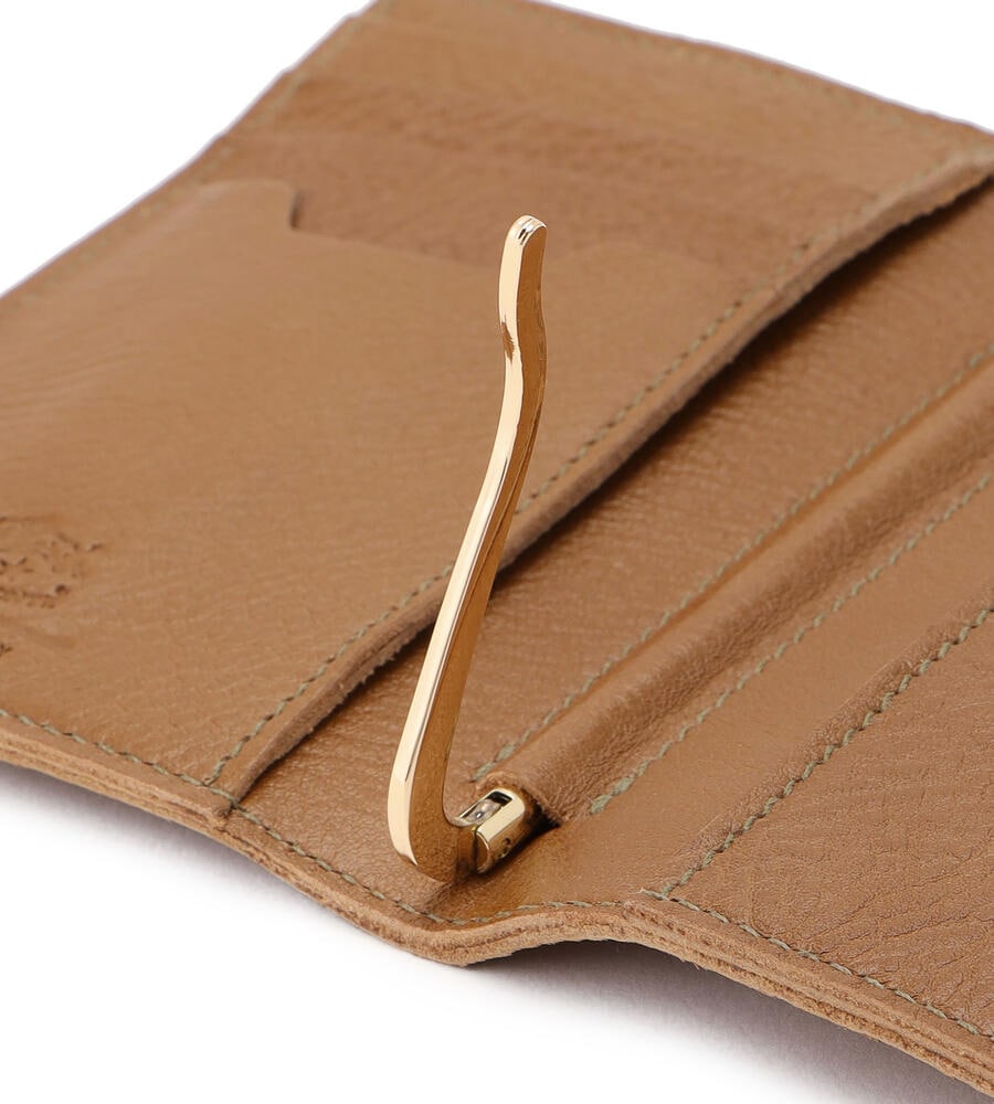 表情のある美しいレザーで仕立てた、マネークリップ付きの折財布。ブランドロゴを表と中面にさりげなく型押しした、スタイリッシュなデザインが魅力。2つ折りで、中はゴールドのクリップと両側に配された豊富なカードホルダーのシンプルな仕様。キャッシュレス時代にぴったりなエレガントなアイテムです。