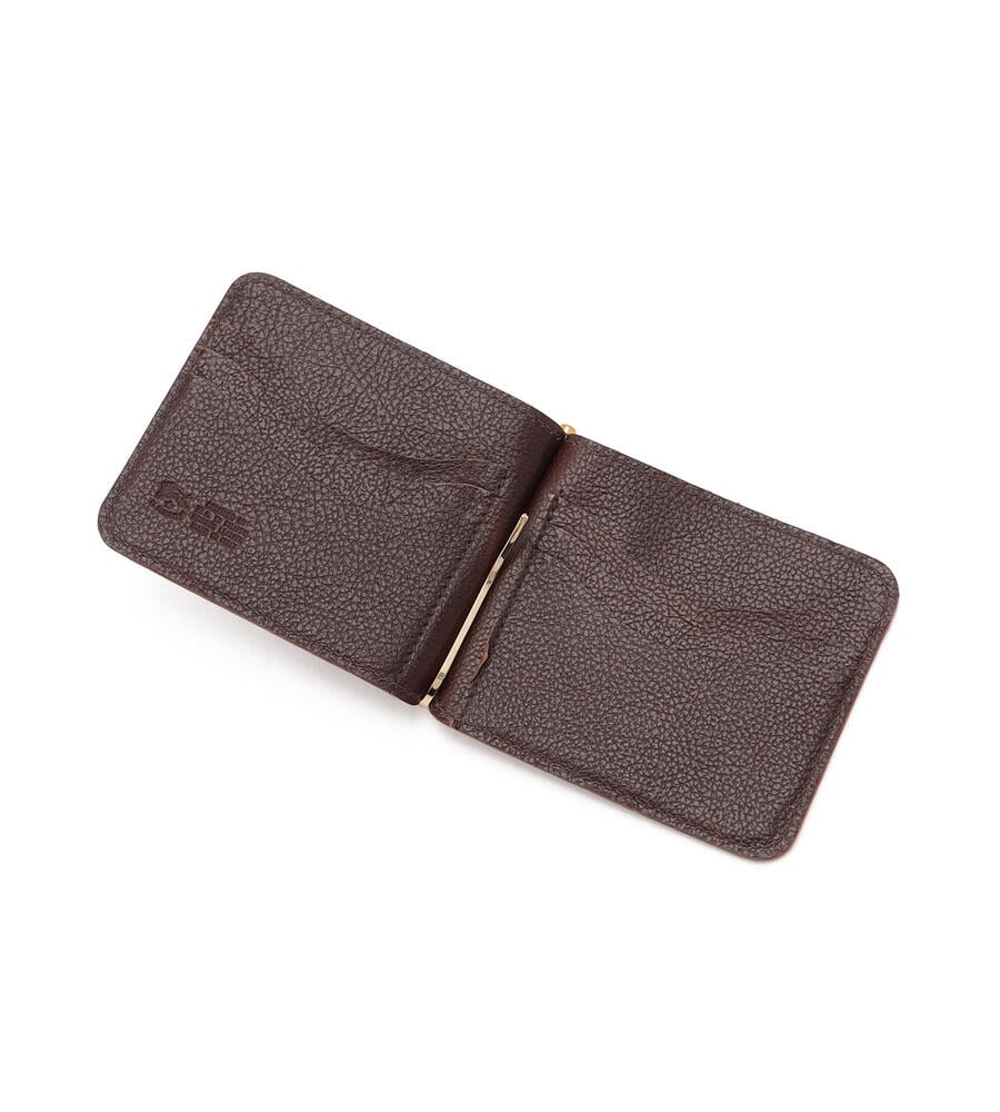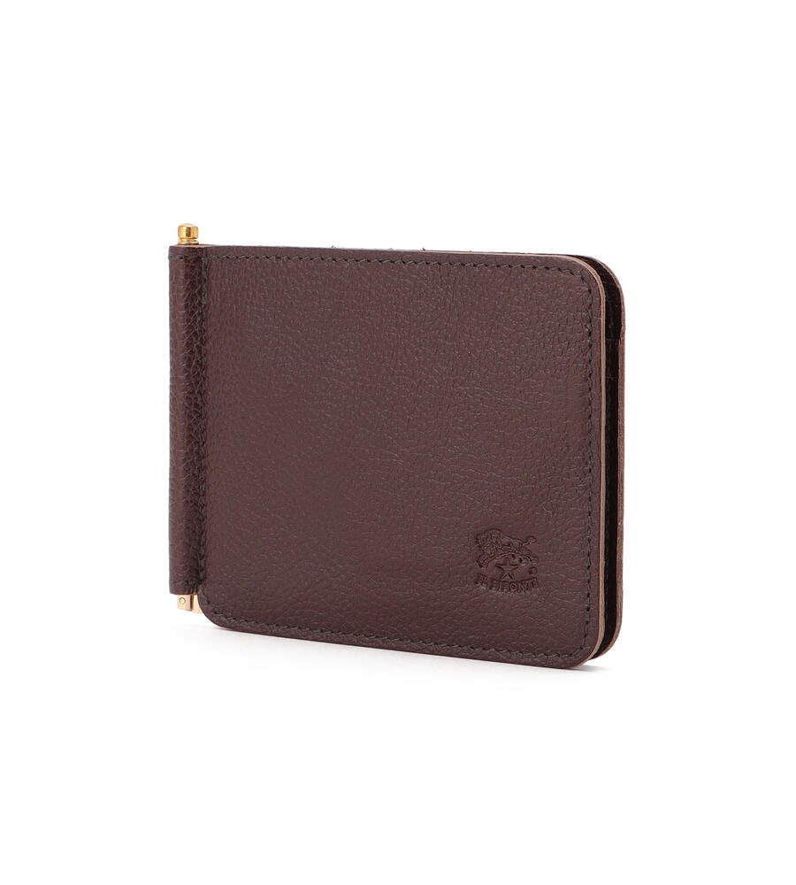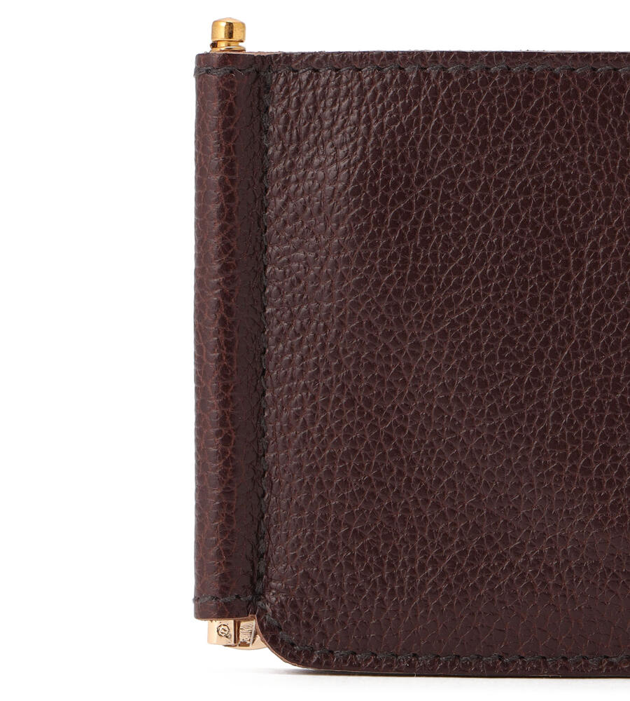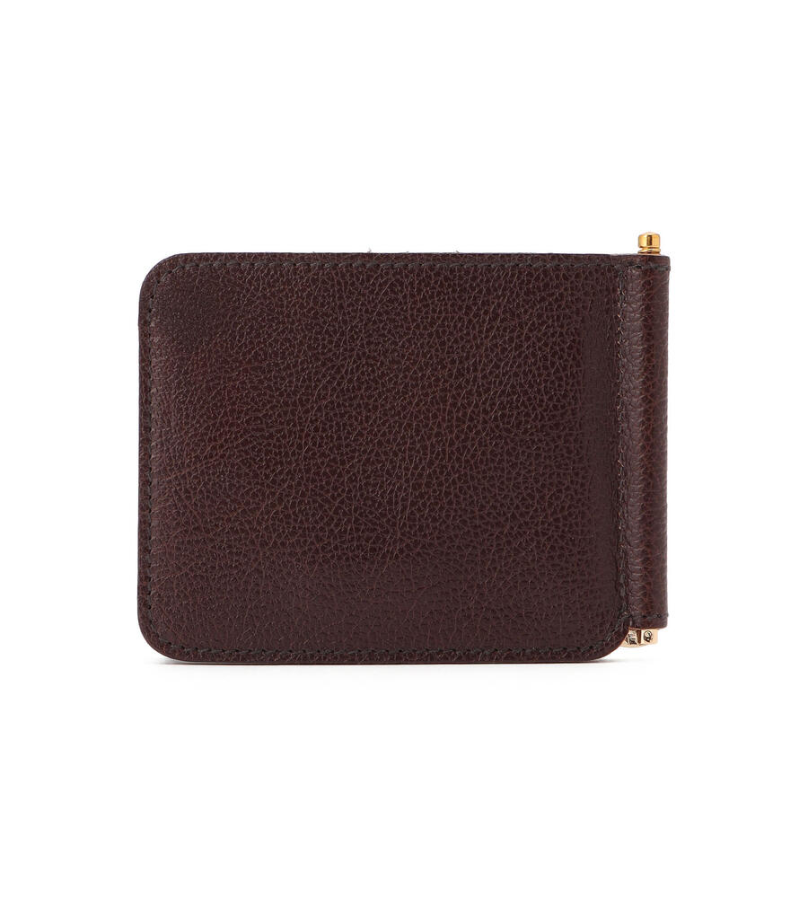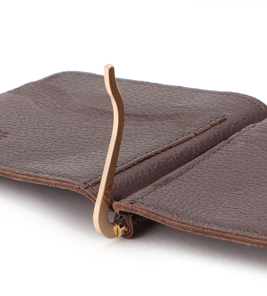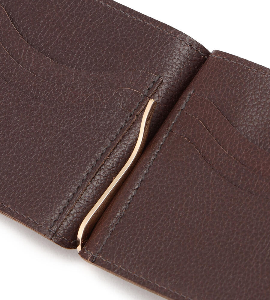 天然の美しいレザーで仕立てた、マネークリップ付きのスリムな折財布。ブランドロゴを表と中面にさりげなく型押しした、スタイリッシュなデザインが魅力。2つ折りで、中はゴールドのクリップと両側に配されたカードホルダーのシンプルな仕様。キャッシュレス時代にぴったりなエレガントなアイテムです。