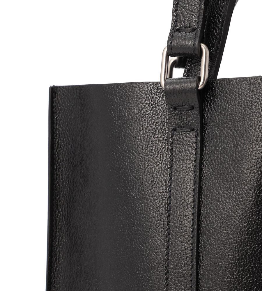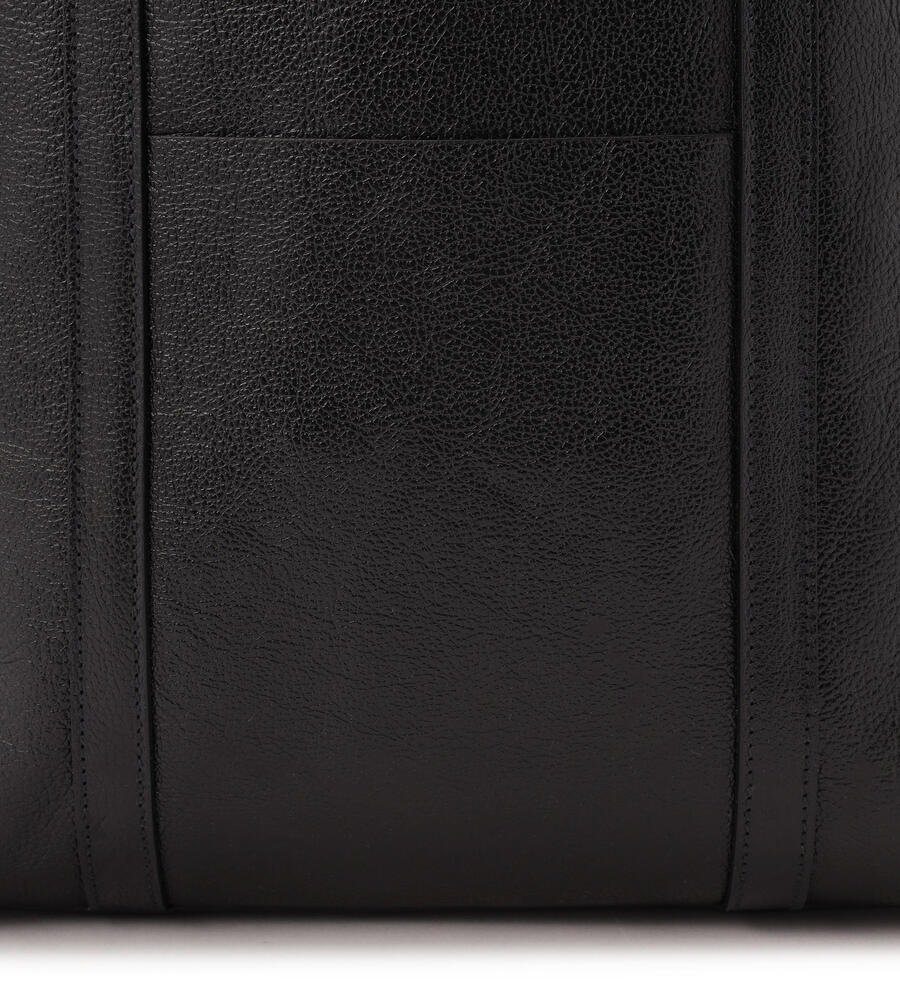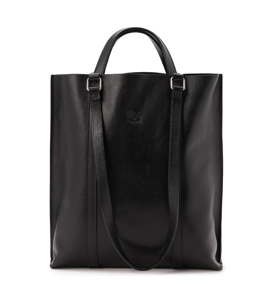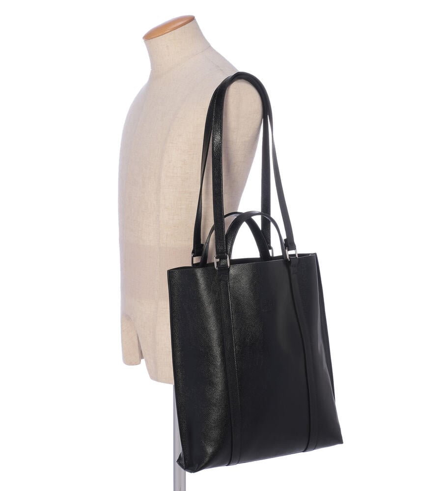 手持ちとショルダー、お好みで持ち方を選べるレザートートバッグ。前面にはブランドロゴの型押しをあしらい、背面には小物収納に便利なアウトポケットを配置。シンプルなデザインはスタイリングしやすく、シーンを選ばずに活躍します。