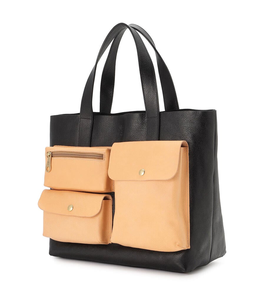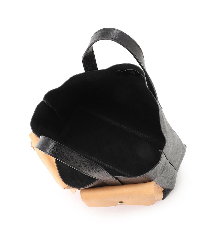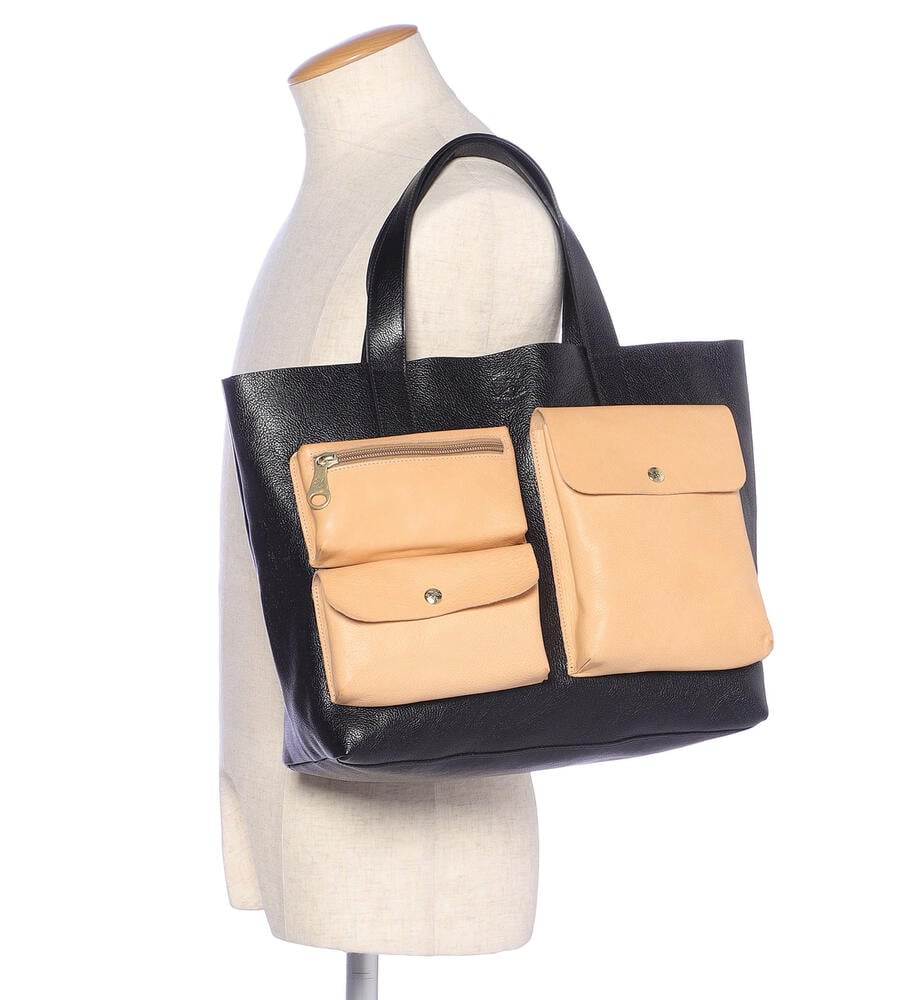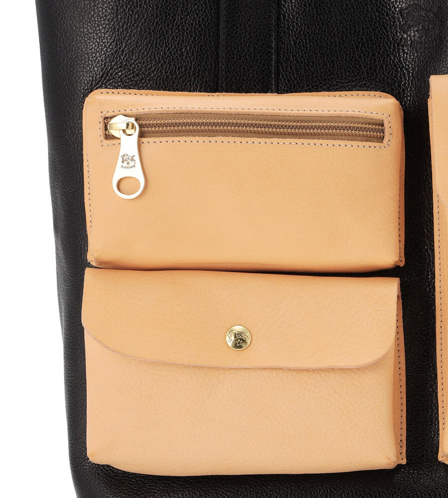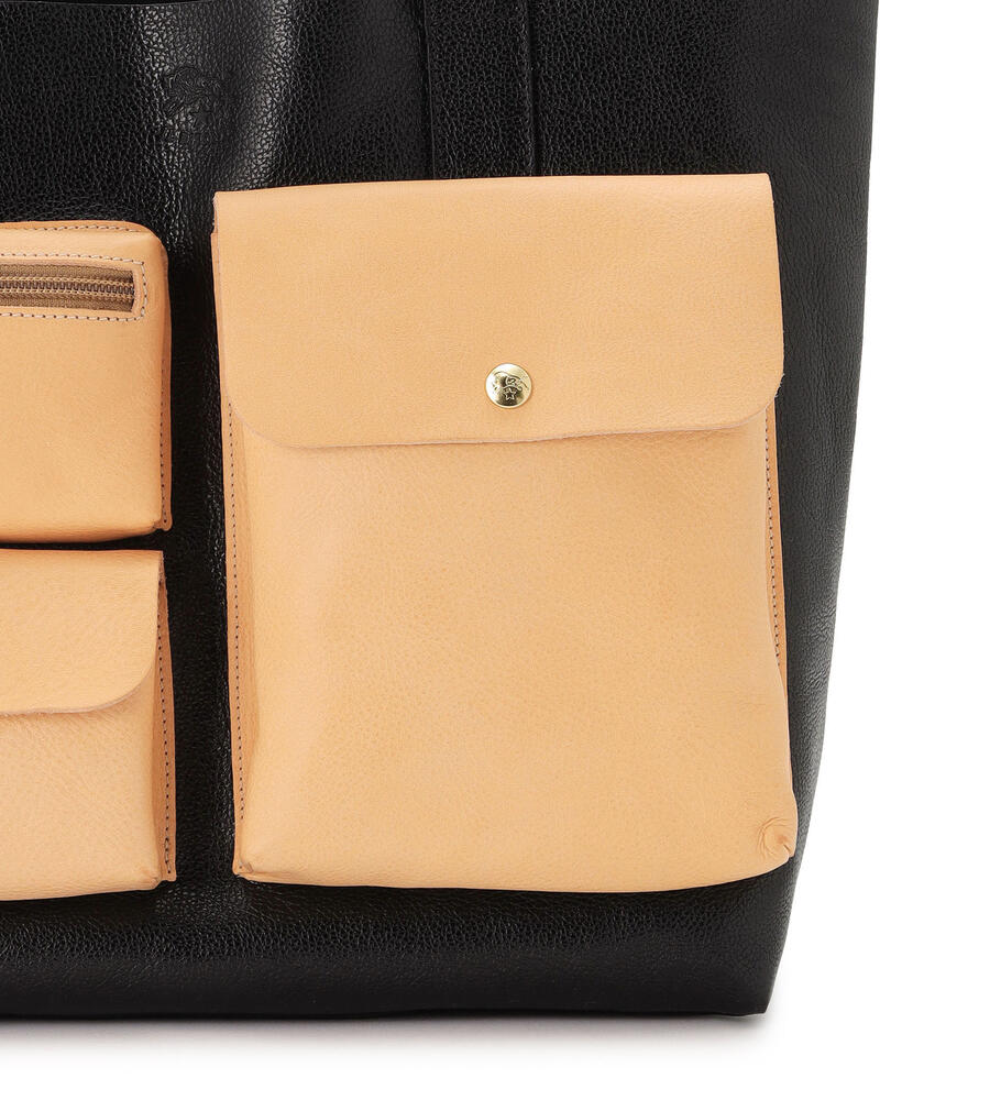 ブラックレザーにアイコニックなヌメ革のポケットを配した、遊び心あふれるデザイン。イル ビゾンテの職人技を活かした立体的なつくりは、ユニークな見た目と使いやすさを両立。ヌメ革ならではのエイジングもお楽しみいただけます。