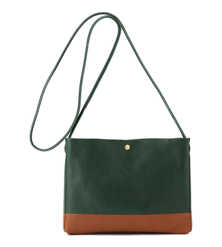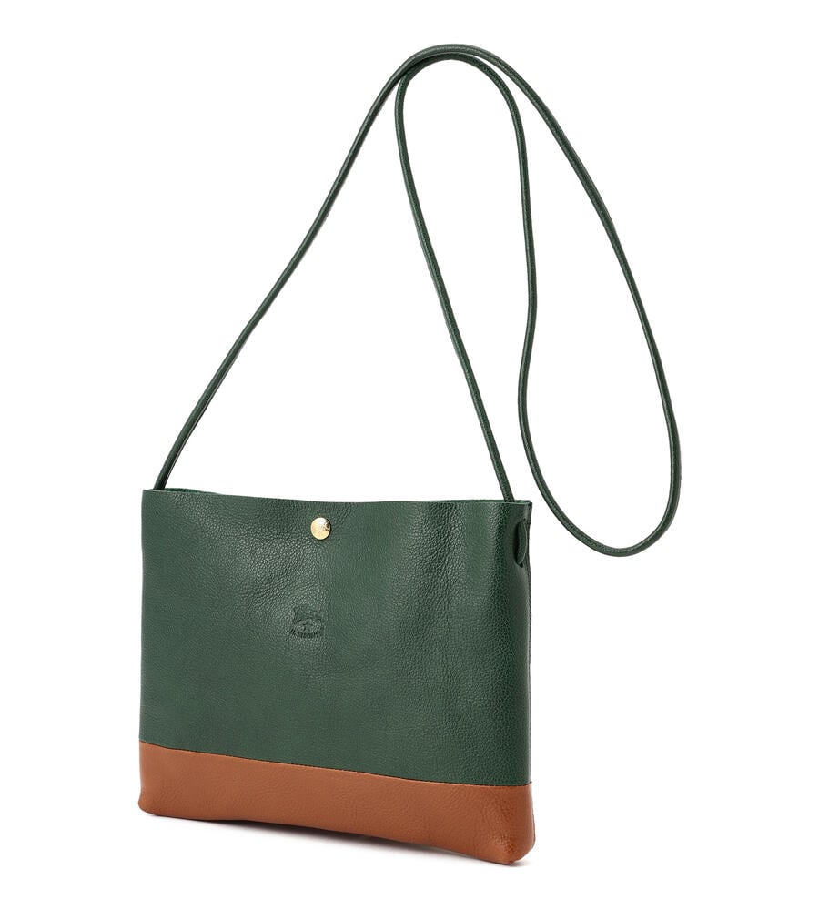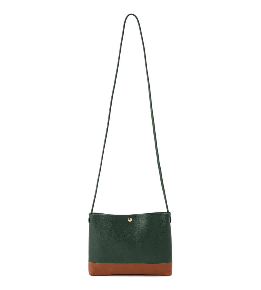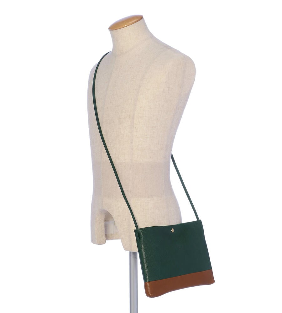 大きすぎないサイズに薄型のシルエットですっきりと持ち運べるクロスボディバッグ。切り替えデザインのメリハリが印象的です。ロゴマーク入りのメタリックなボタンや型押しがアクセントとして効いています。