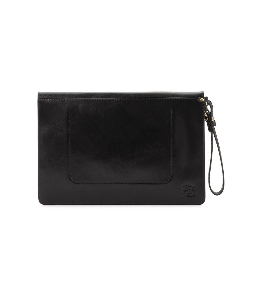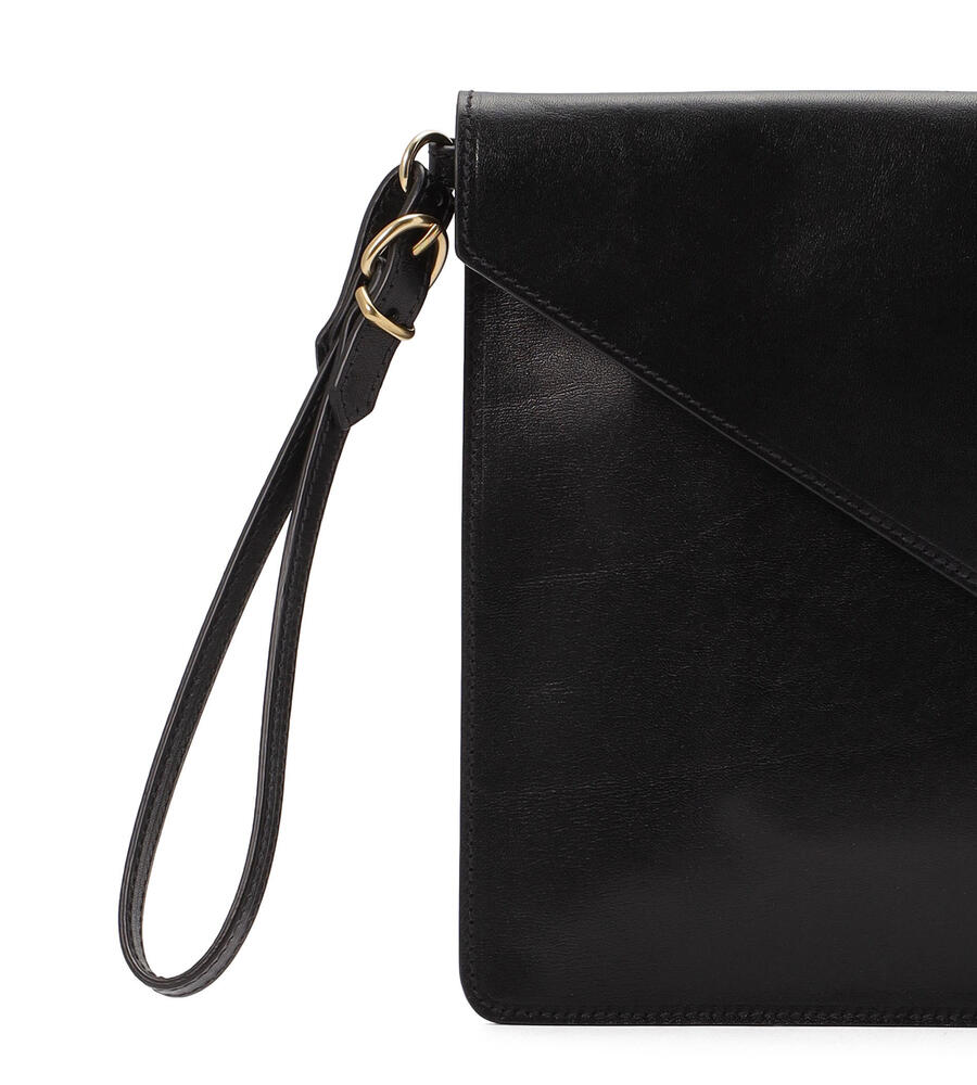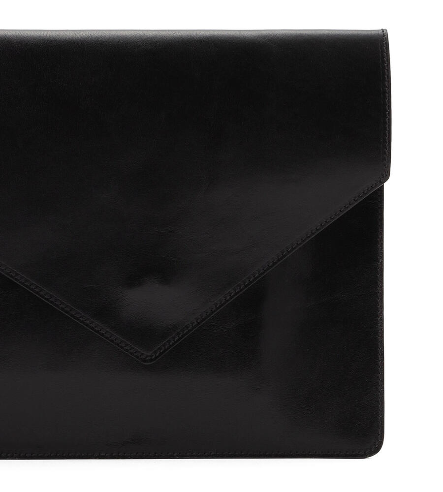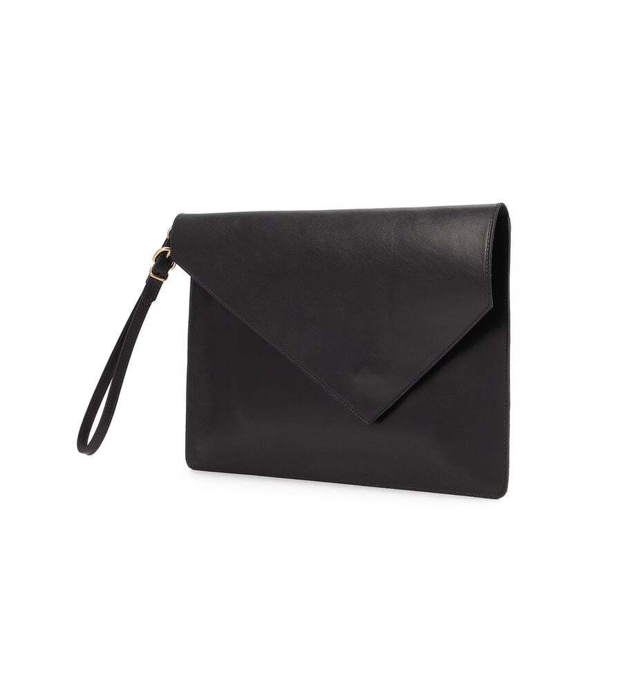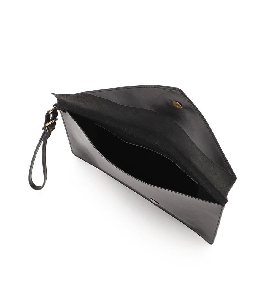折り紙を思わせるフラップ使いが特徴的なクラッチバッグ。余分な装飾を控えて、素材の上質さが際立つ仕上がりになっています。マグネットボタンで開閉するシンプルなつくり。財布やスマートフォンや鍵など、身に着けておきたい小物をすっきりと収納できるサイズ感です。フロントサイドにロゴの型押し入り。