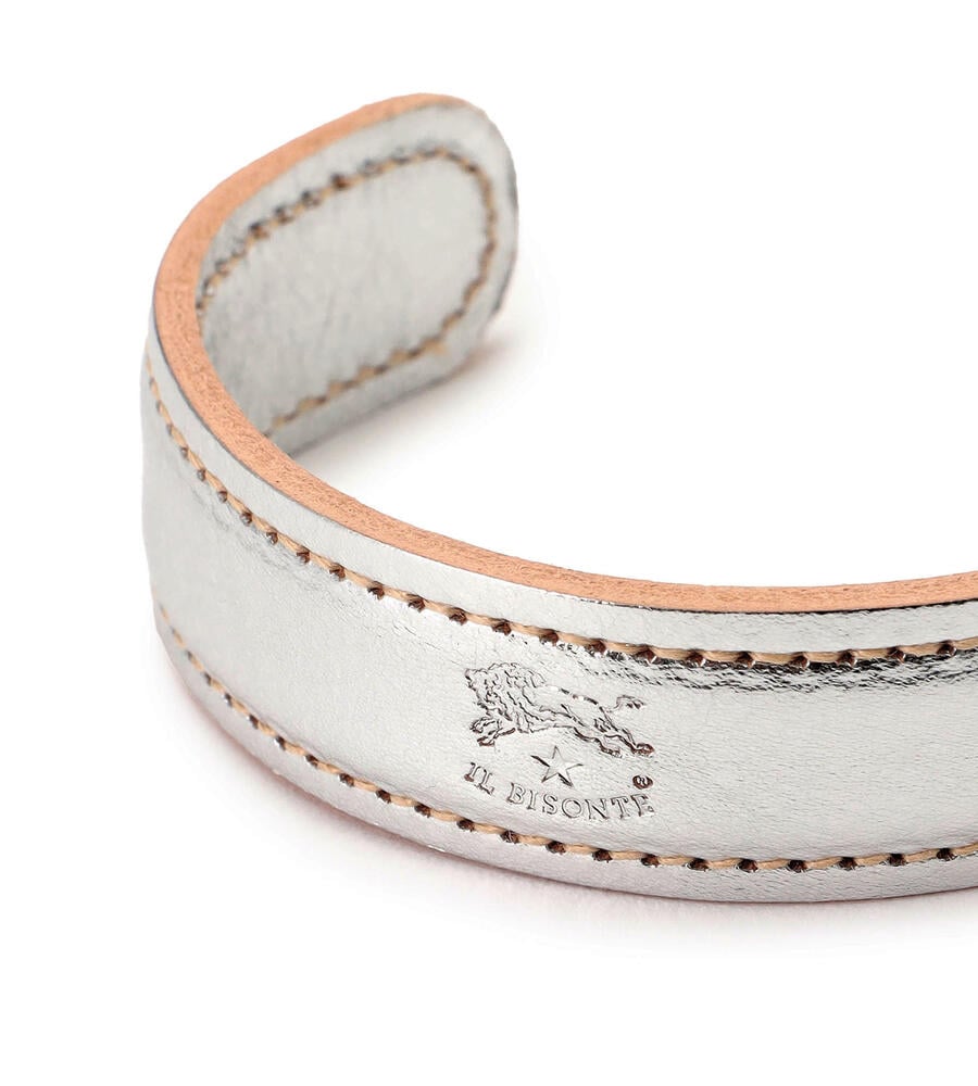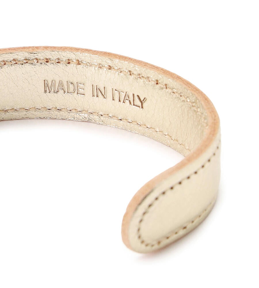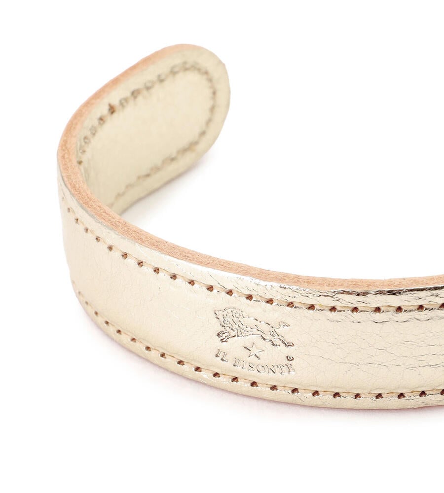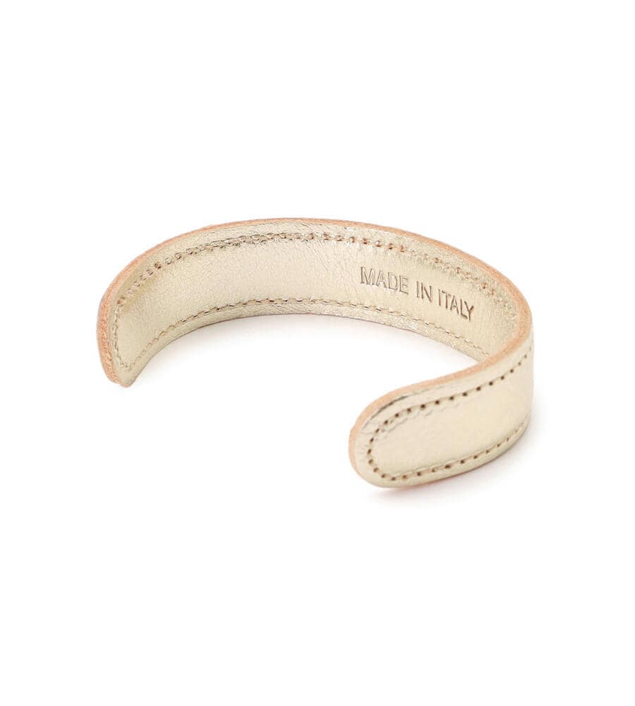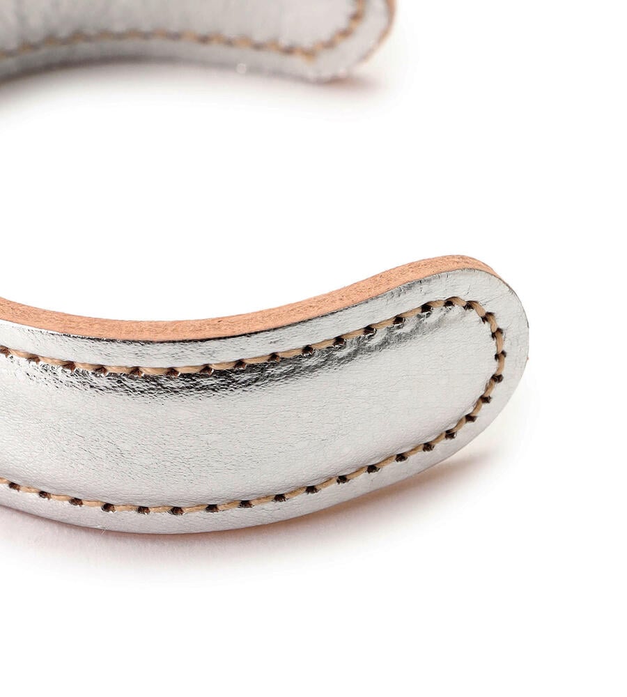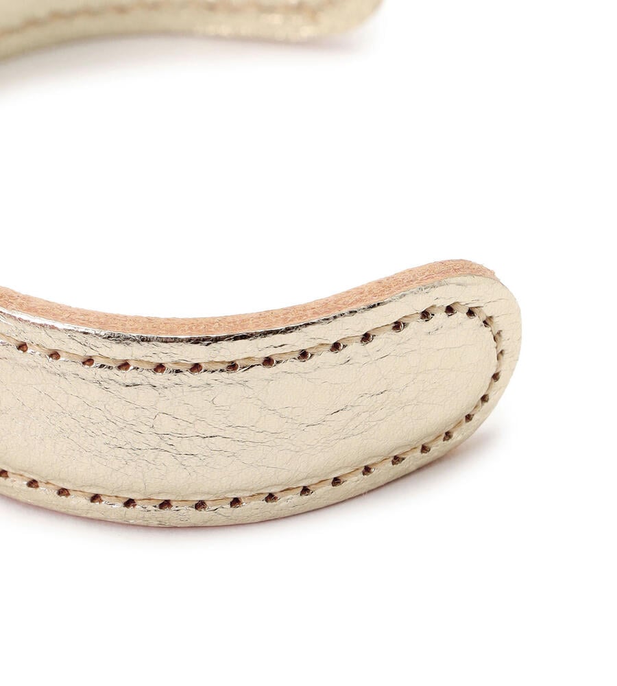 センターにブランドロゴの型押しをあしらった、メタリックカラーのレザーバングル。シンプルながらも洗練されたデザインが、手元のアクセントとして存在感を発揮します。コーディネートに取り入れやすく、さりげなく華やぎをプラスしたいときにおすすめのアイテムです。