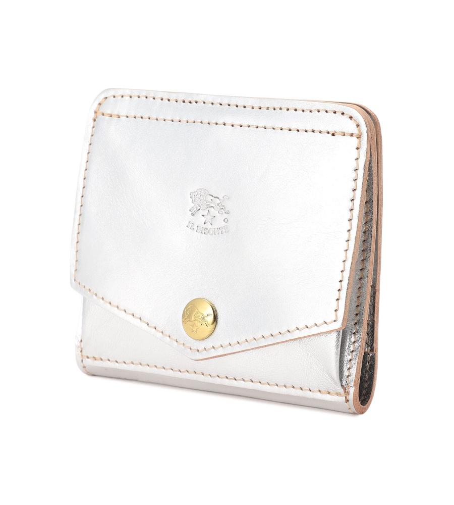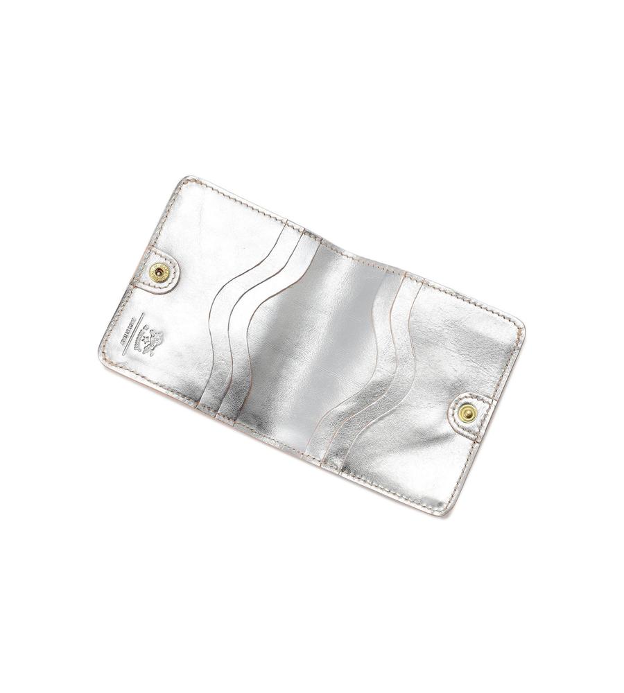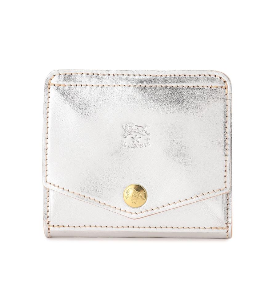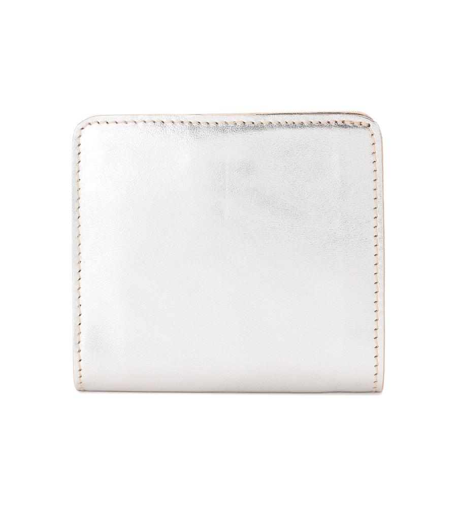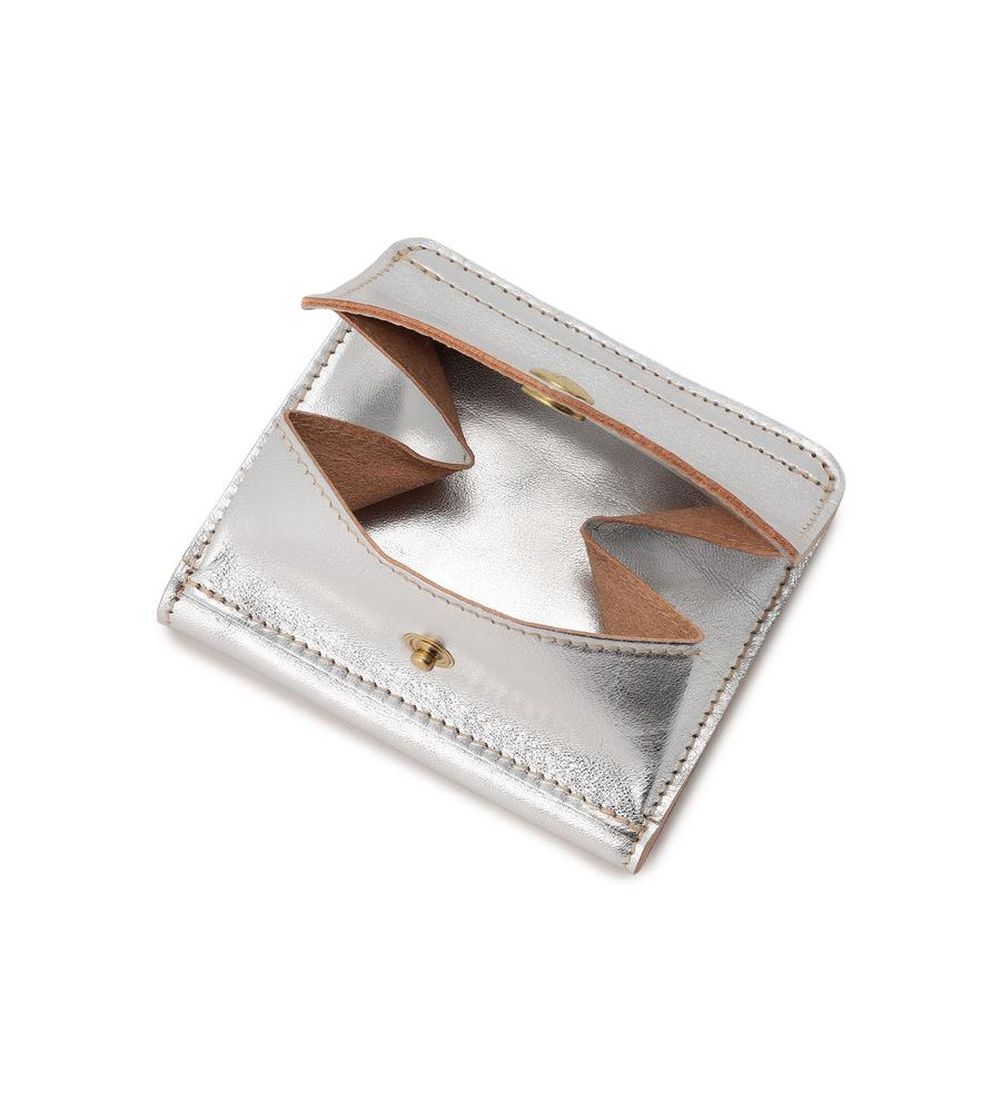 メタリックカラーが華やかなミニウォレット。フロントのブランドロゴの型押しがおしゃれなアクセント。コンパクトなサイズ感でミニマルなお出かけスタイルに最適。コンパクトながらも立体的なコインケース、カード入れ、お札入れ付きで使い勝手も抜群のアイテムです。
