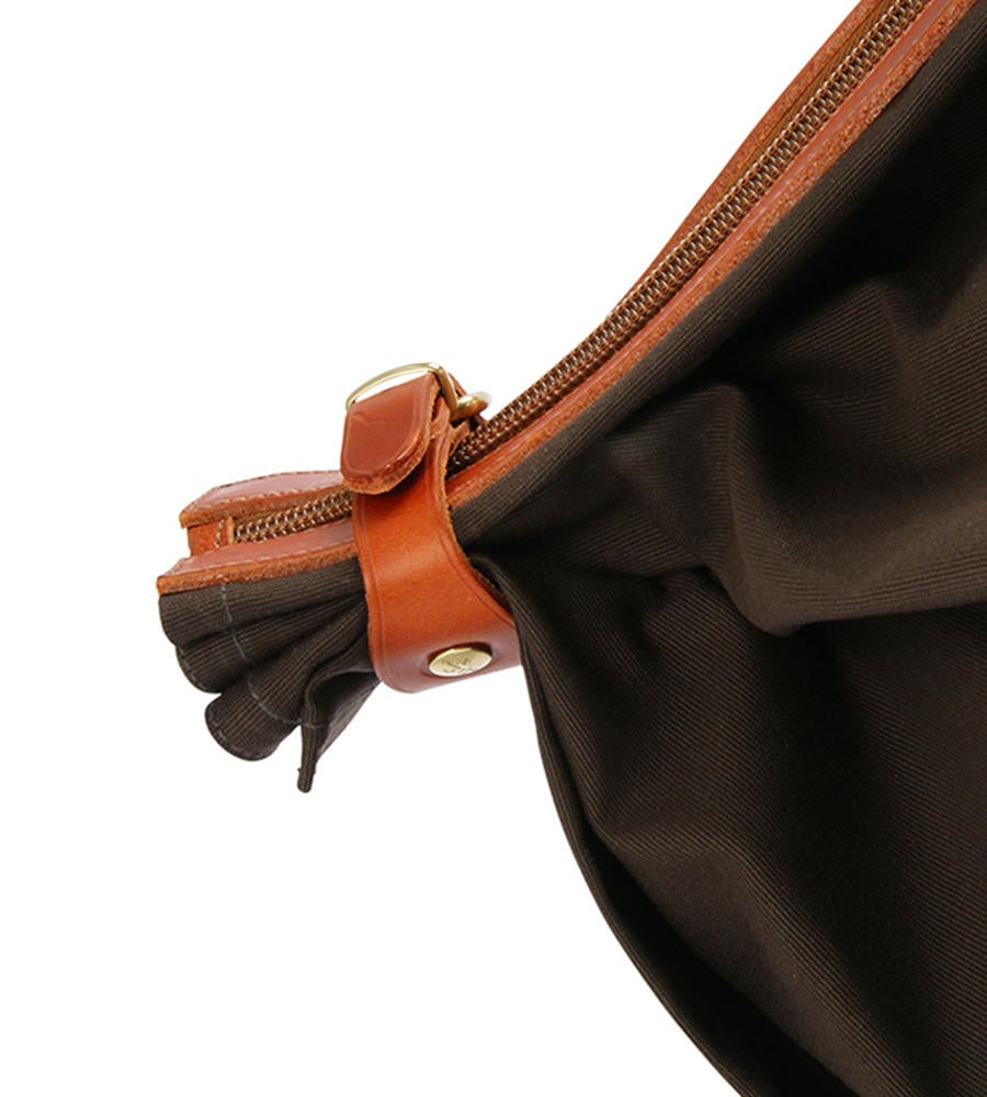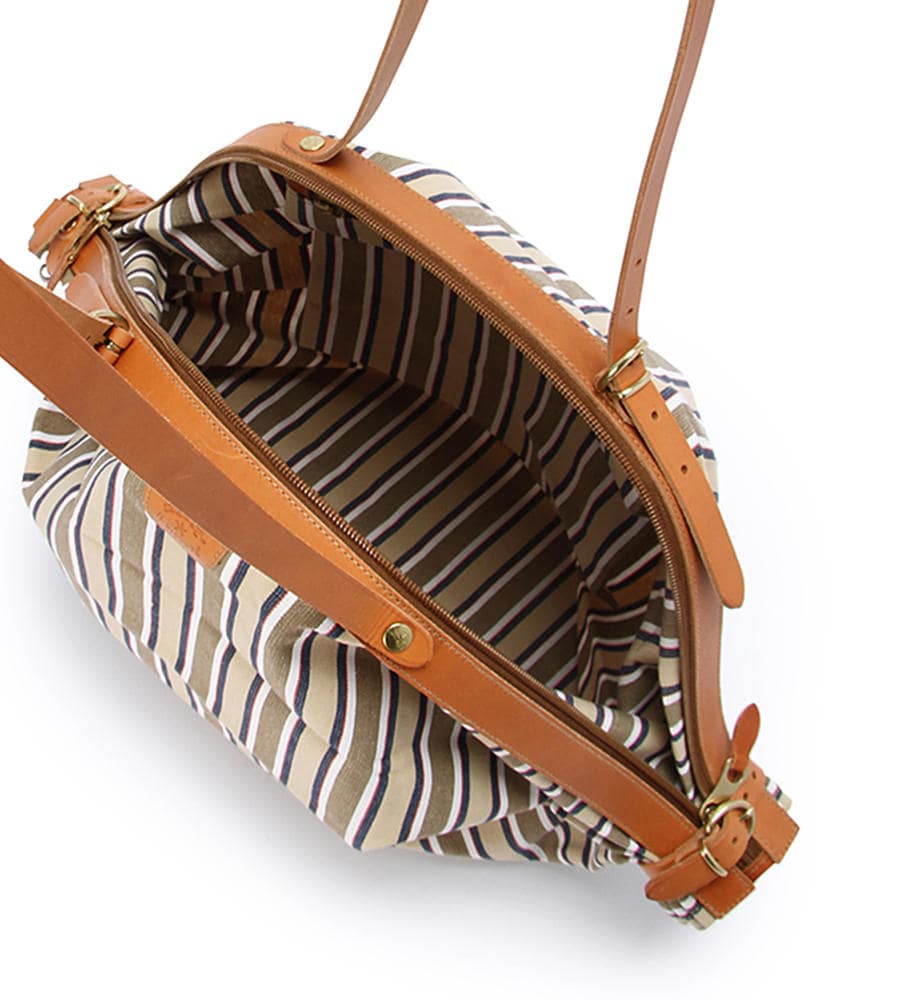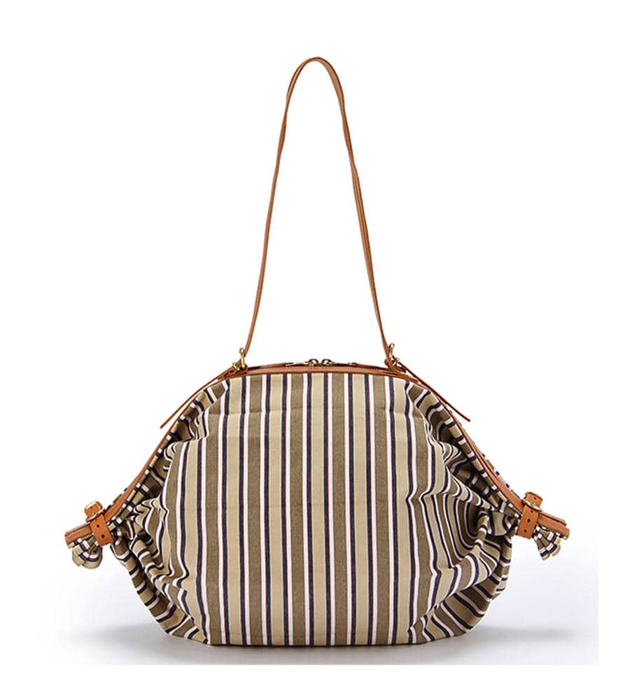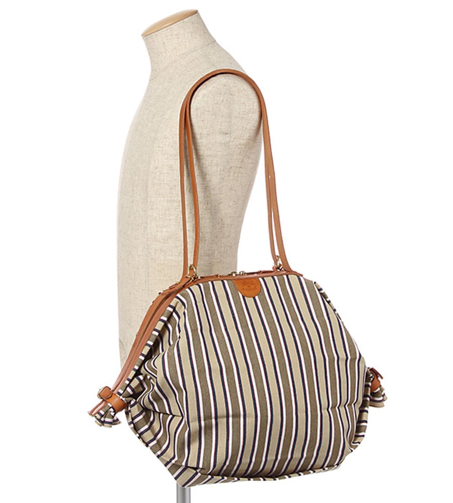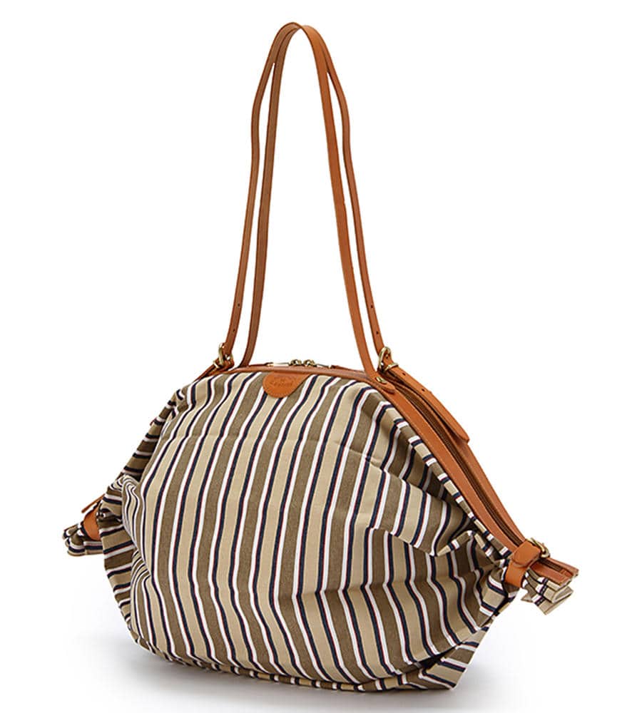 両サイドをレザーベルトで固定することで、キャンディのようなかわいい形になるショルダーバッグ。サイドのベルトを外すことで、大容量バッグに変身します。キャンバス素材で軽く、旅行バッグとしても、使いやすいアイテムです。