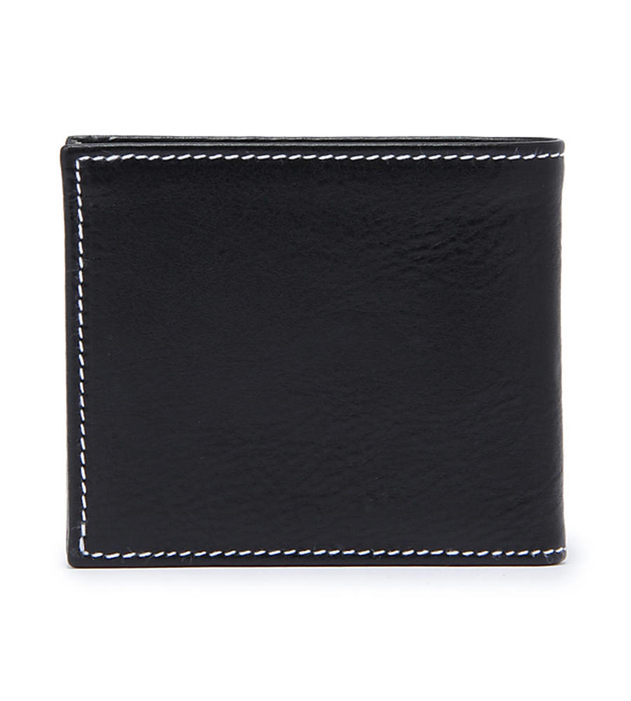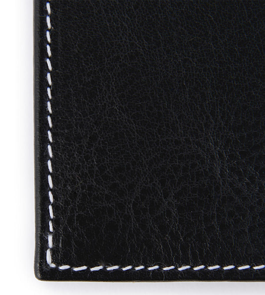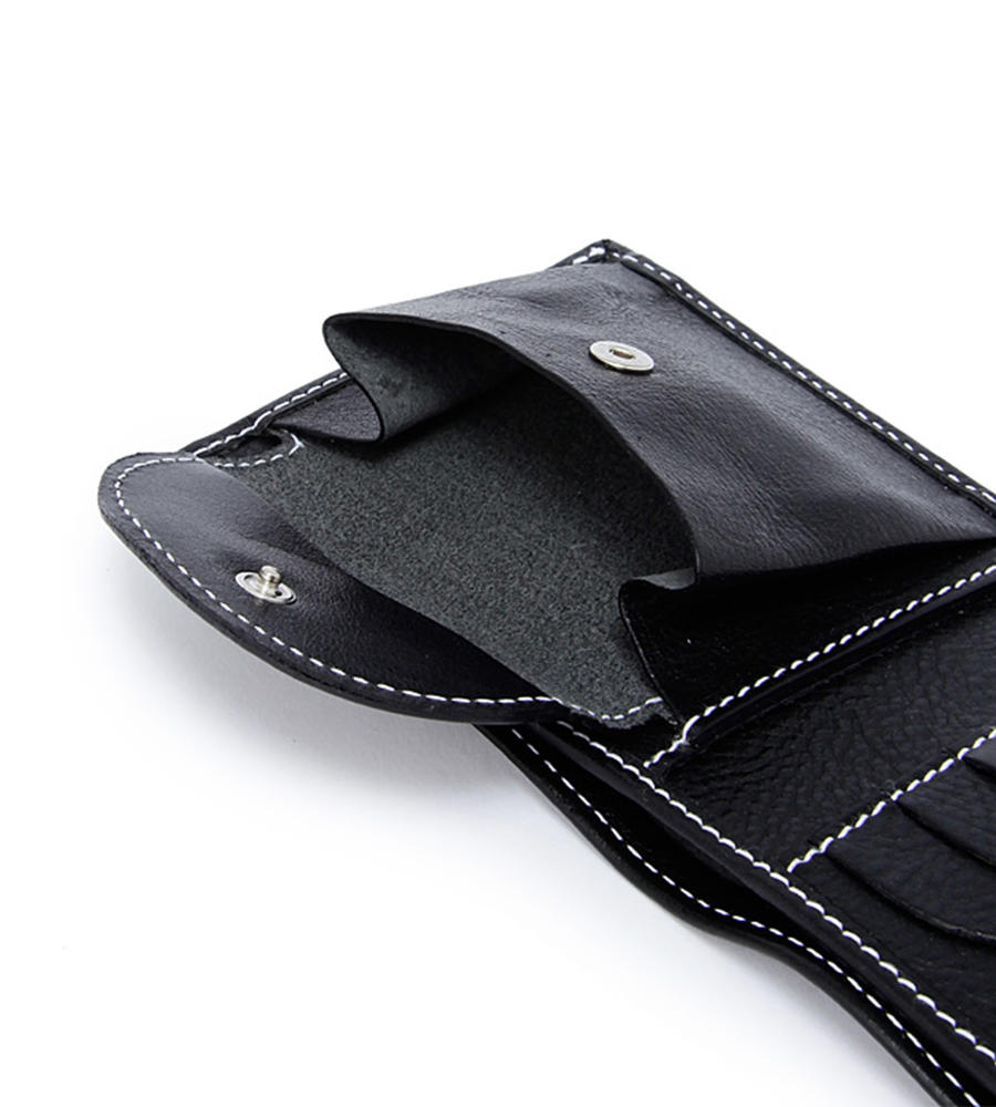 必要な機能をすっきりコンパクトに配置した二つ折りウォレット。ポケットでかさばらないよう薄型で実用的なデザインです。ブラックにホワイトステッチを効かせたクールなルックスで男性に人気のアイテムです。