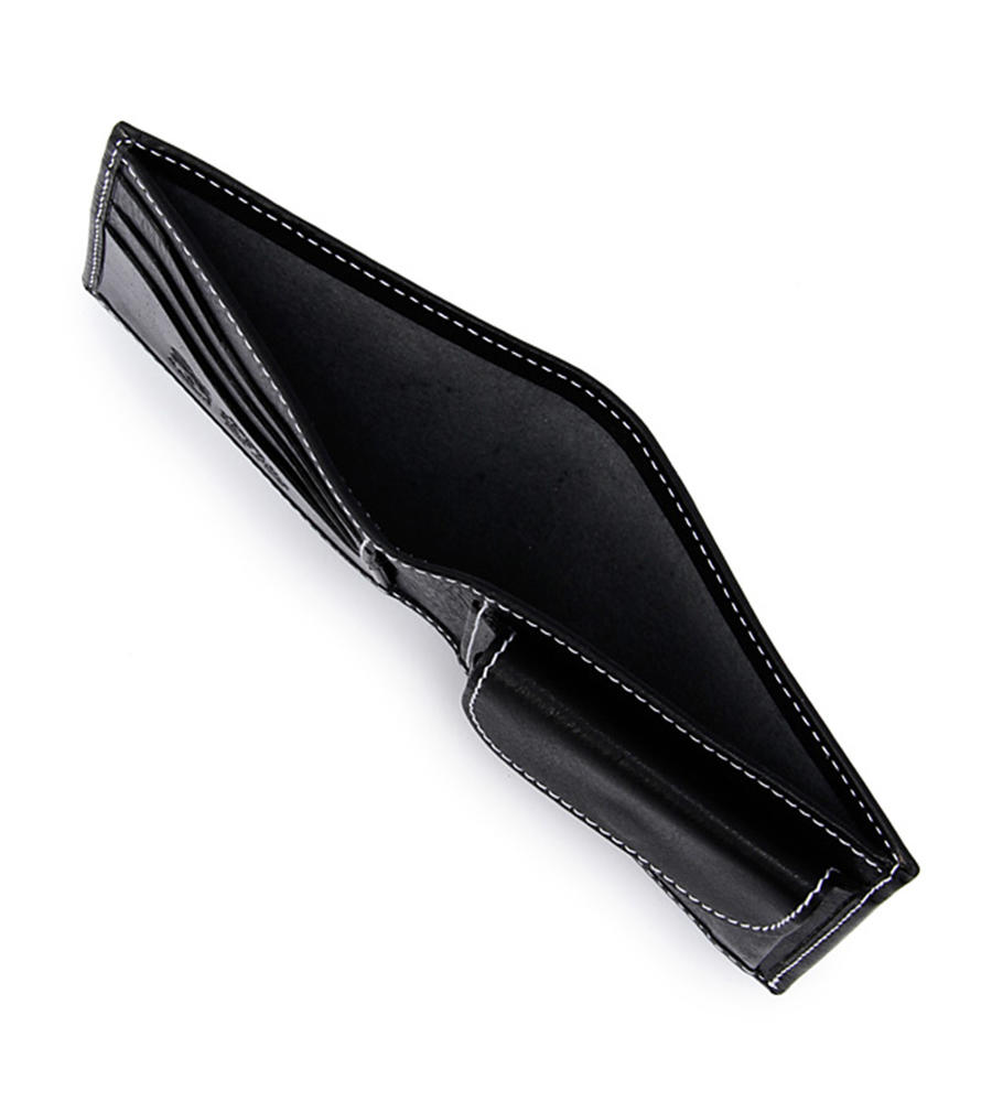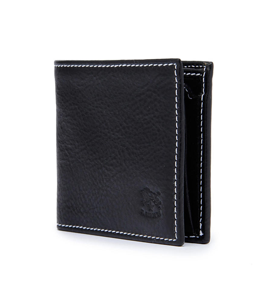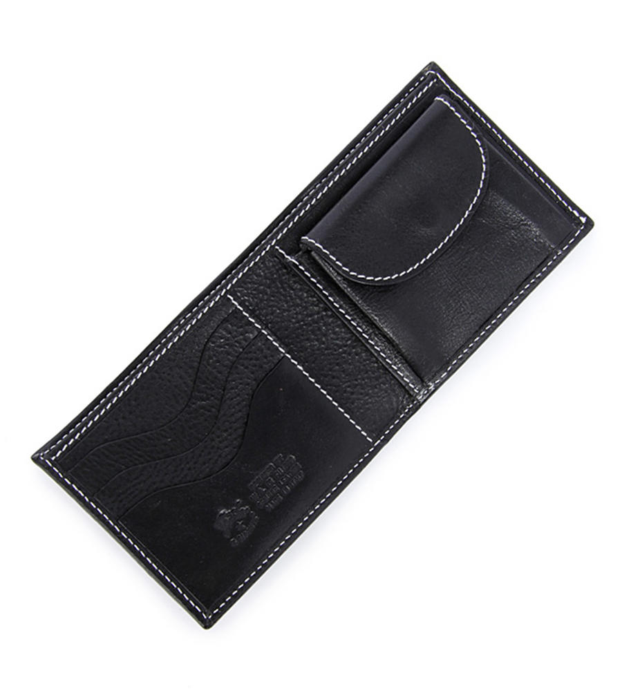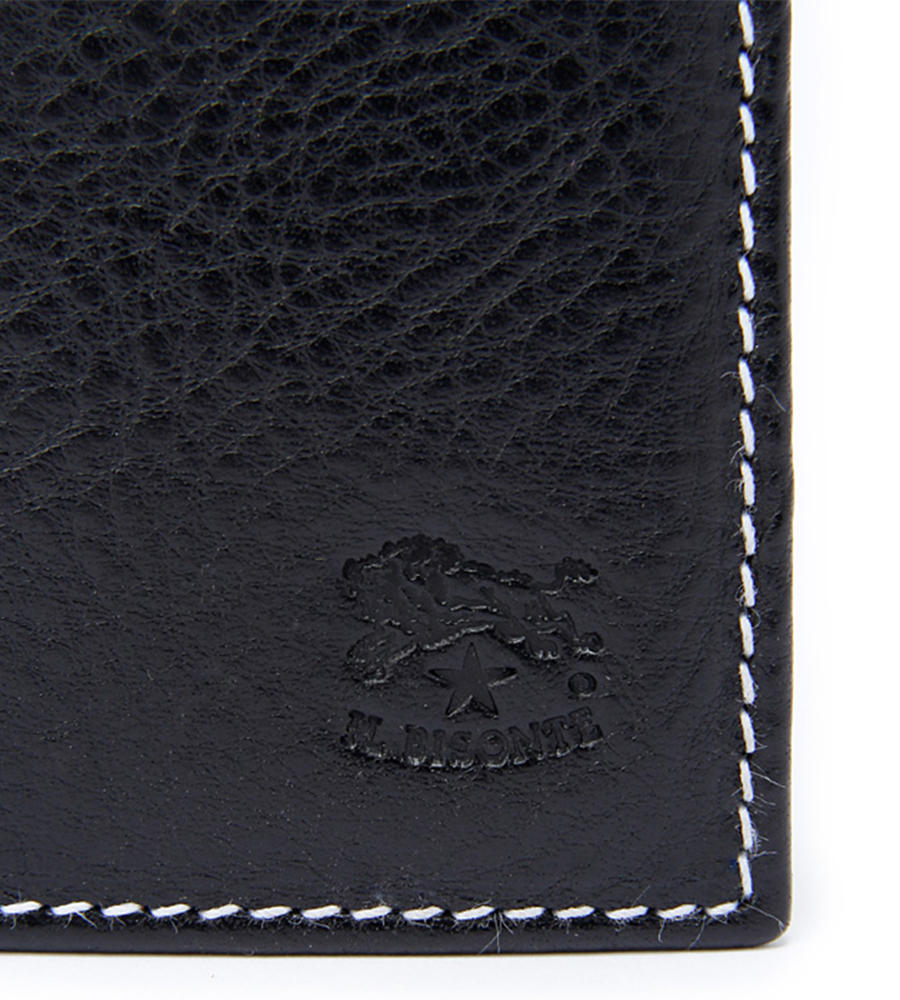 必要な機能をすっきりコンパクトに配置した二つ折りウォレット。ポケットでかさばらないよう薄型で実用的なデザインです。ブラックにホワイトステッチを効かせたクールなルックスで男性に人気のアイテムです。