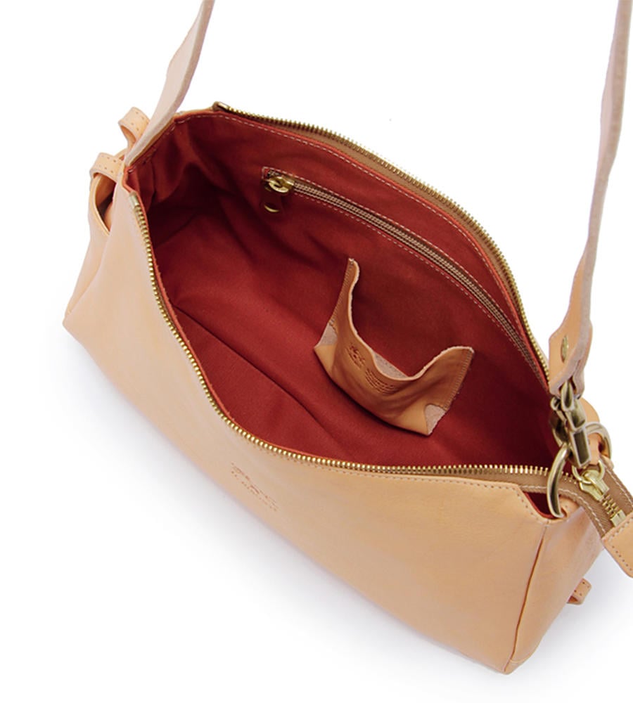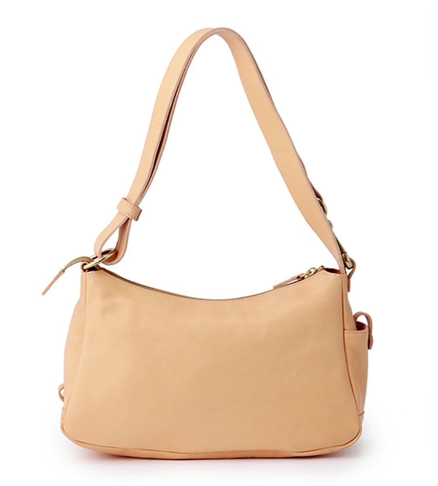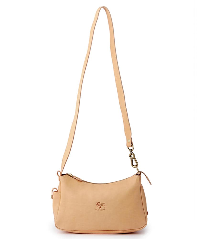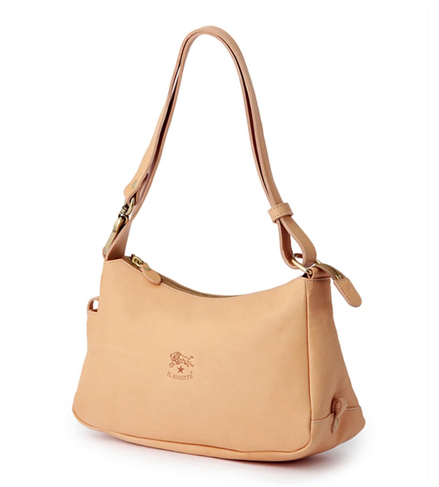 イルビゾンテが誇る上質レザーを用いてショルダーバッグを作りました。脇にすっぽり収まるジャストサイズで、デイリー使いにぴったりです。ショルダーの長さをロングにすることもできるので、肩掛けもできる2WAY仕様。内側にはファスナーポケットのほか携帯電話用の大きめポケットも配備しています。自分で使い込み風合いを楽しむヌメ、すでに使い込んだ印象が手に入るヤケヌメの2タイプを用意。