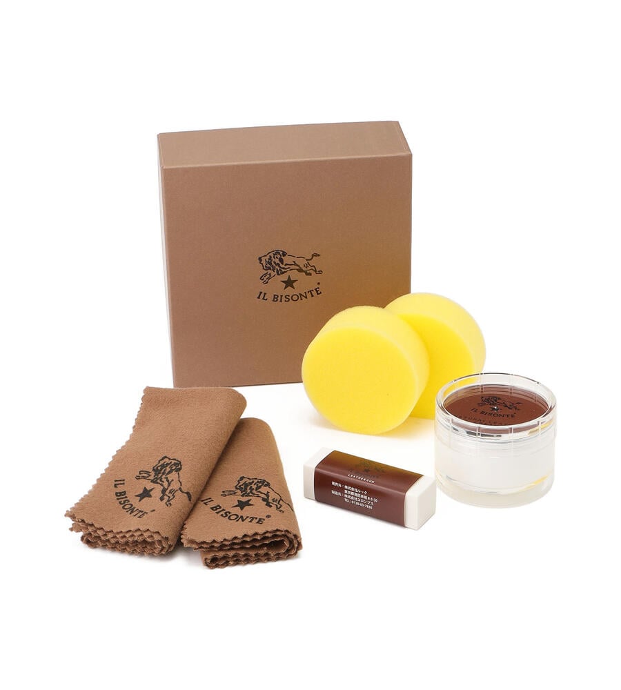 レザークリーム・汚れ落としのレザーガム・クロス2枚・スポンジ2個がセットになった、IL BISONTEテオリジナルのケアクリームセット。ギフトにもおすすめの商品です。