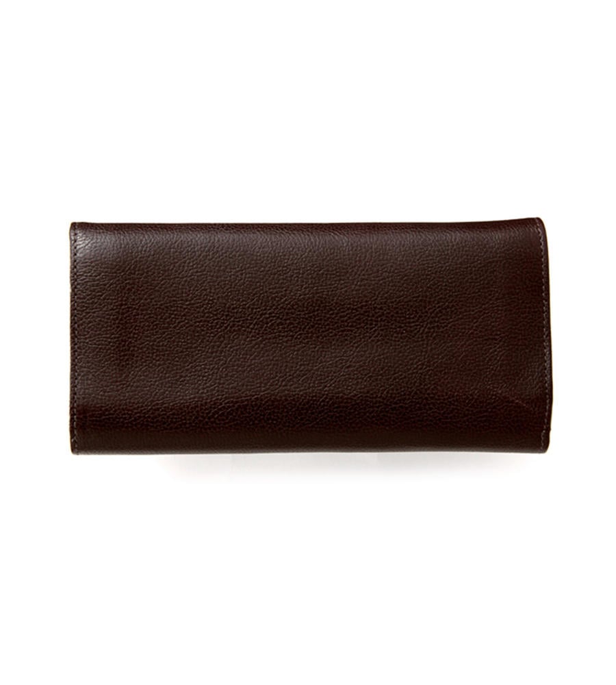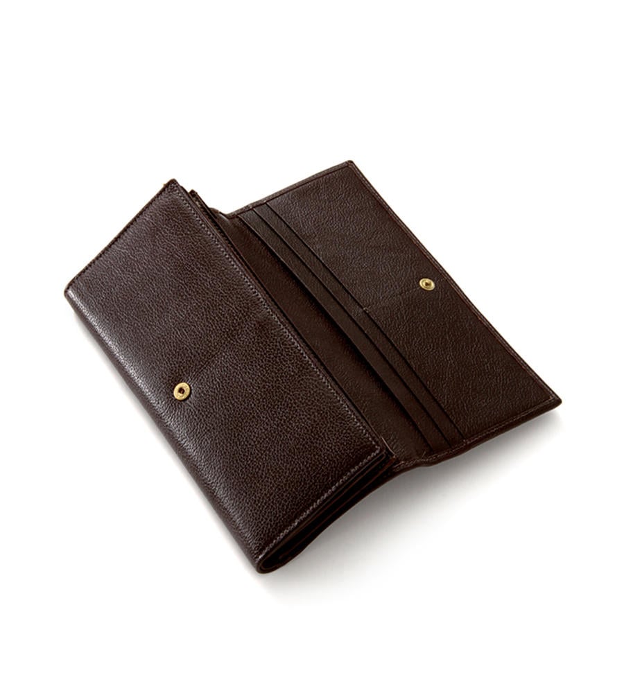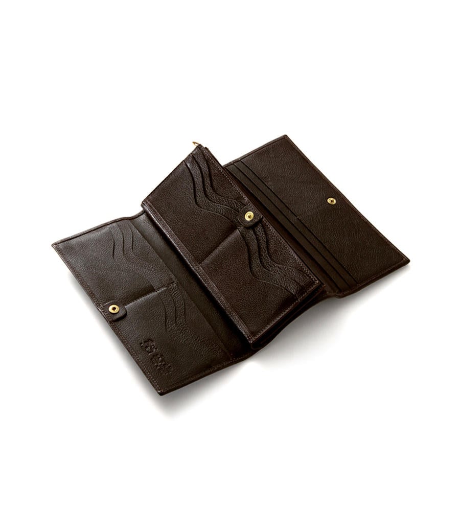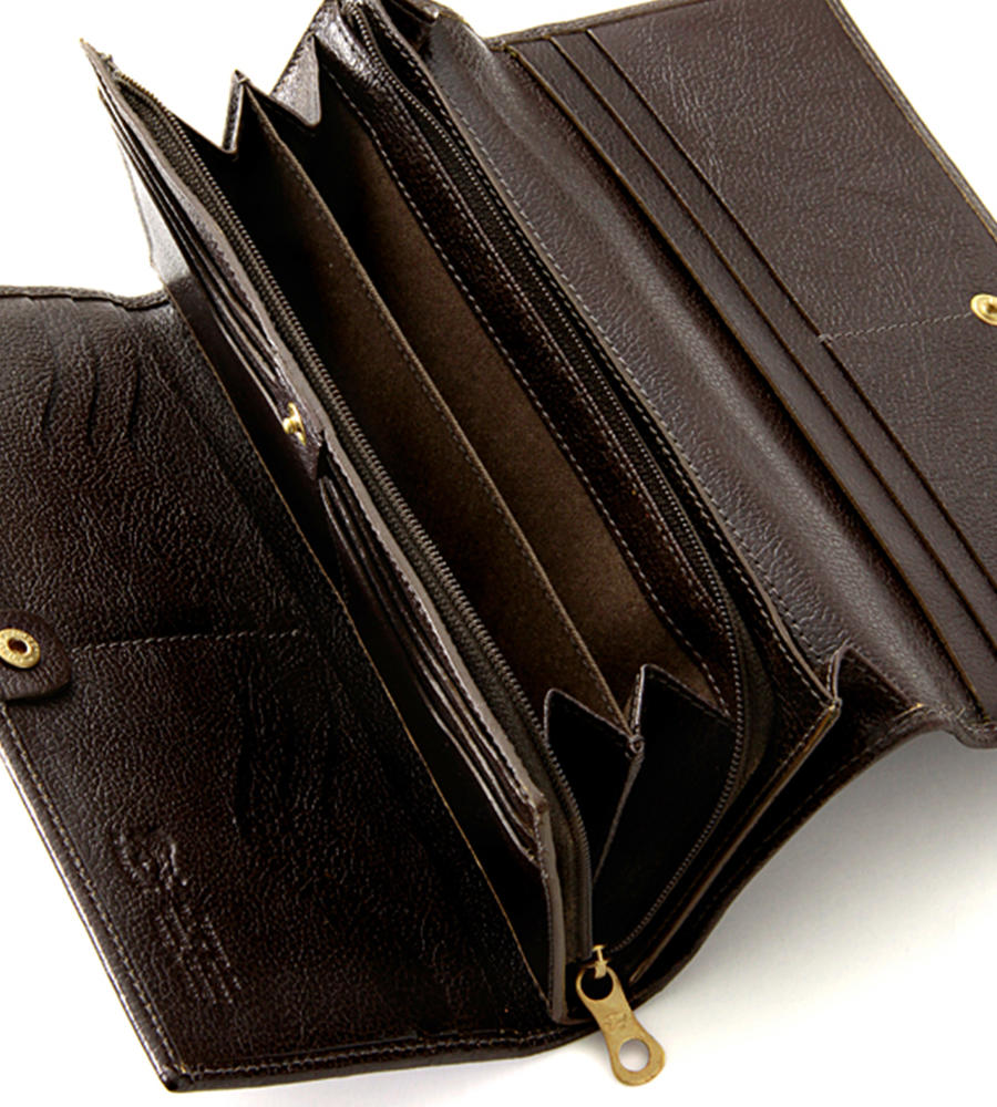 大容量のレザーロングウォレットです。フラップを開けるだけで、お札とコインがたっぷり収納可能なじゃばら式ポケットが。さらに、スナップボタンを開けると14のカードポケットと札入れサイズのポケットが4つあり、機能的で収納力の高いアイテムです。