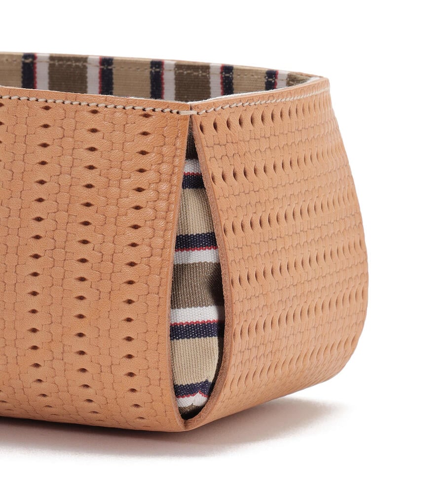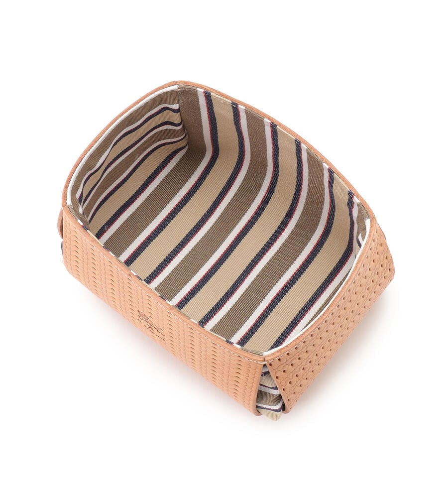 イタリアらしいマルチボーダー柄がチラリとのぞく、小粋なバスケットの登場。上質のカウレザーは、だんだん味が出て来て愛着が湧きそうです。小ぶりのサイズ感なので、玄関やリビングに置いて鍵や時計などを収納するのにお役立ち。フロントにあしらったブランドロゴが、全体の引き締め役となっています。