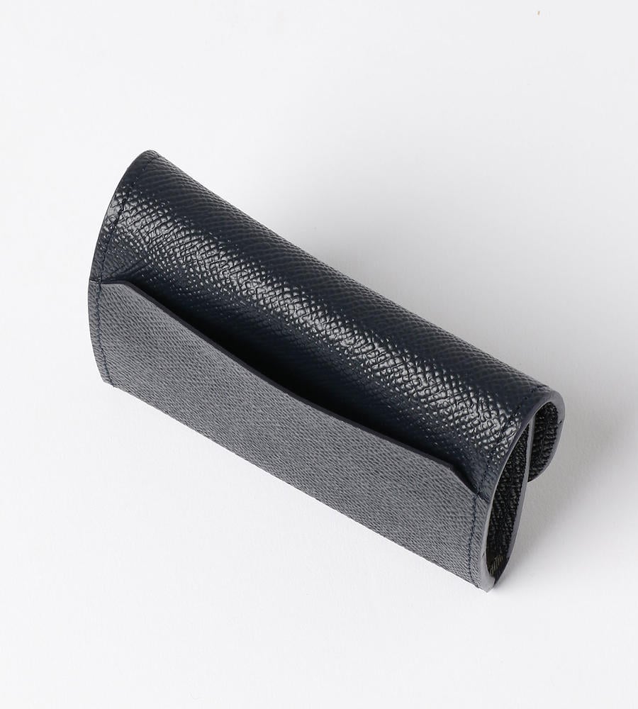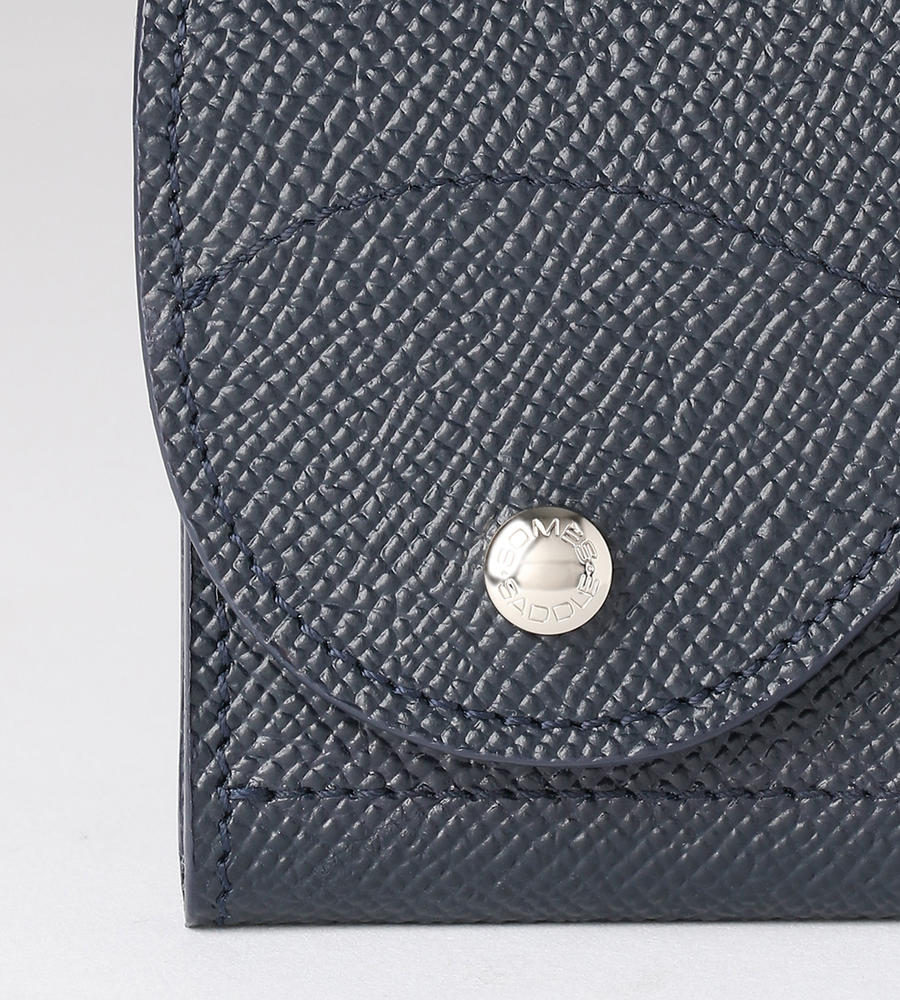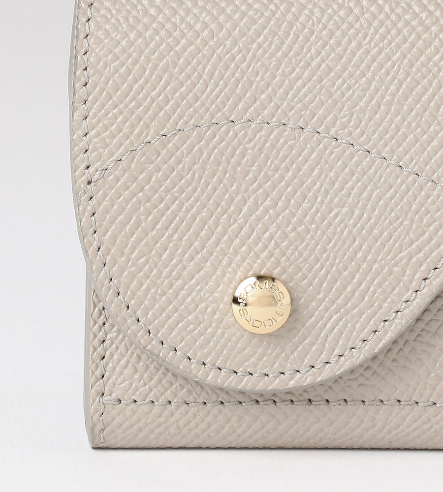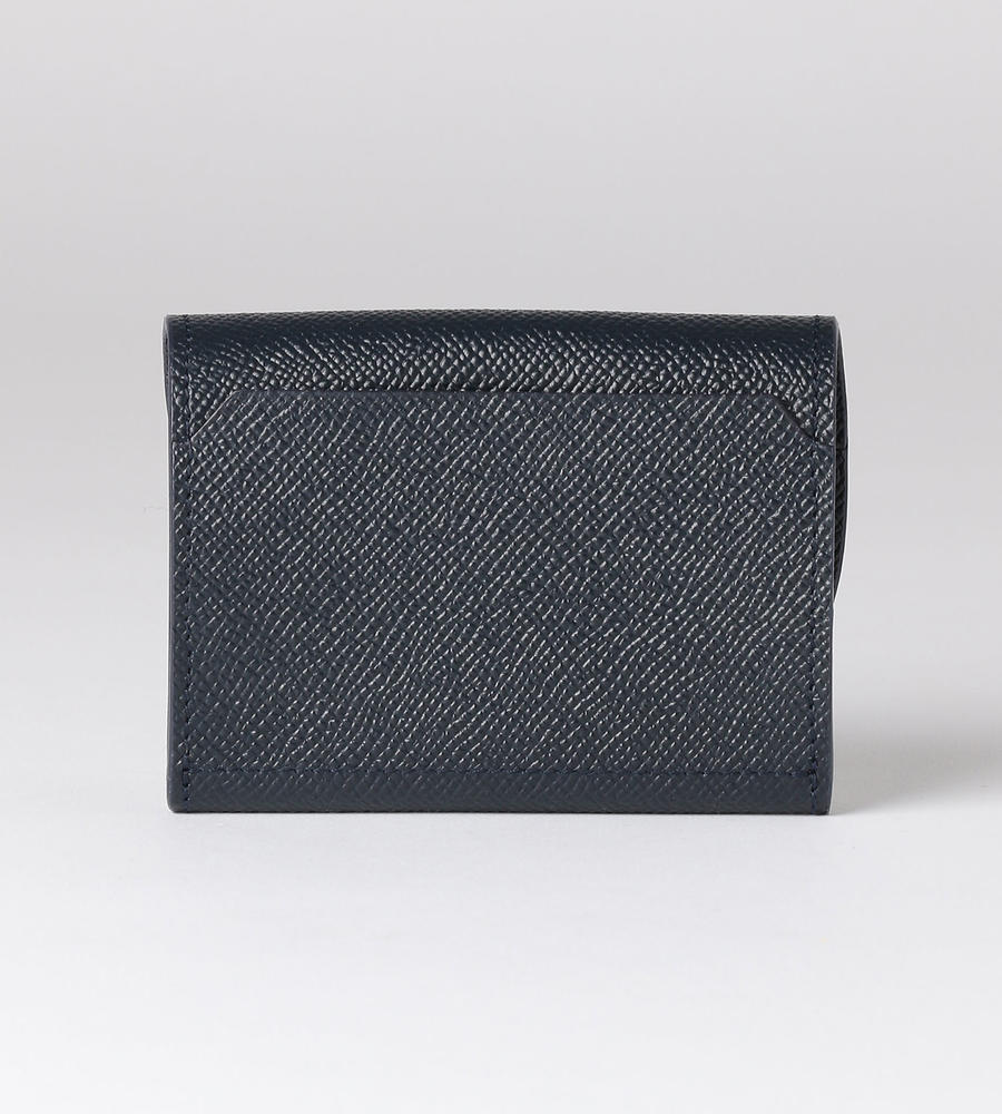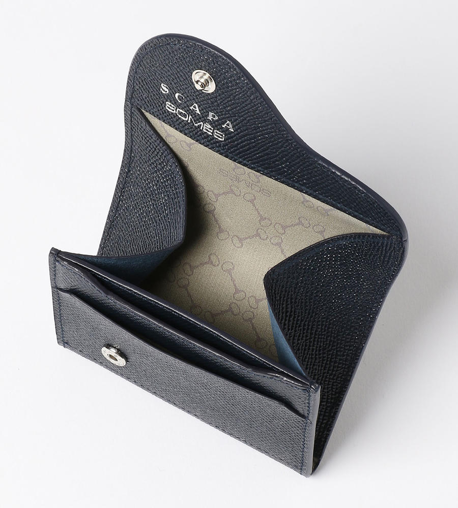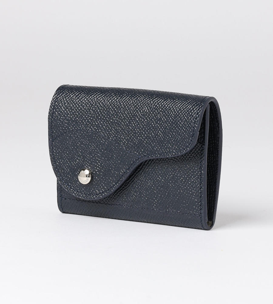 曲線が美しいフラップタイプの型押しレザーウォレット。シンプルでエレガントなルックス、コンパクトなサイズ感が今の気分にぴったり。外側裏にはスリットポケットを配置。キラリと輝くスナップボタンを開けるとコイン収納スペースとカードホルダーが備えられています。実用的で洗練された小物はギフトとしてもおすすめに一品。