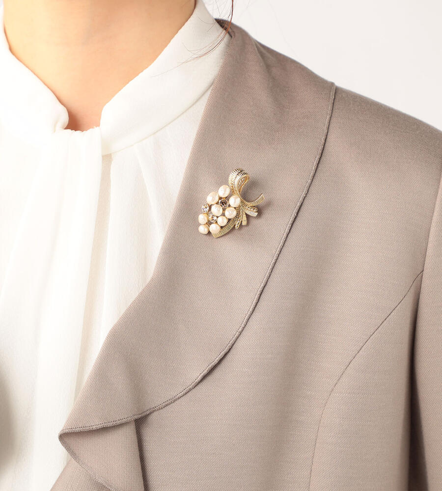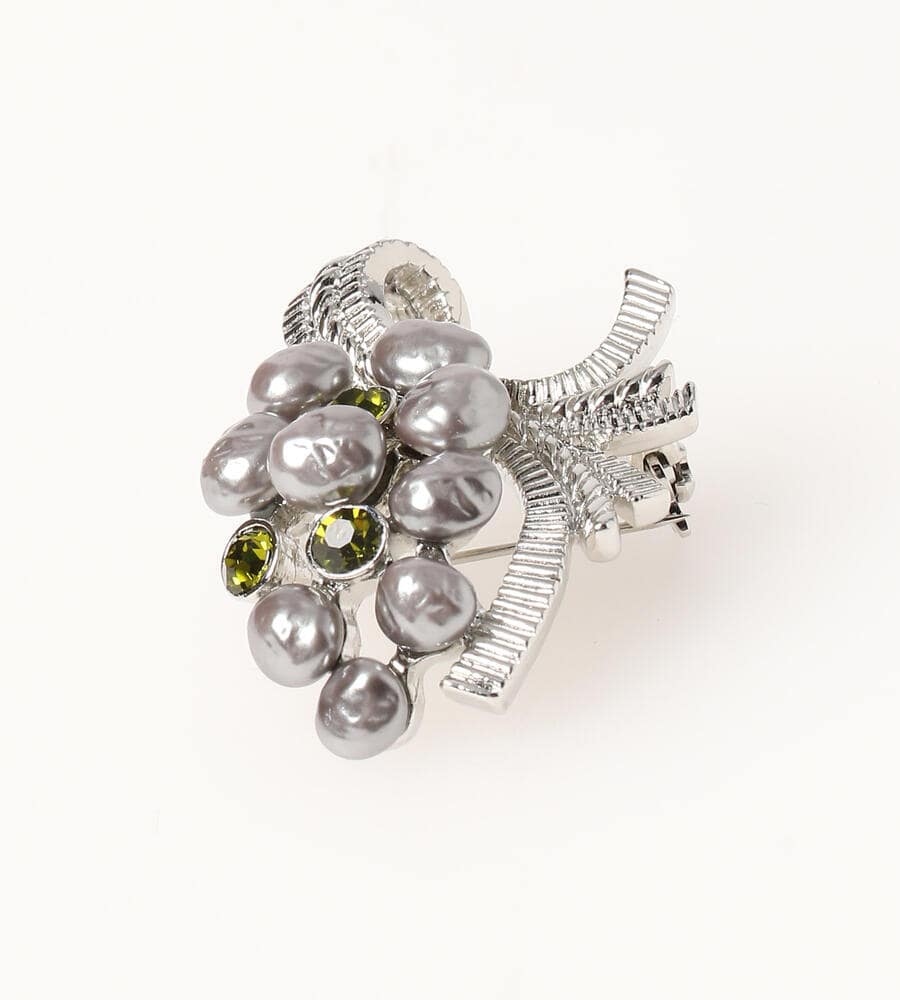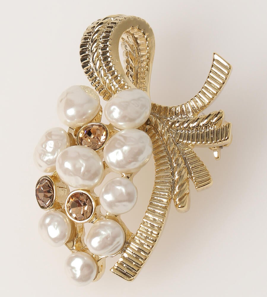 葡萄のようなシルエットが可愛らしい、華やかなブローチ。美しく煌めくメタルパーツに、不揃いなパール&ストーンモチーフをあしらっています。品のある小ぶりなサイズ感なため、お洋服はもちろん、帽子など小物のアクセントにもおすすめ。日常からフォーマルまで様々なシーンに活躍します。