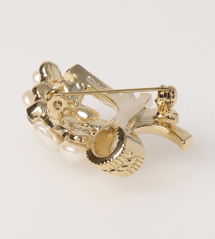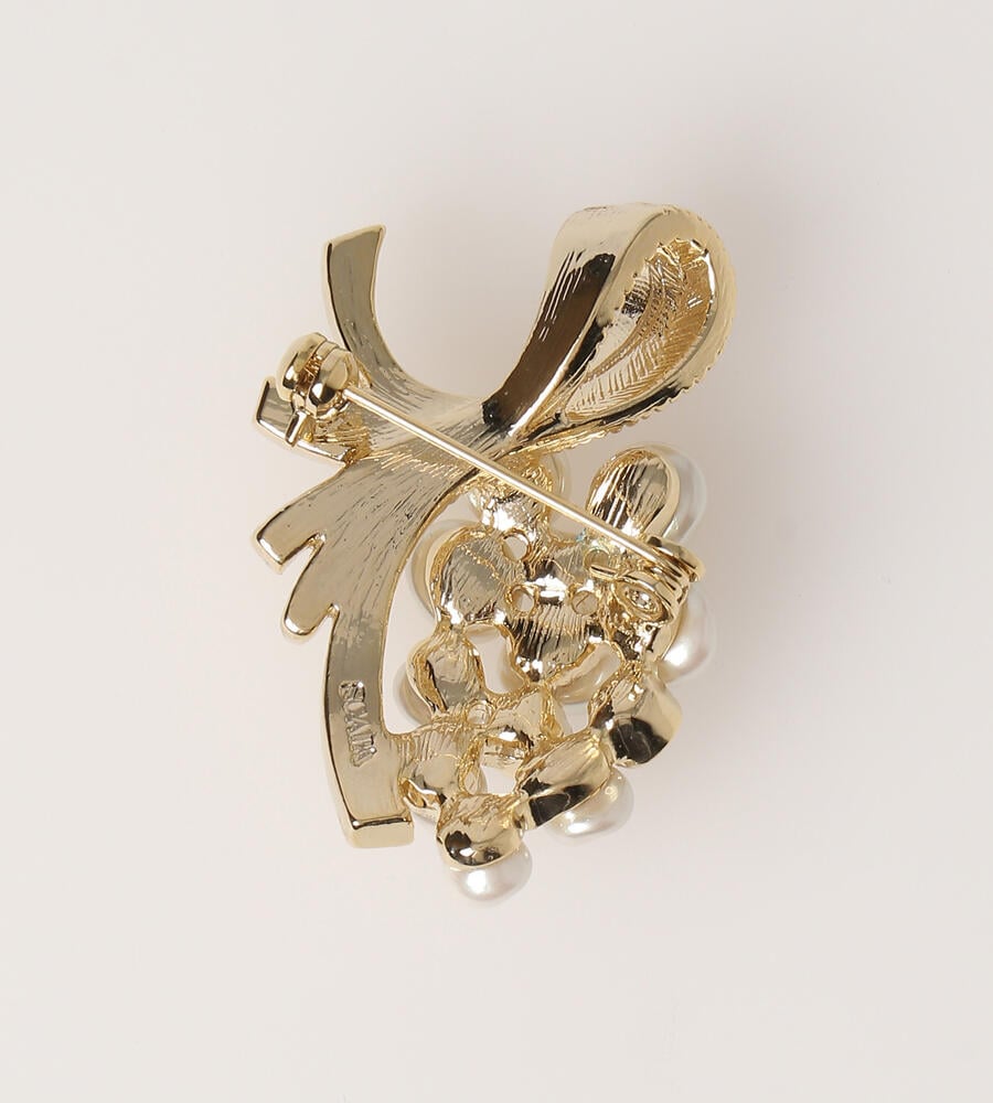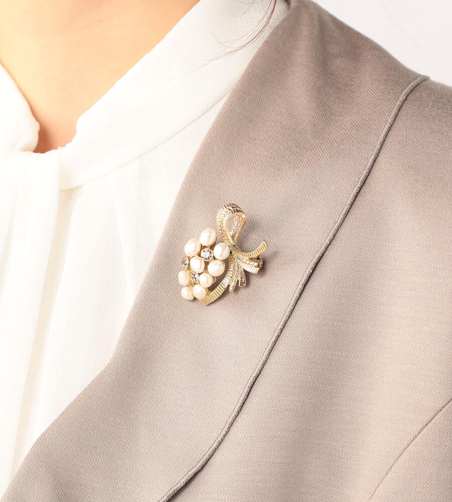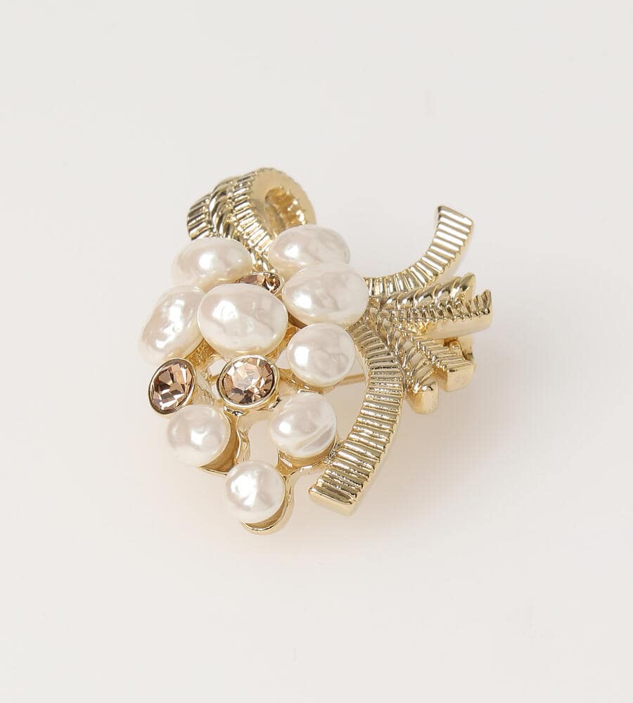 葡萄のようなシルエットが可愛らしい、華やかなブローチ。美しく煌めくメタルパーツに、不揃いなパール&ストーンモチーフをあしらっています。品のある小ぶりなサイズ感なため、お洋服はもちろん、帽子など小物のアクセントにもおすすめ。日常からフォーマルまで様々なシーンに活躍します。