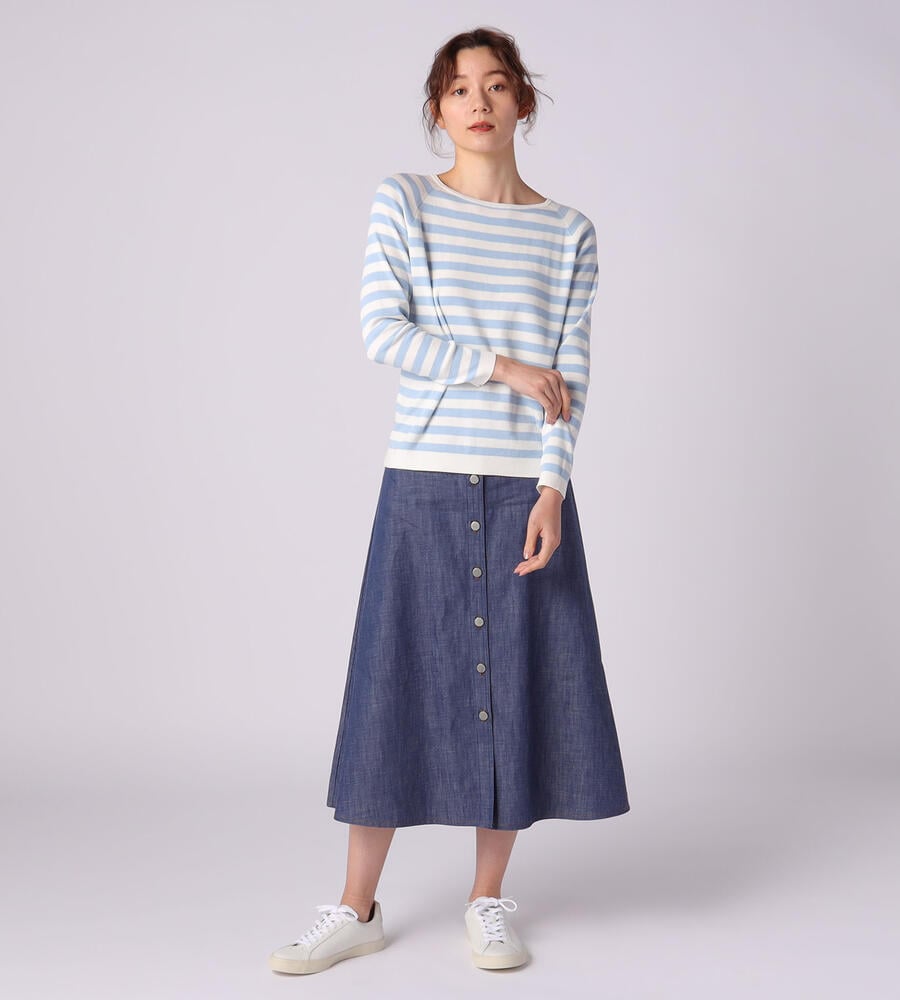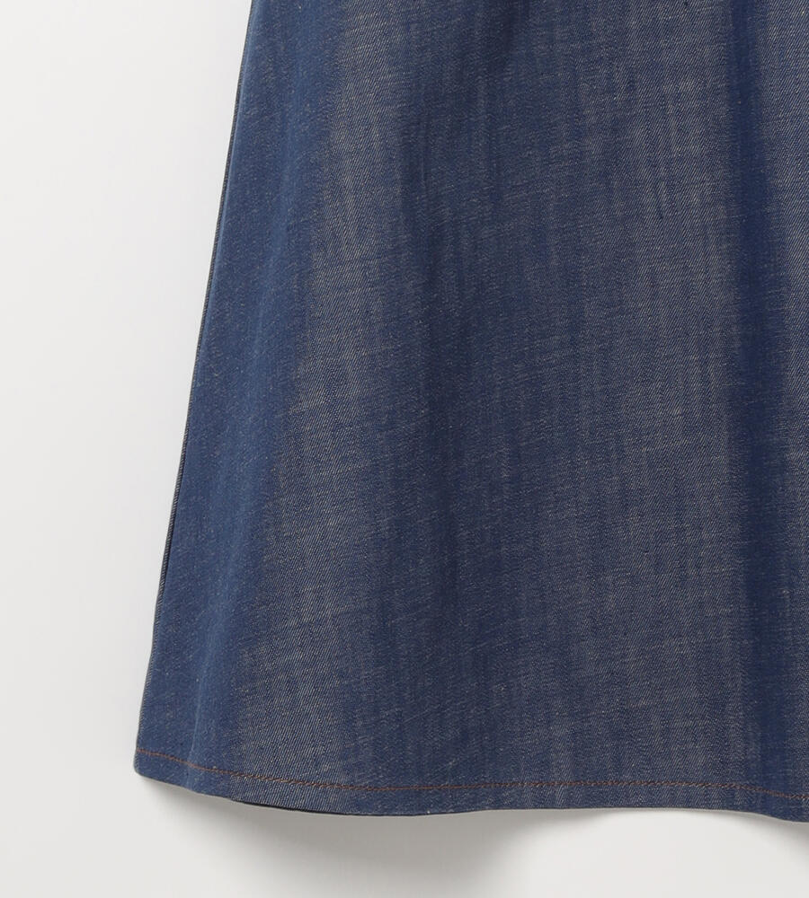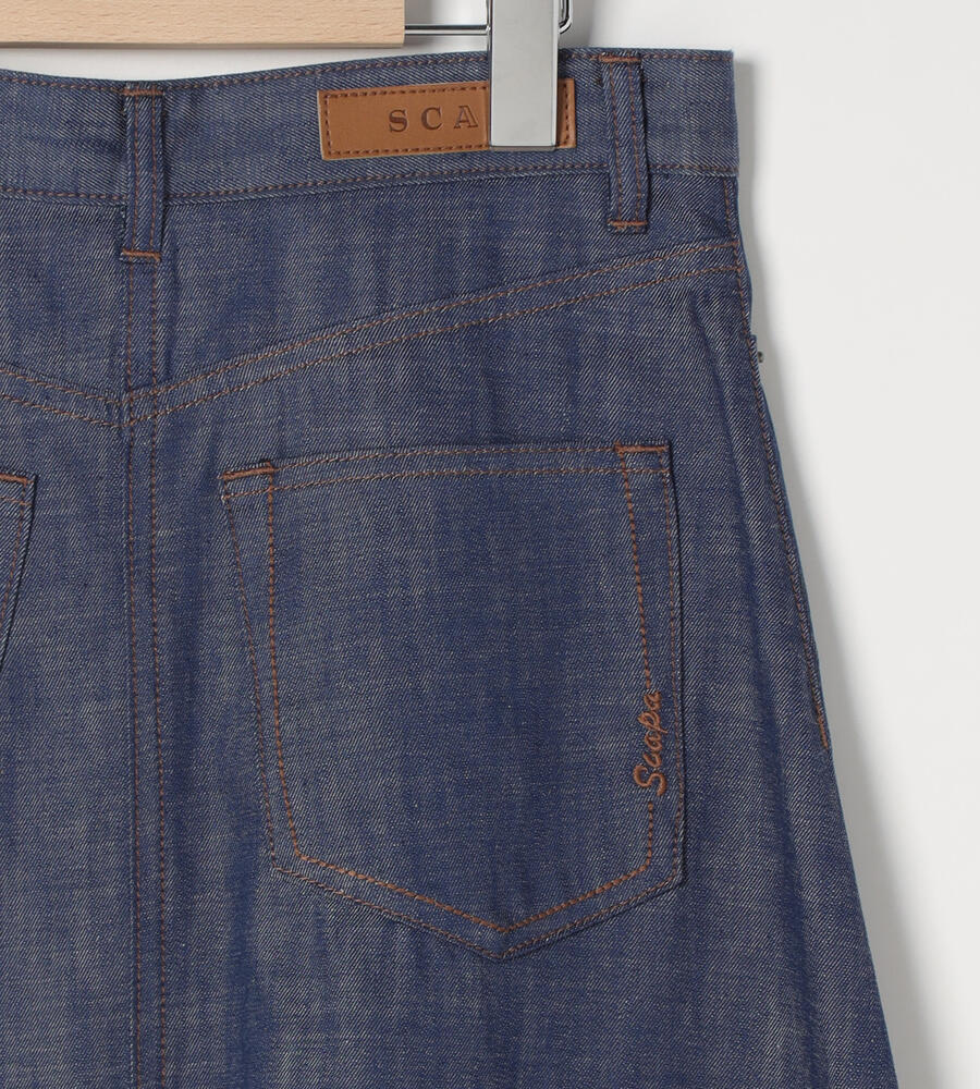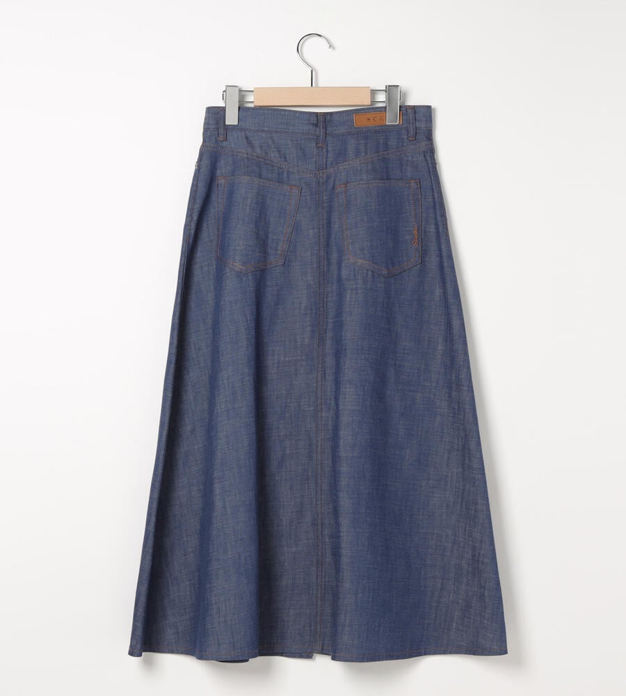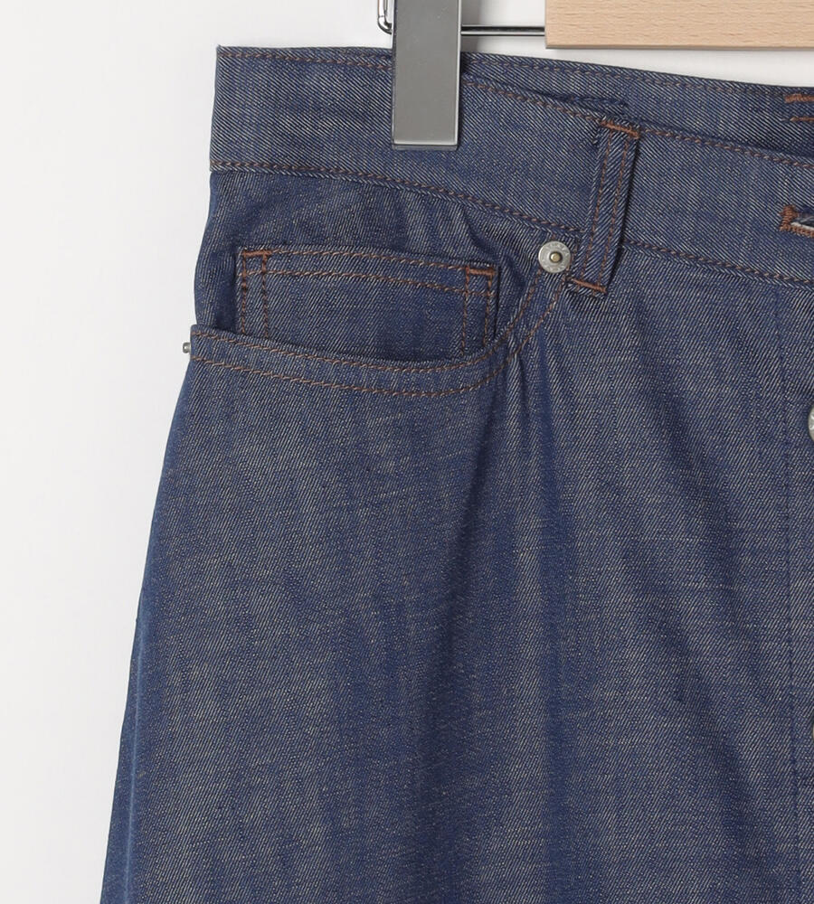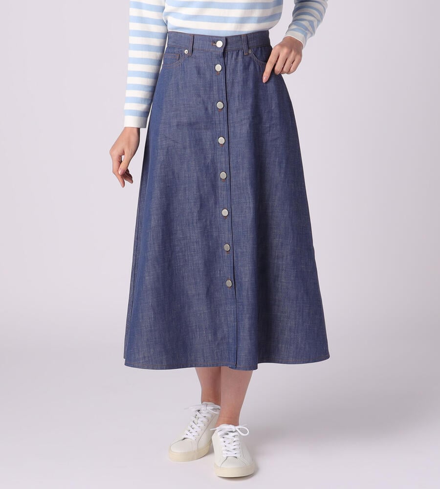 品のよい微光沢感を備えたデニム生地のミモレ丈スカート。フロントボタンときれいに広がるフレアシルエットが、コーディネートを女性らしい印象へと導きます。レザーパッチやバックポケットにはアイコニックなブランドロゴをプラス。カジュアルすぎず、大人の日常スタイルに最適な一枚です。同生地のジャケットとセットアップでも着用可能です。